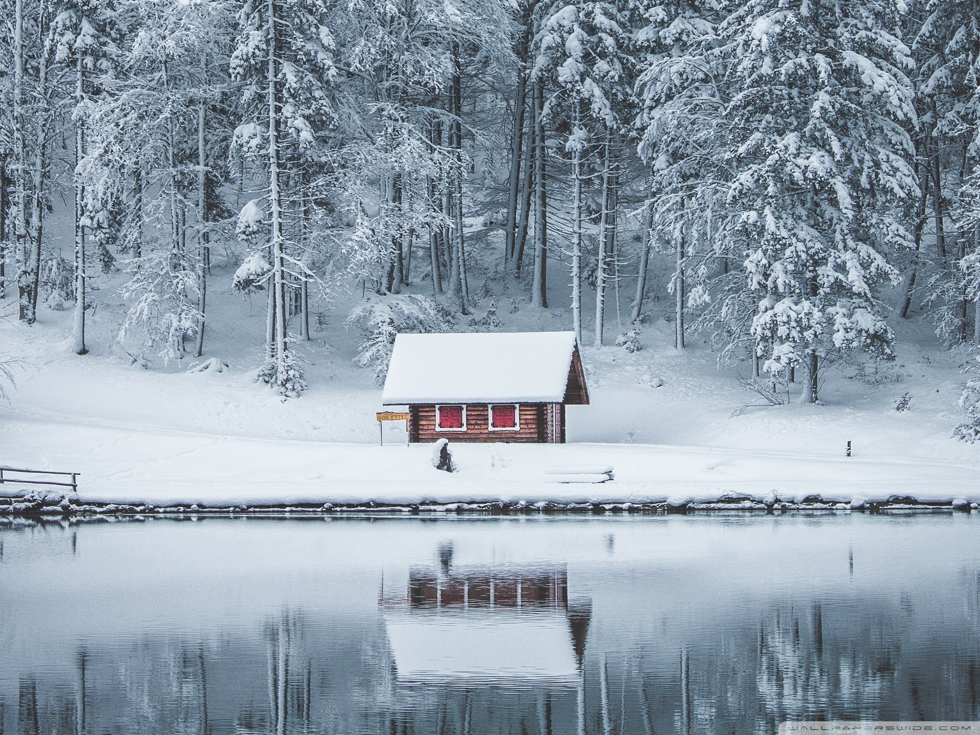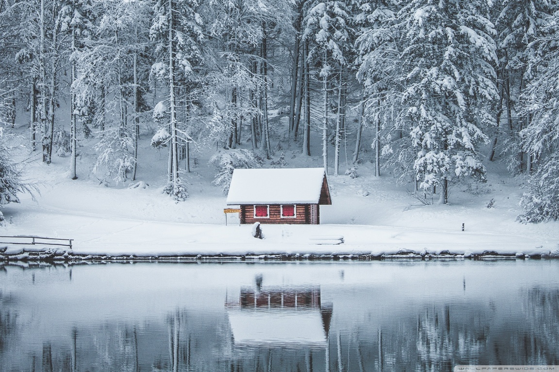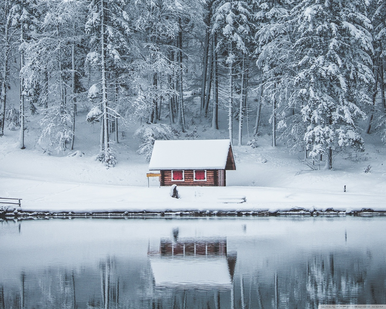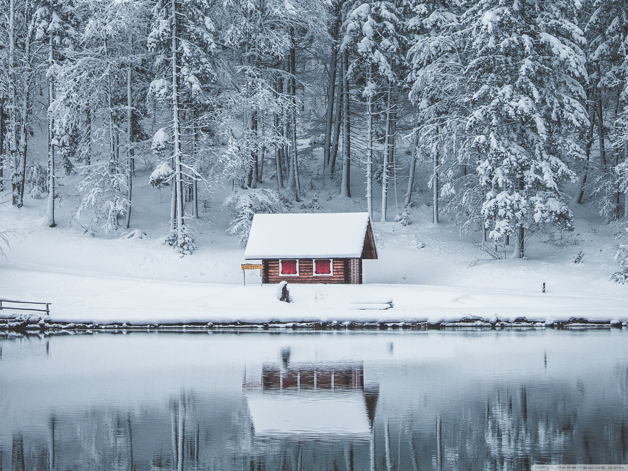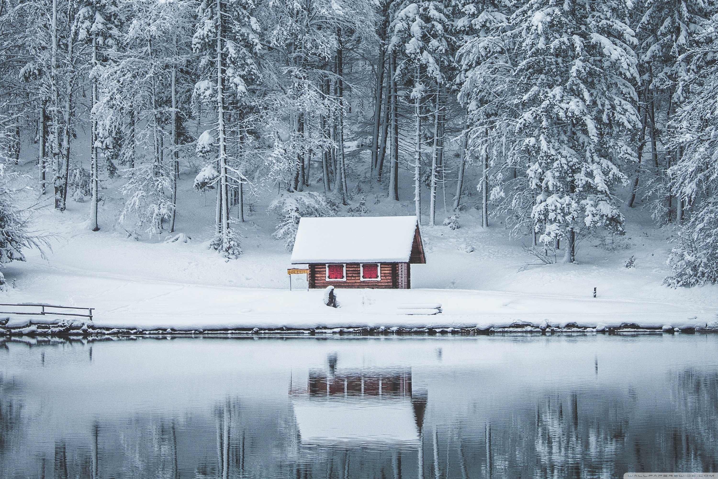 Download Reflection Of Snowy Forest Cabin 4K UHD Wallpaper
