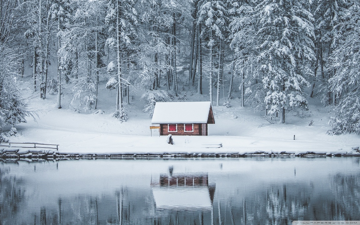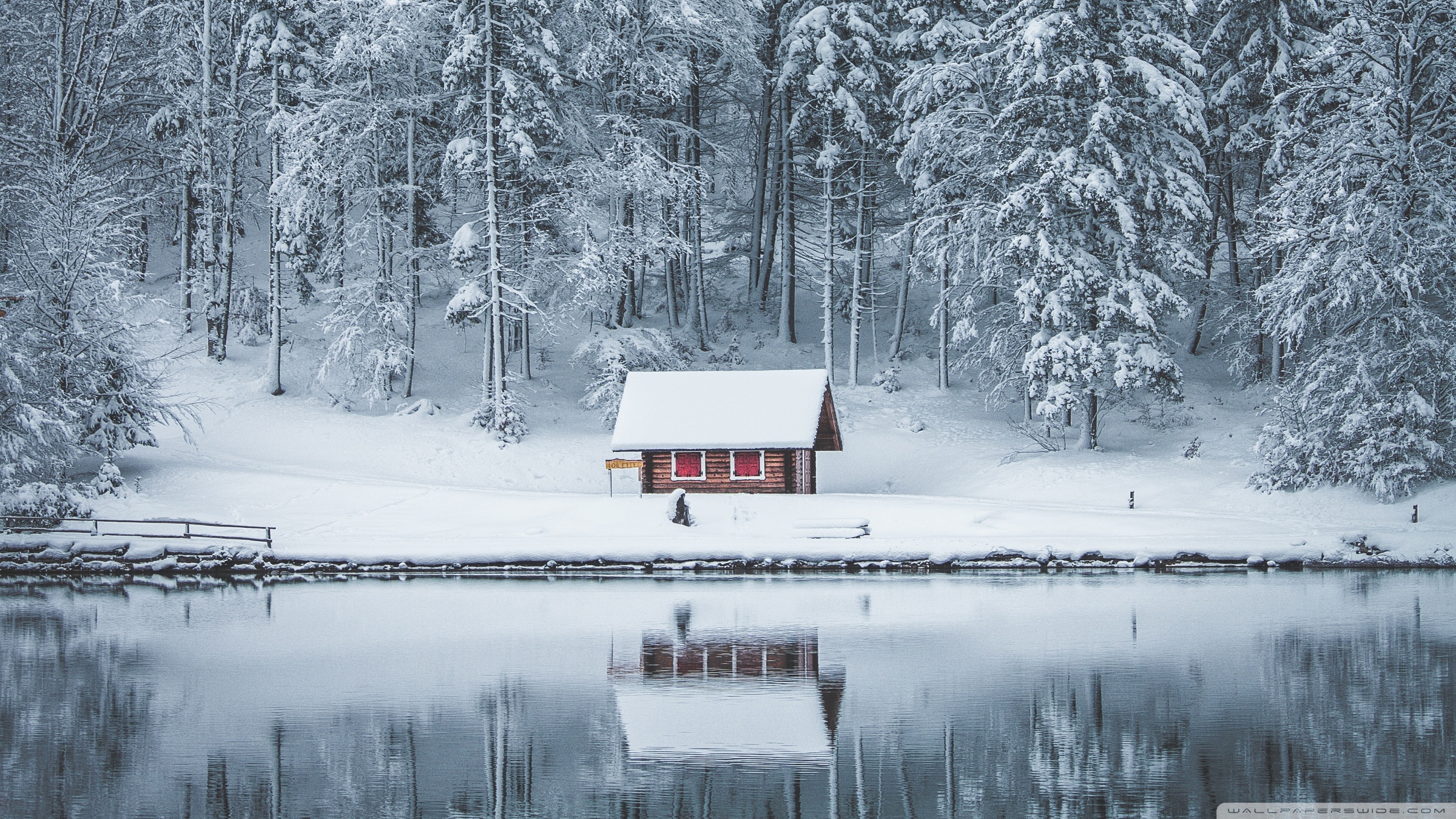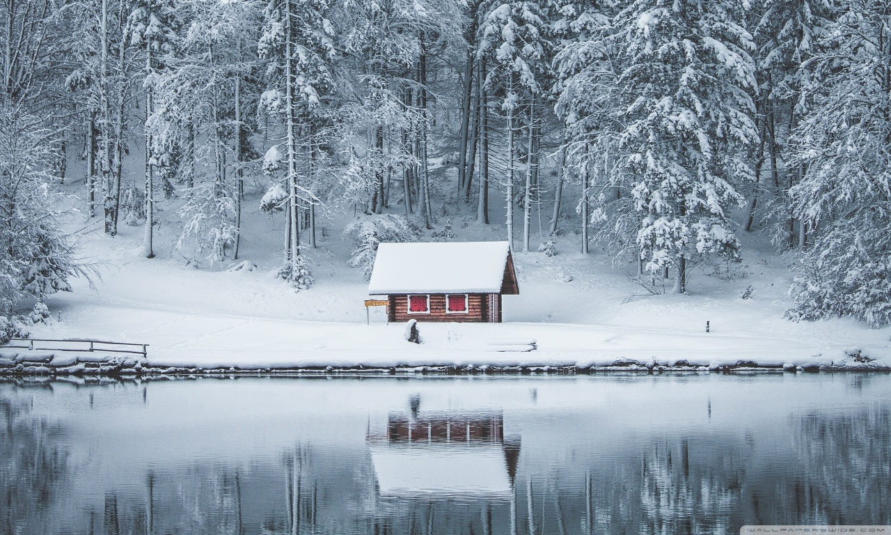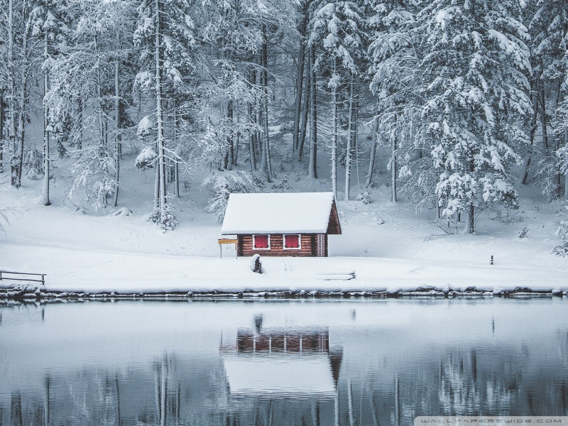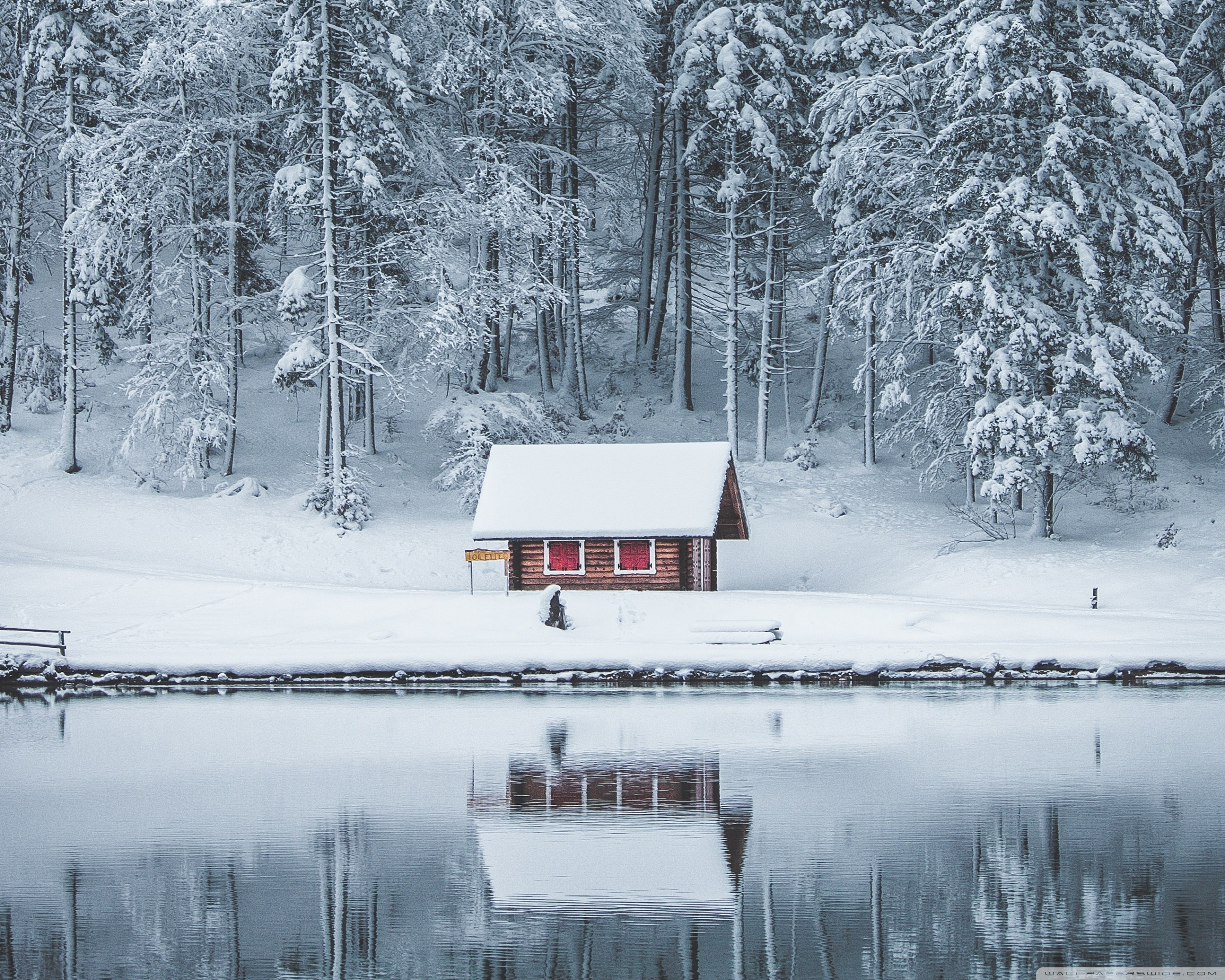 Download Reflection Of Snowy Forest Cabin 4K UHD Wallpaper
