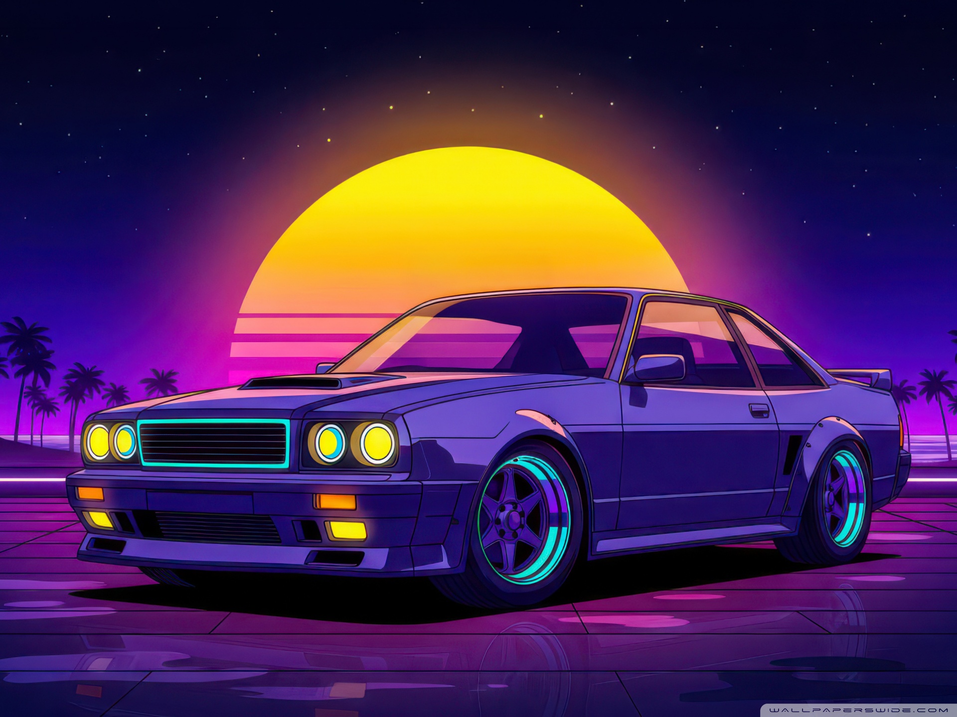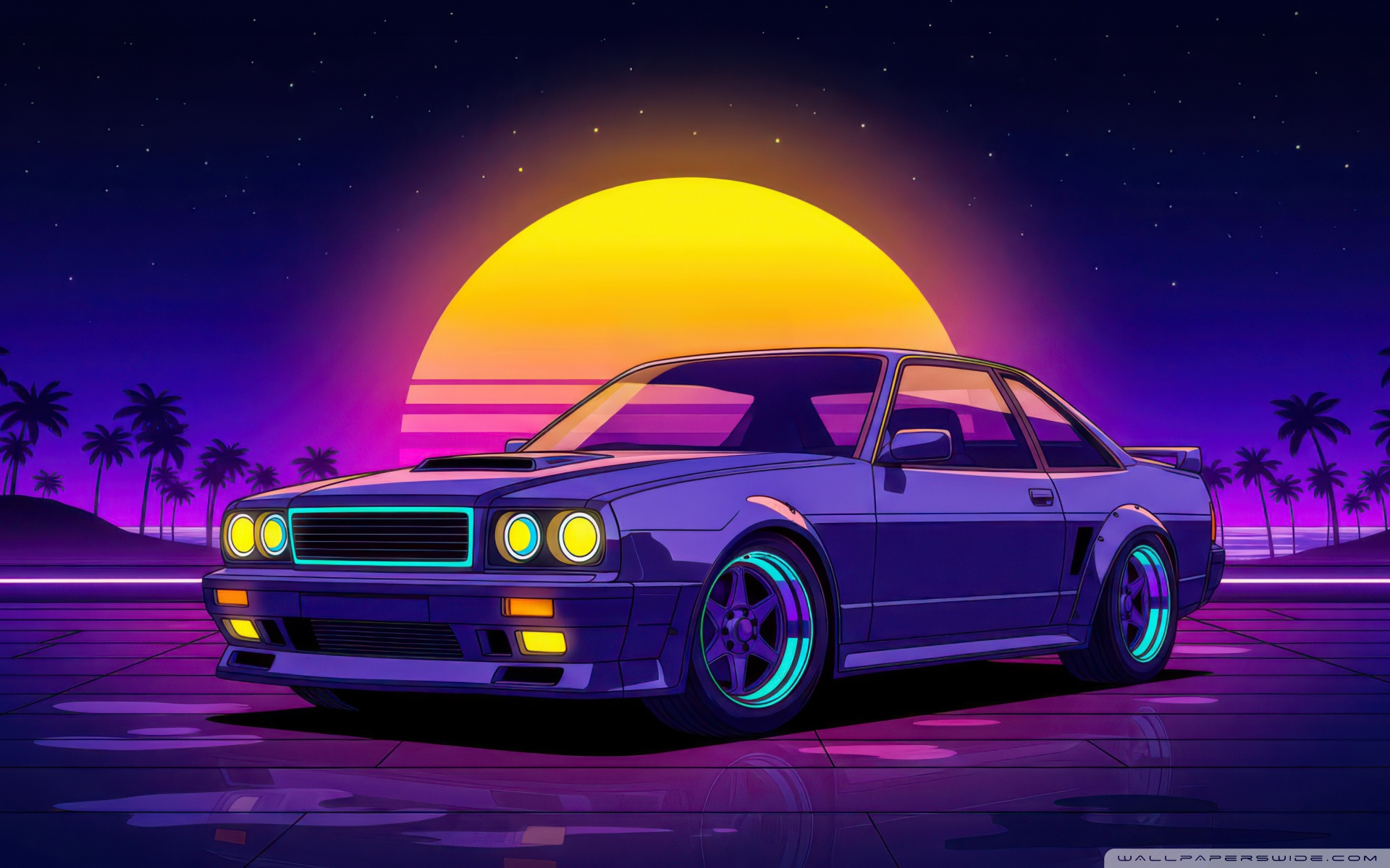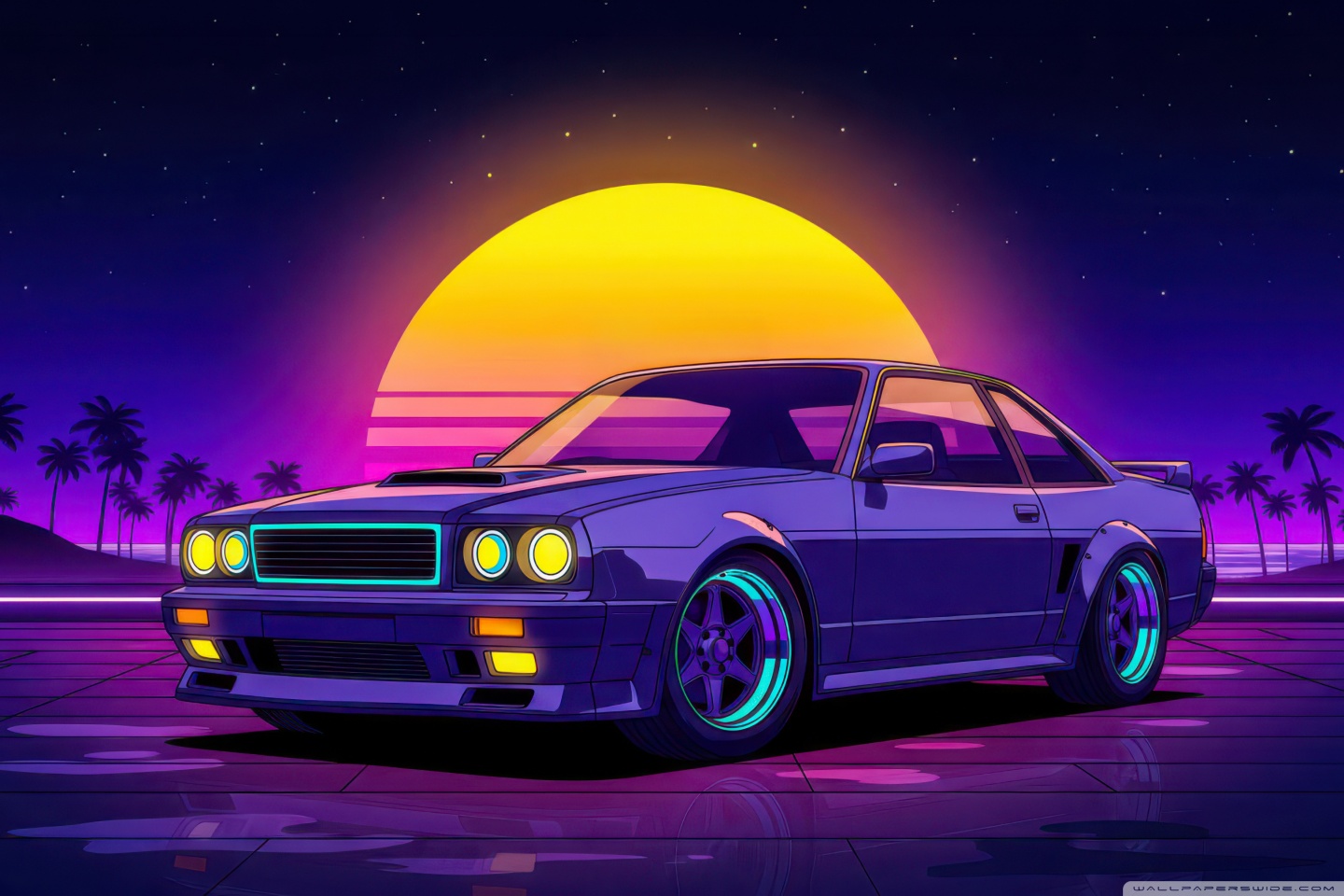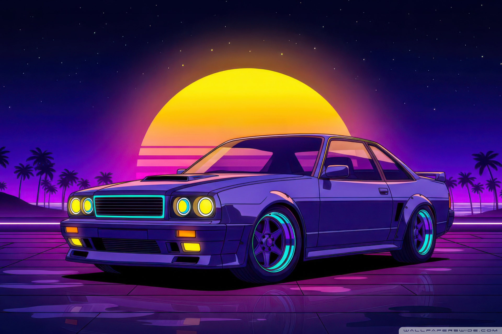 Download Retro Synthwave Car against Sunset 4K UHD Wallpaper