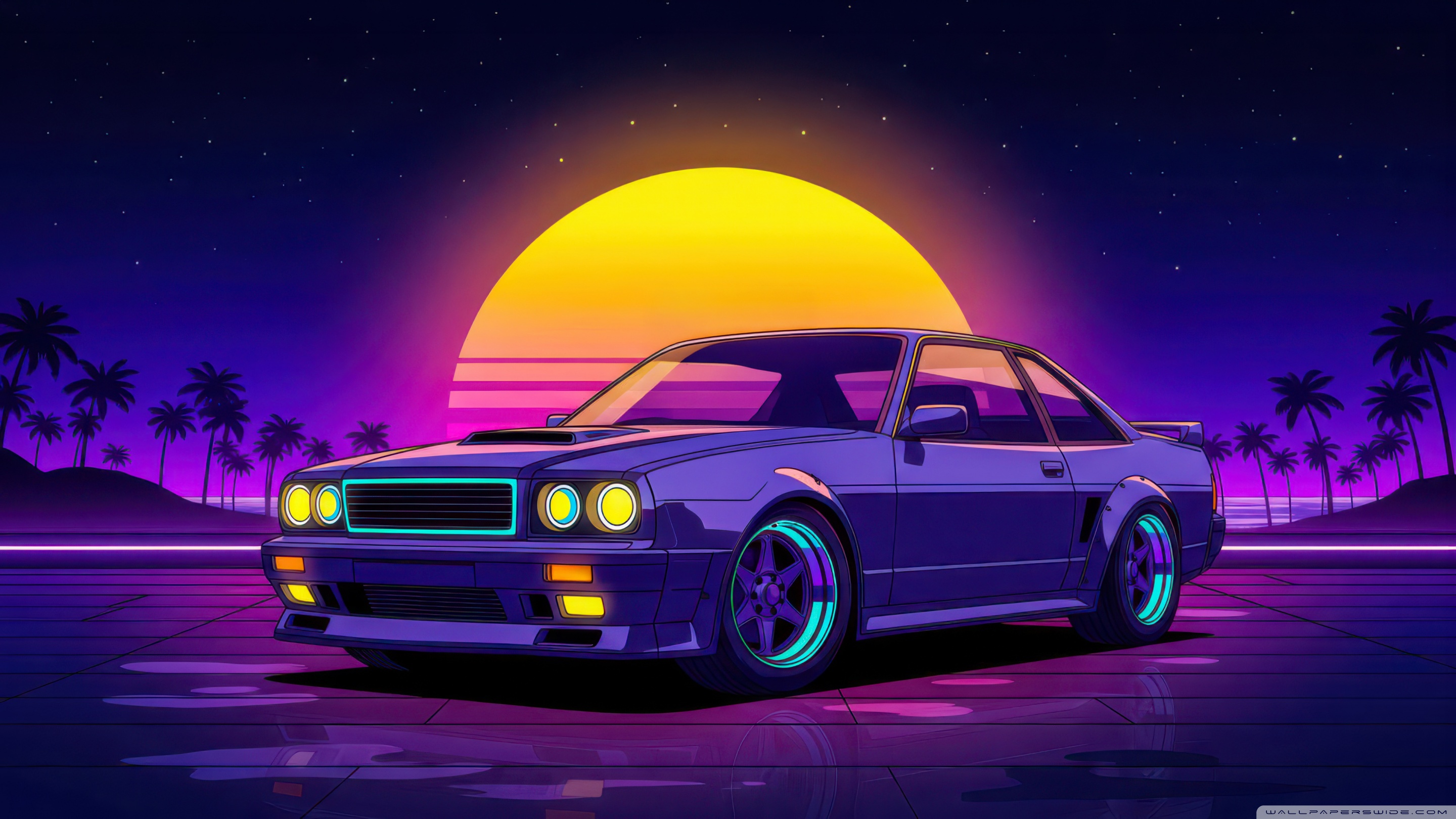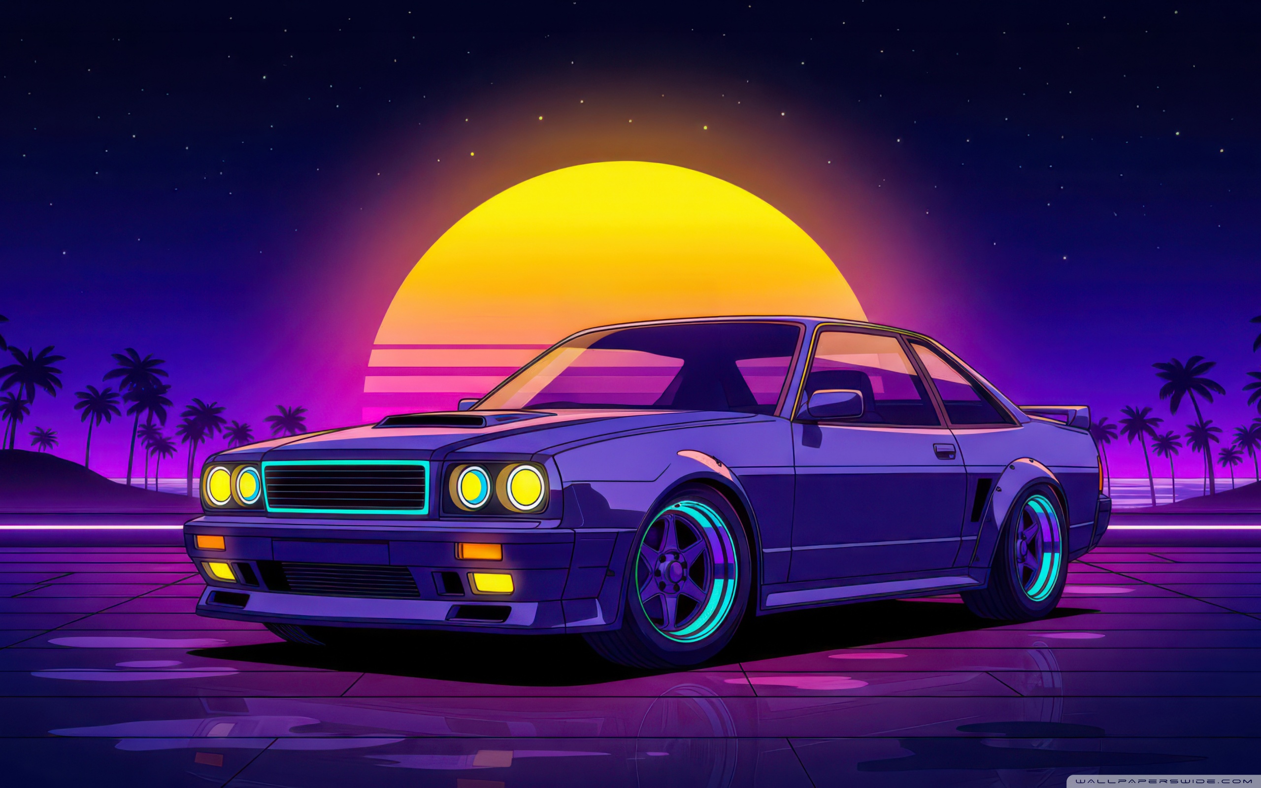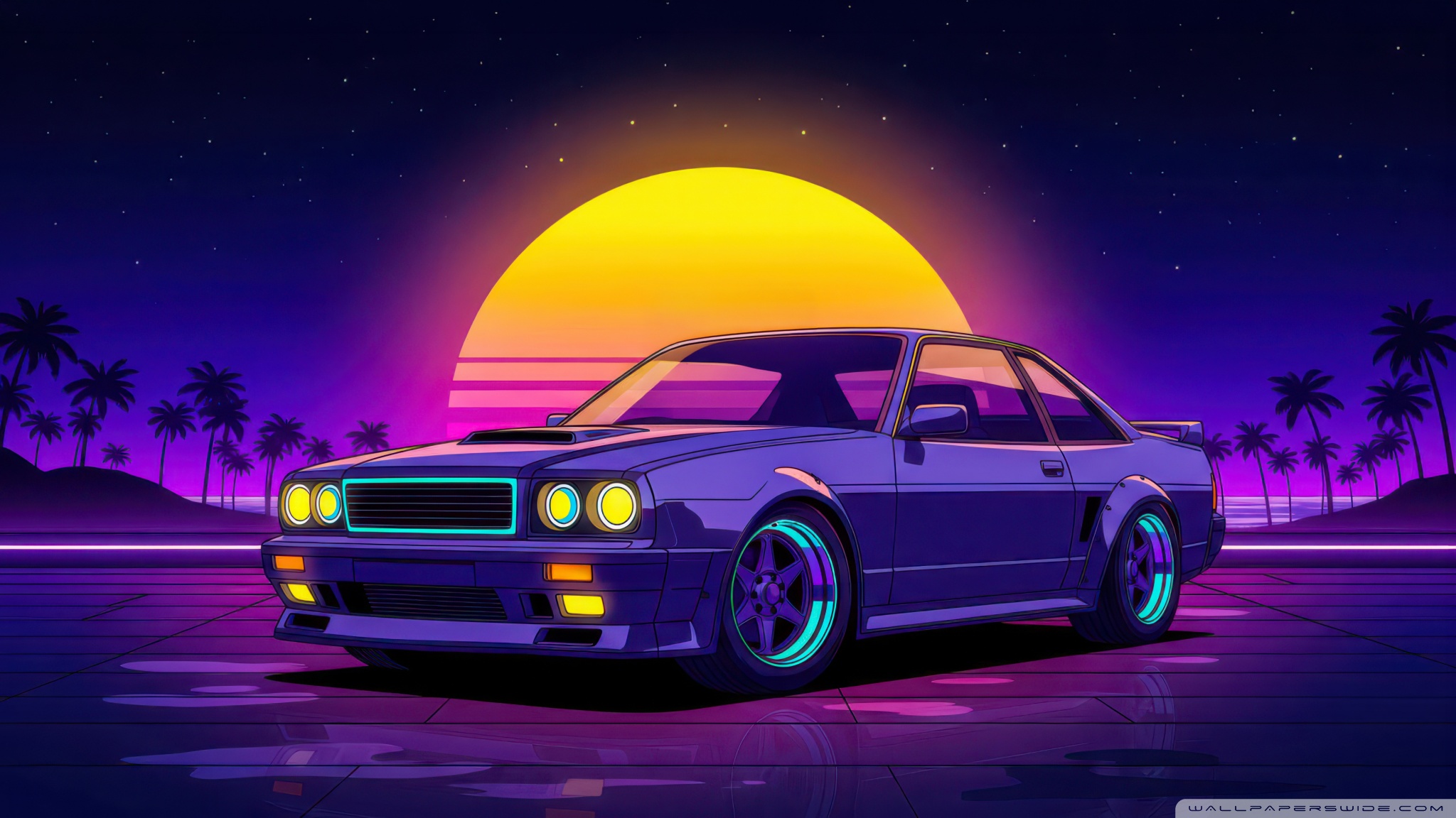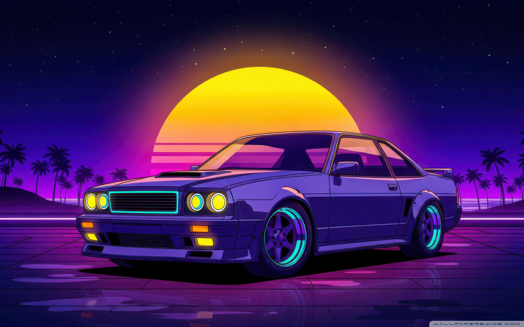 Download Retro Synthwave Car against Sunset 4K UHD Wallpaper