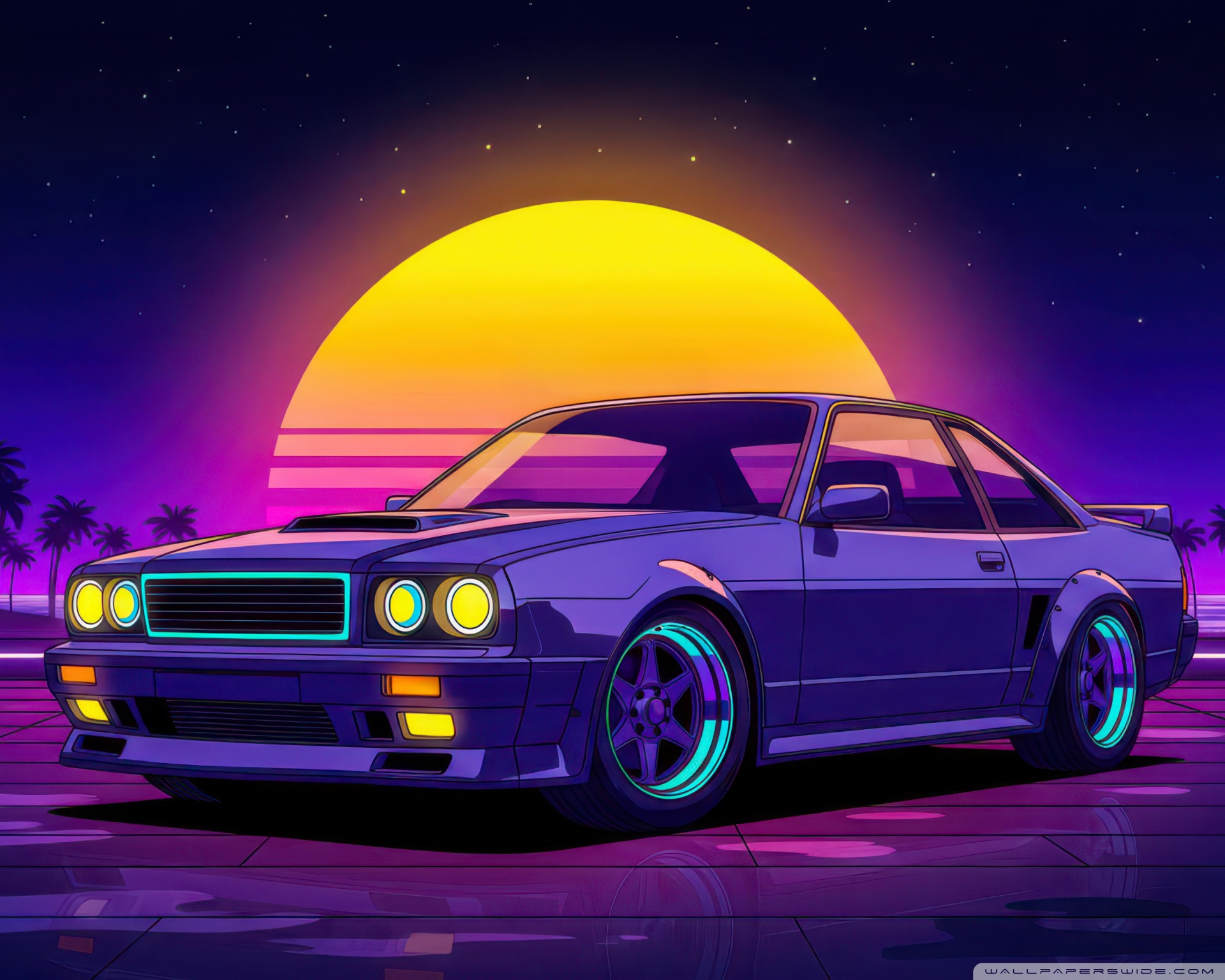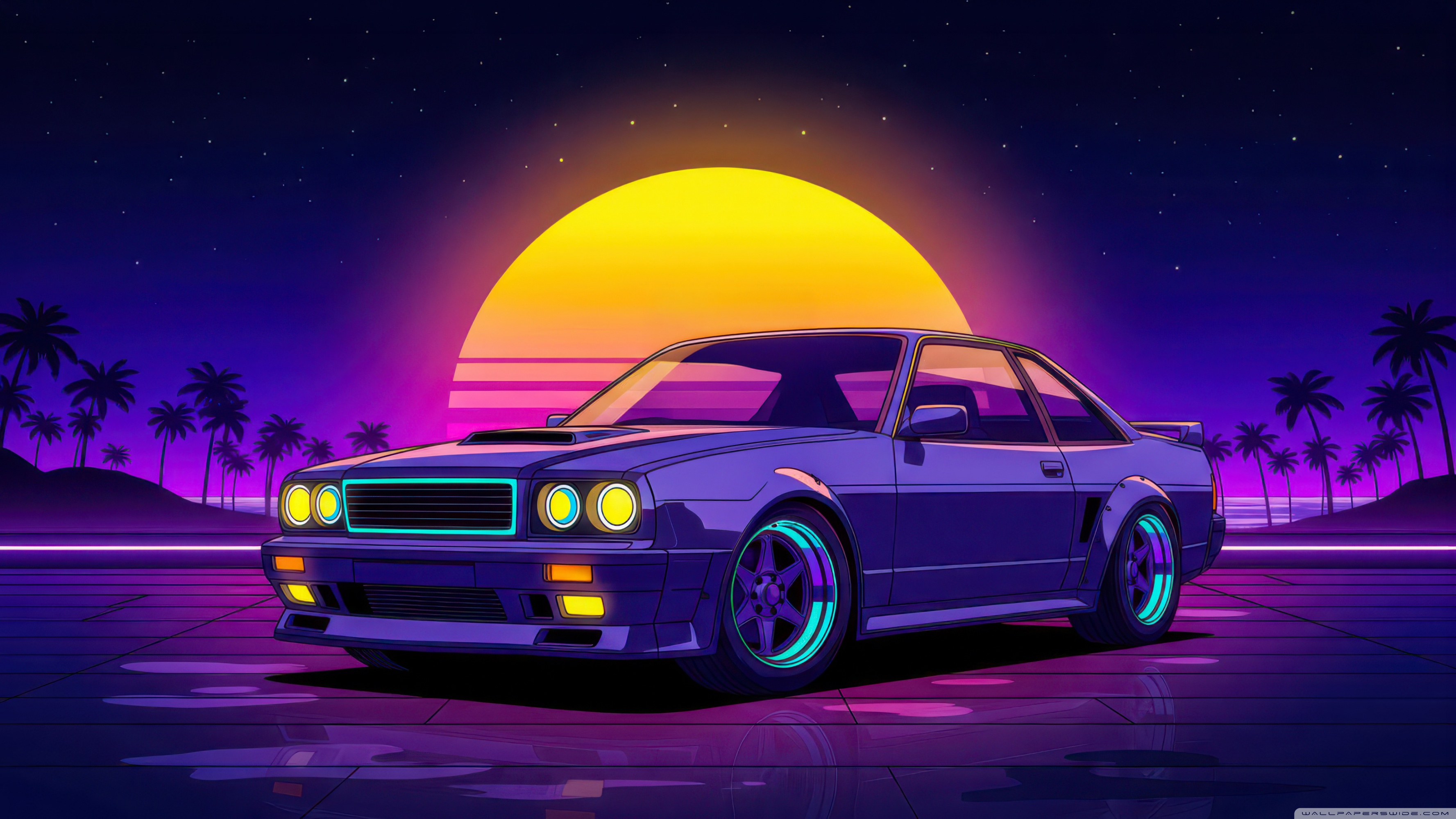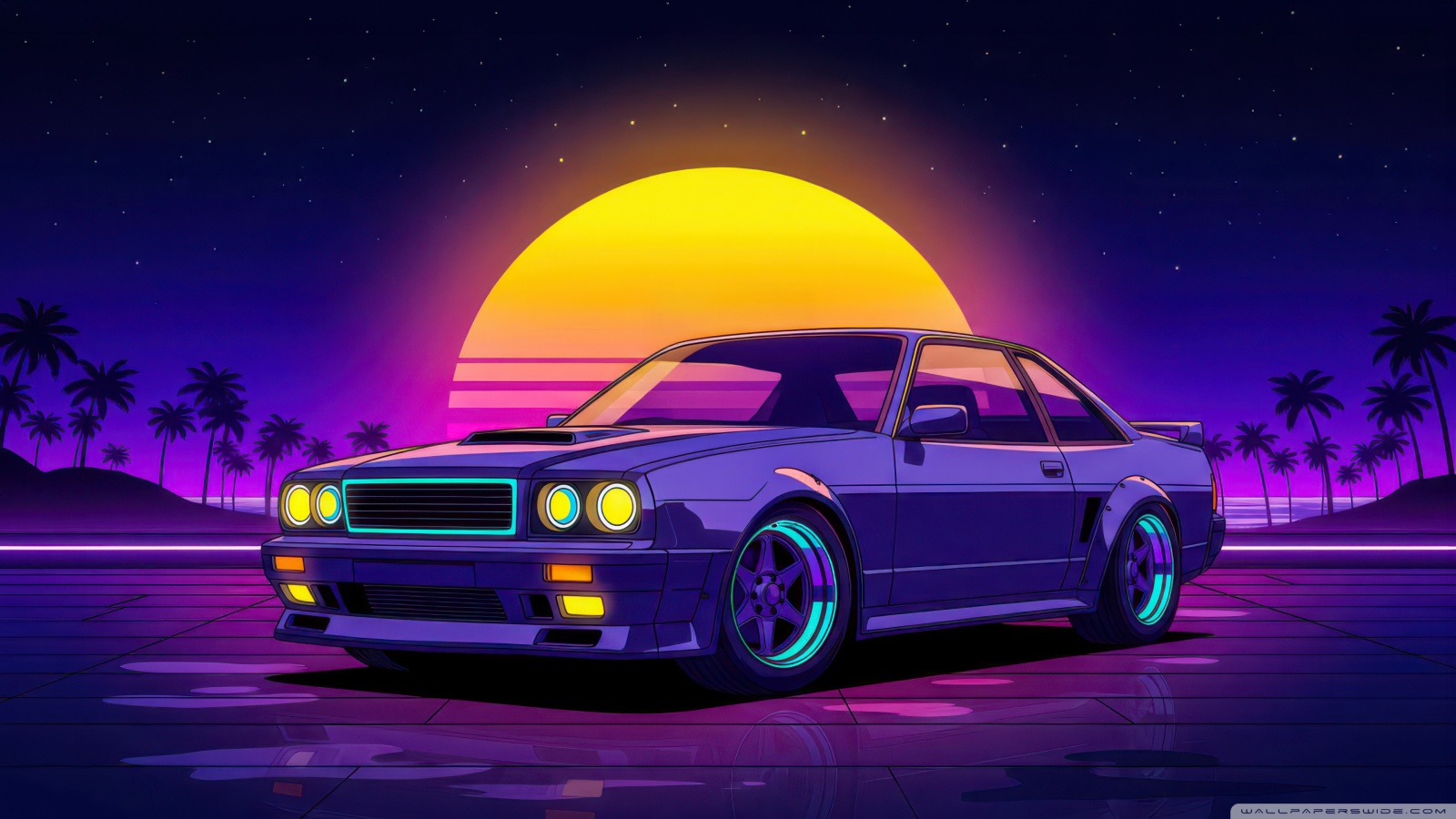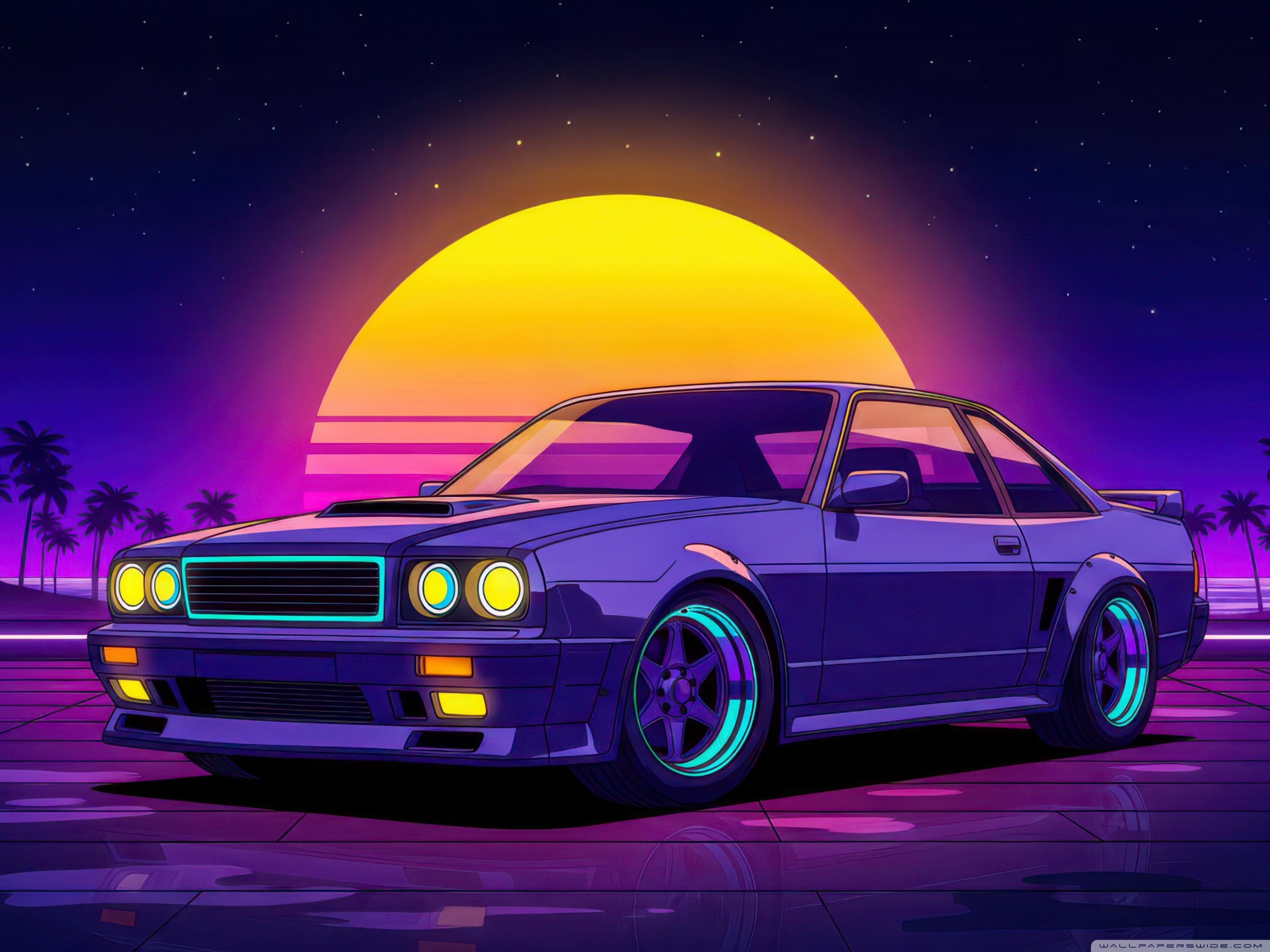 Download Retro Synthwave Car against Sunset 4K UHD Wallpaper
