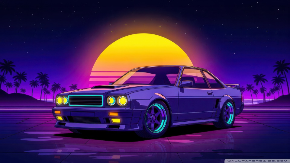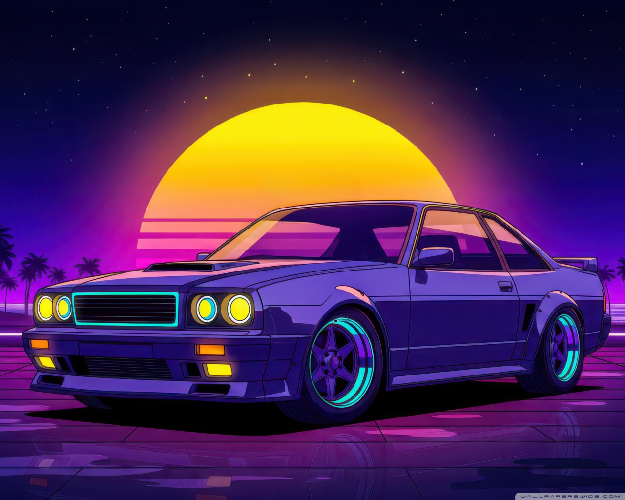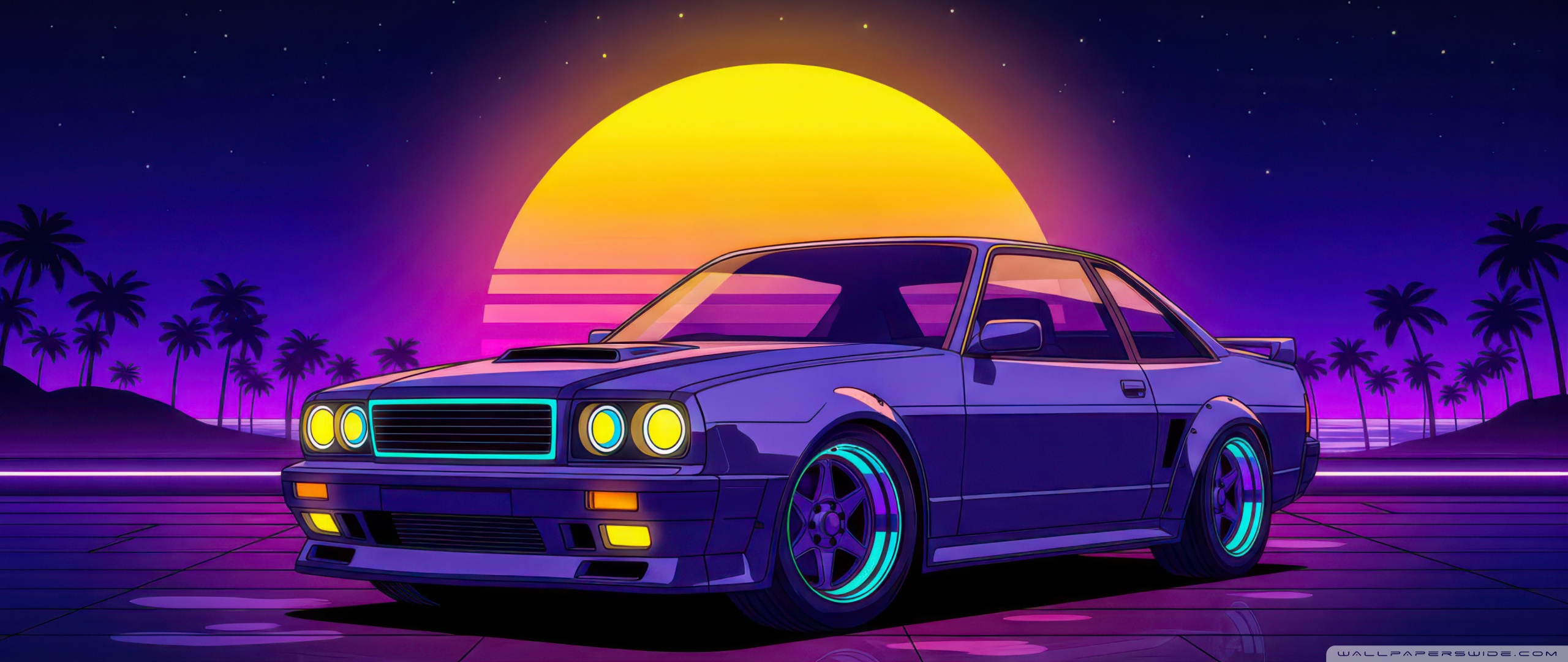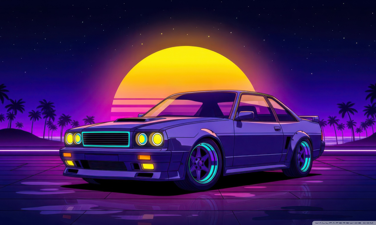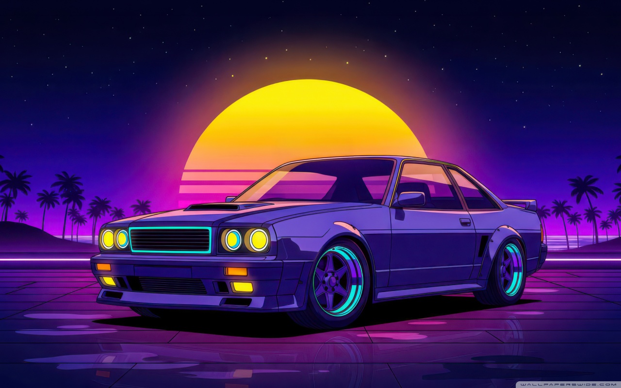 Download Retro Synthwave Car against Sunset 4K UHD Wallpaper