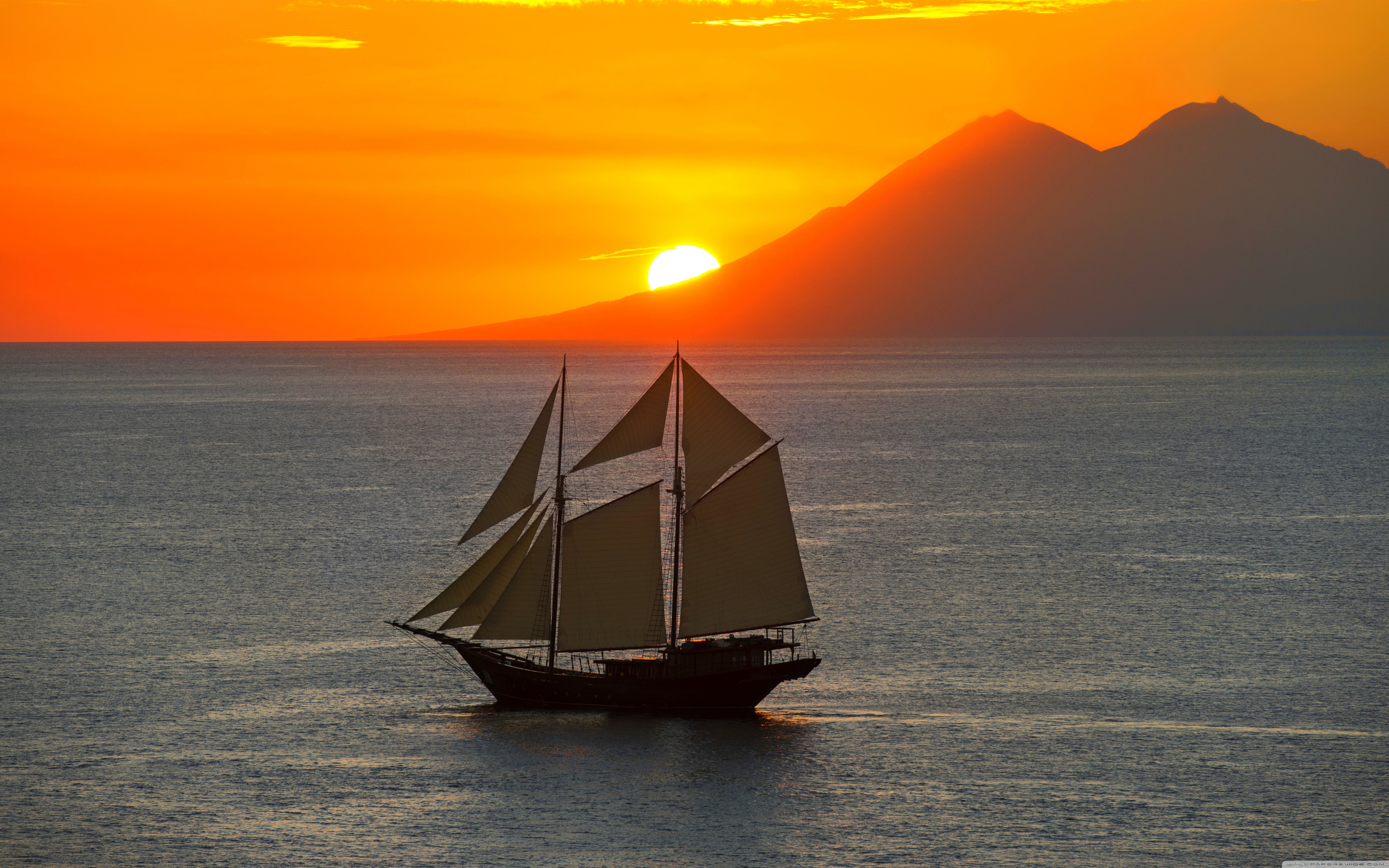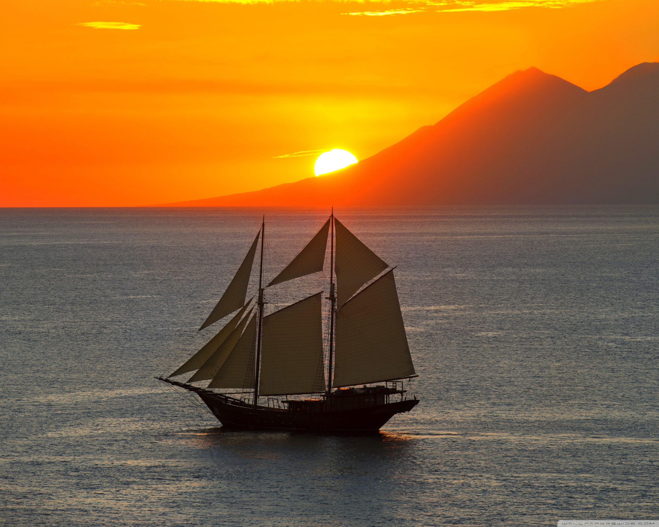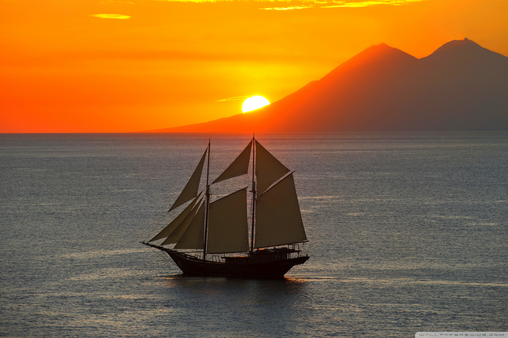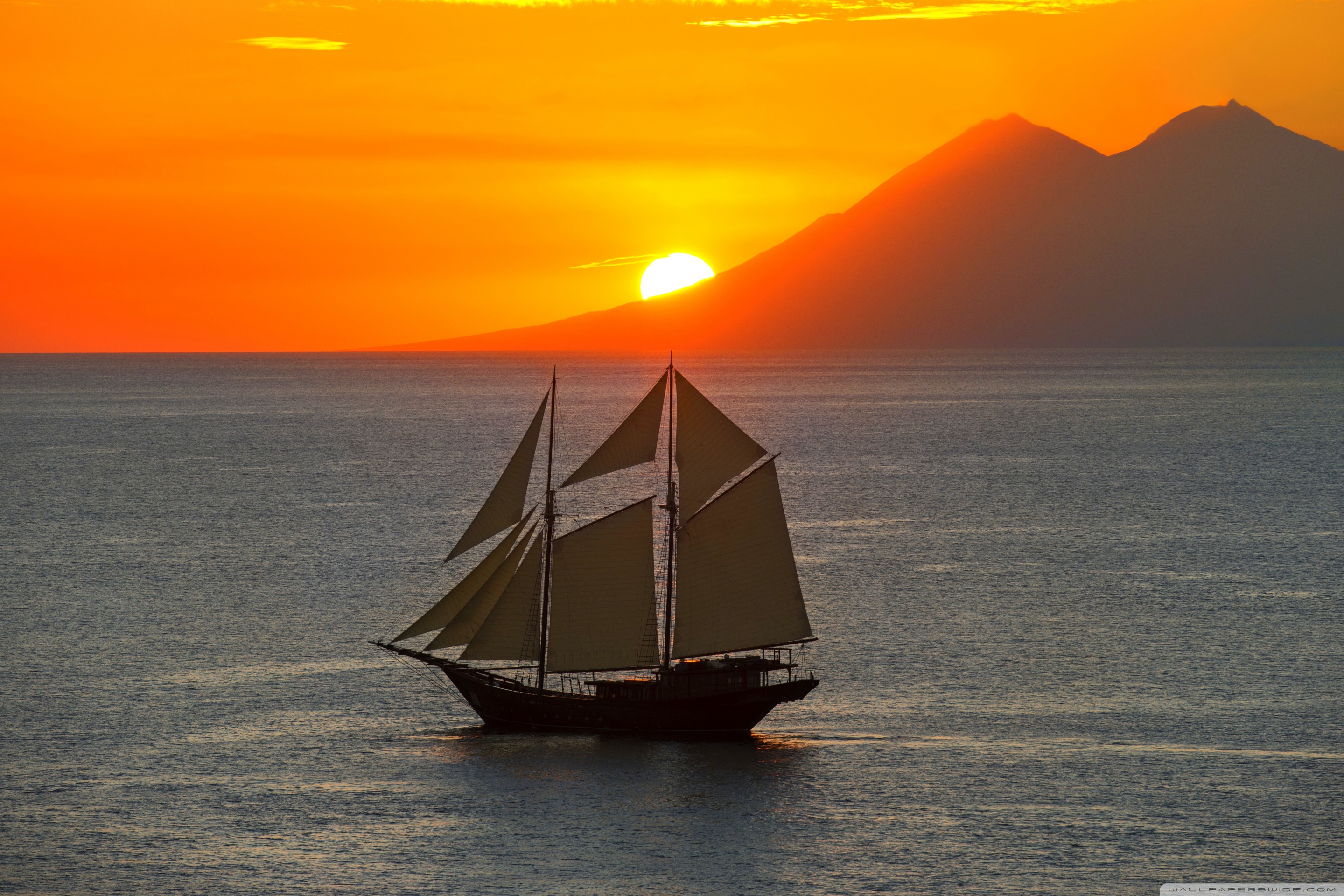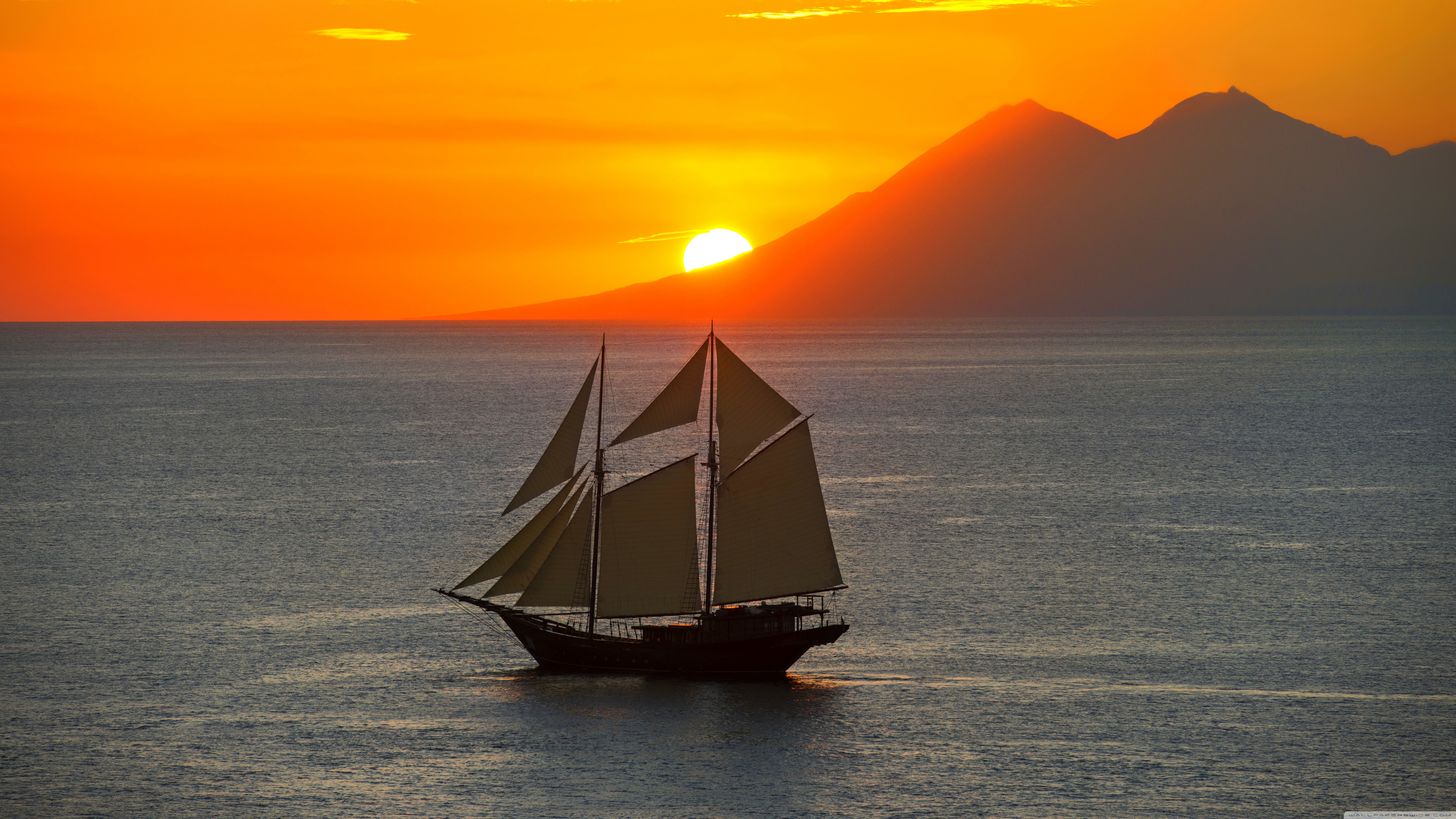 Download Sailing Ship at Sunset Over Calm Waters 4K UHD Wallpaper