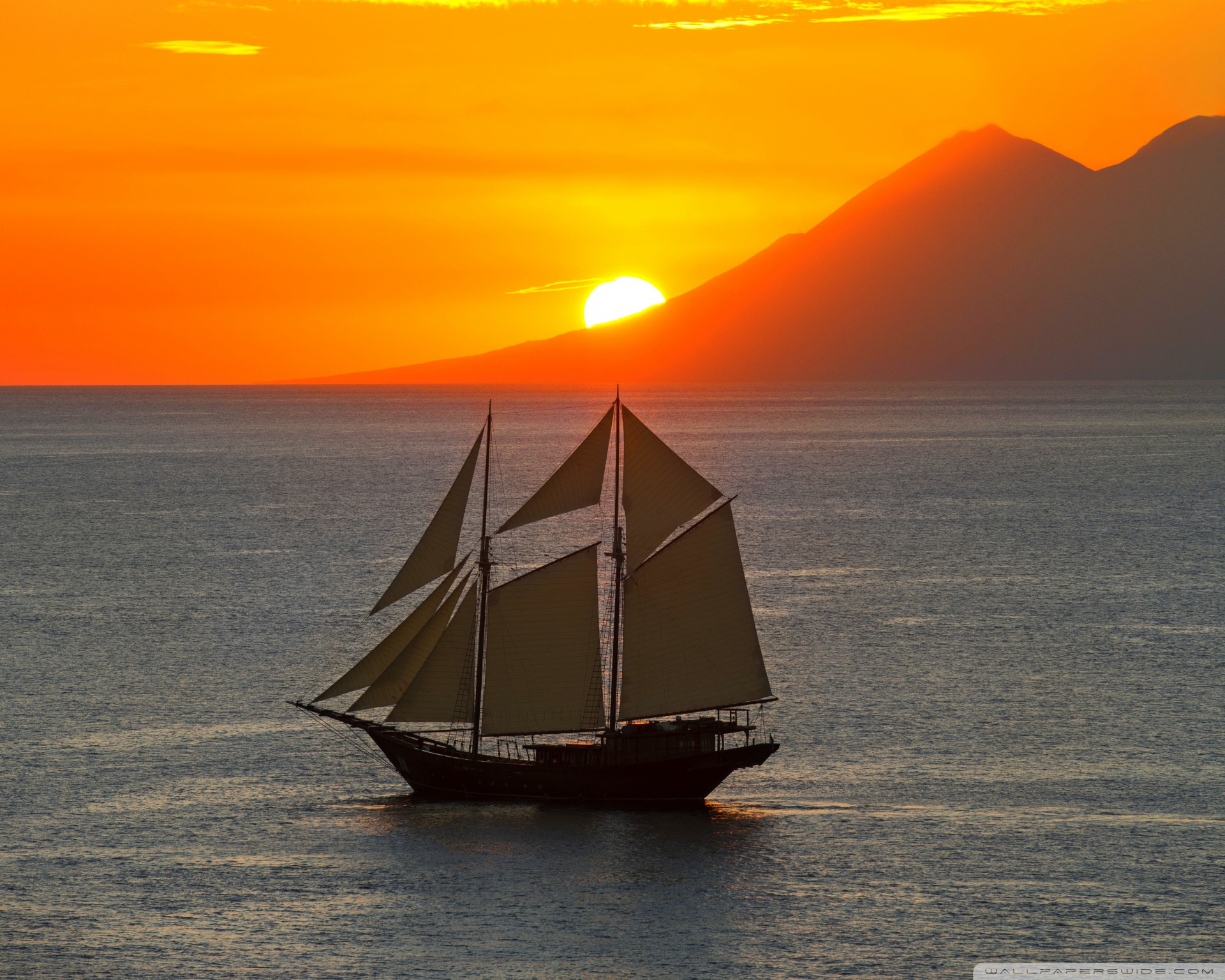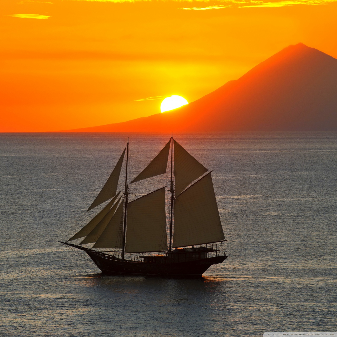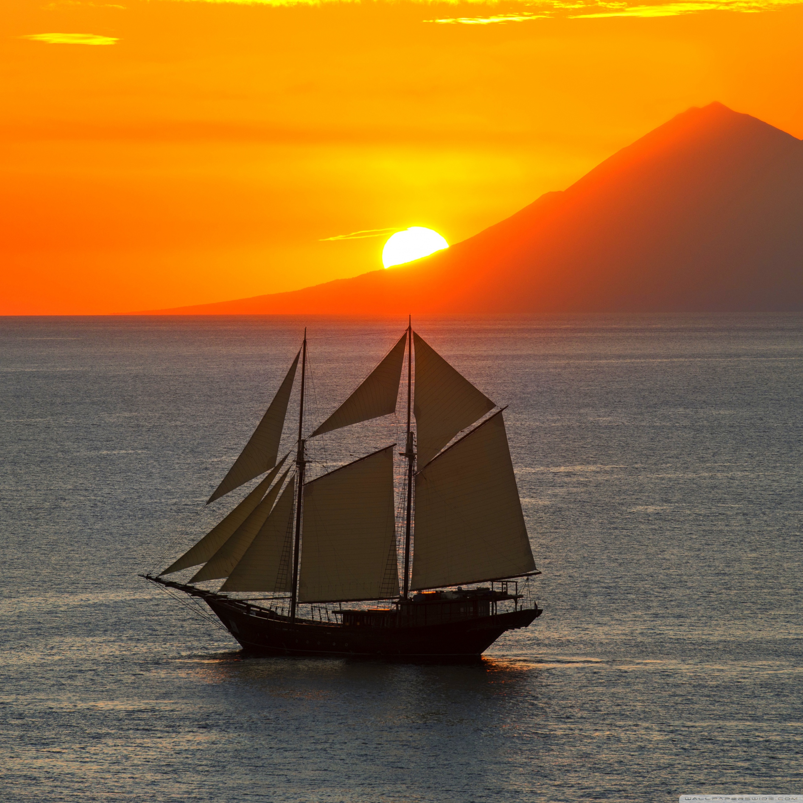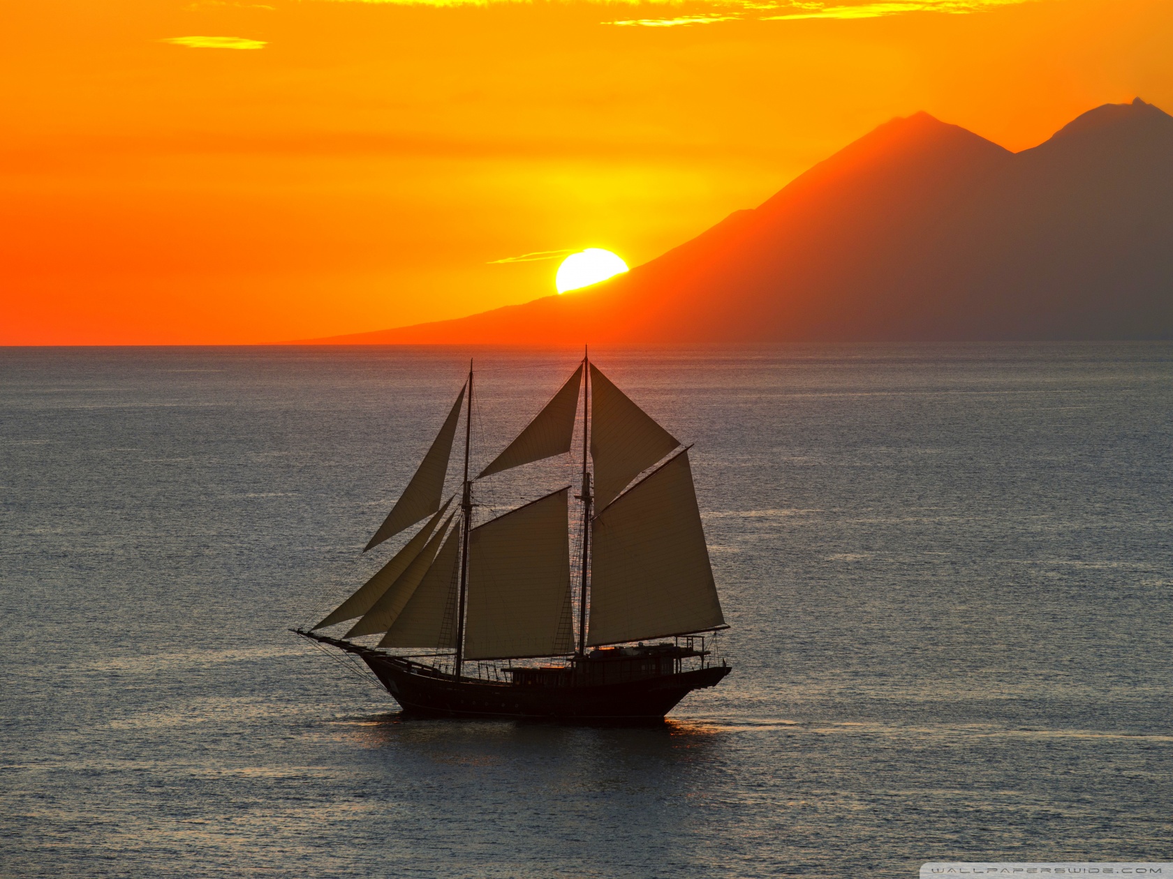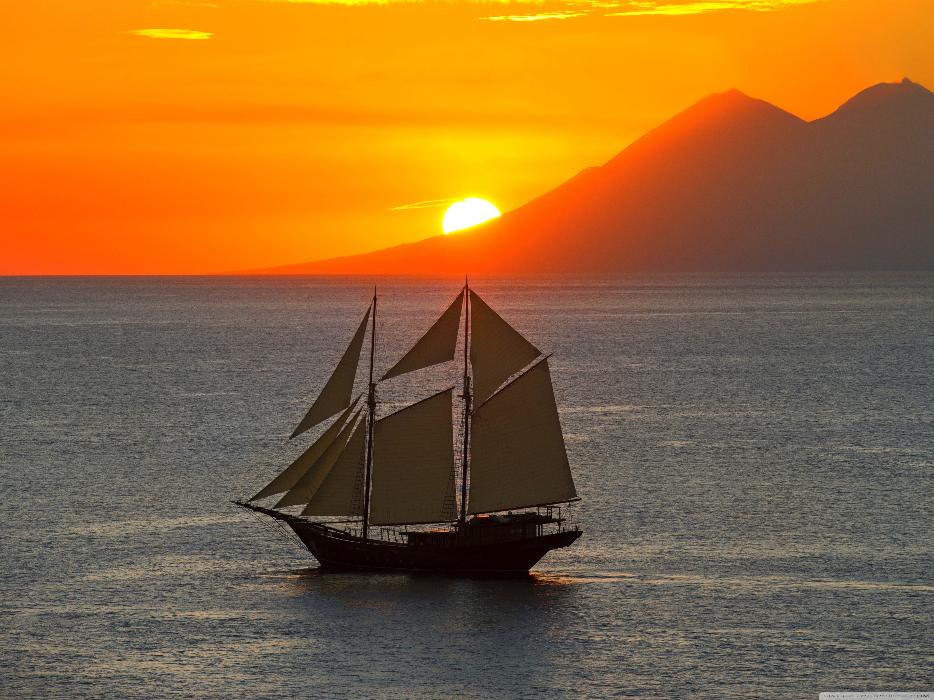 Download Sailing Ship at Sunset Over Calm Waters 4K UHD Wallpaper
