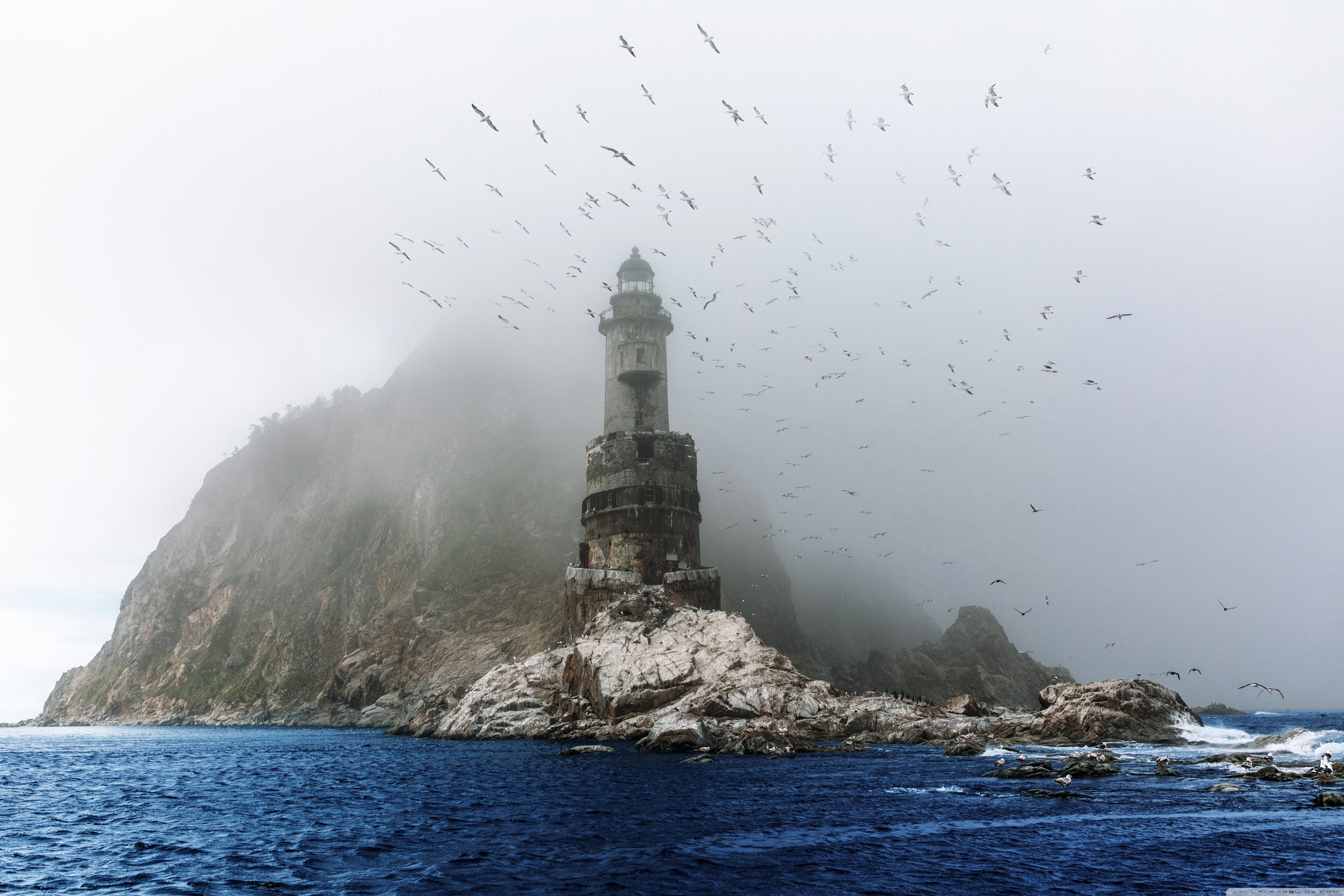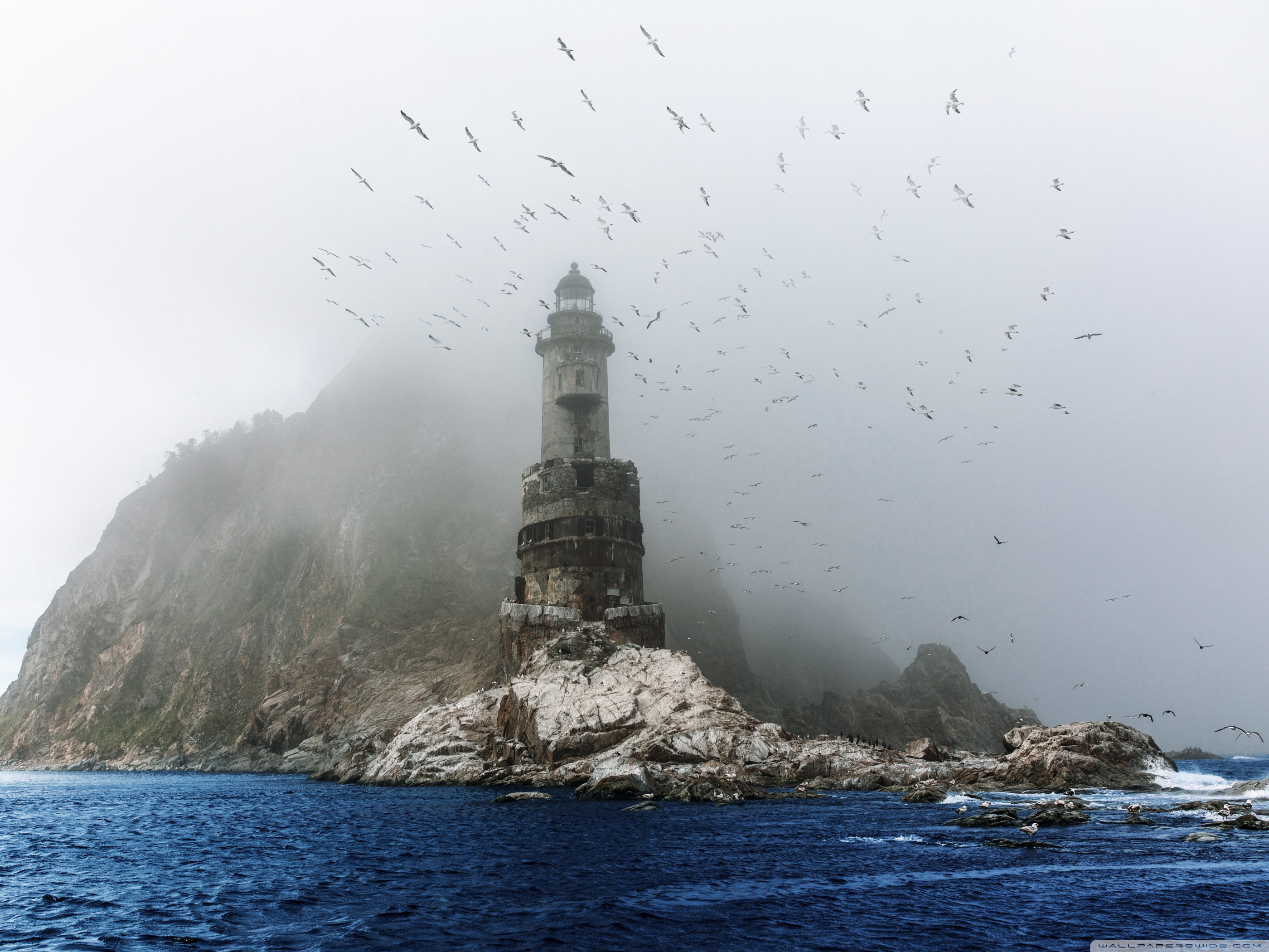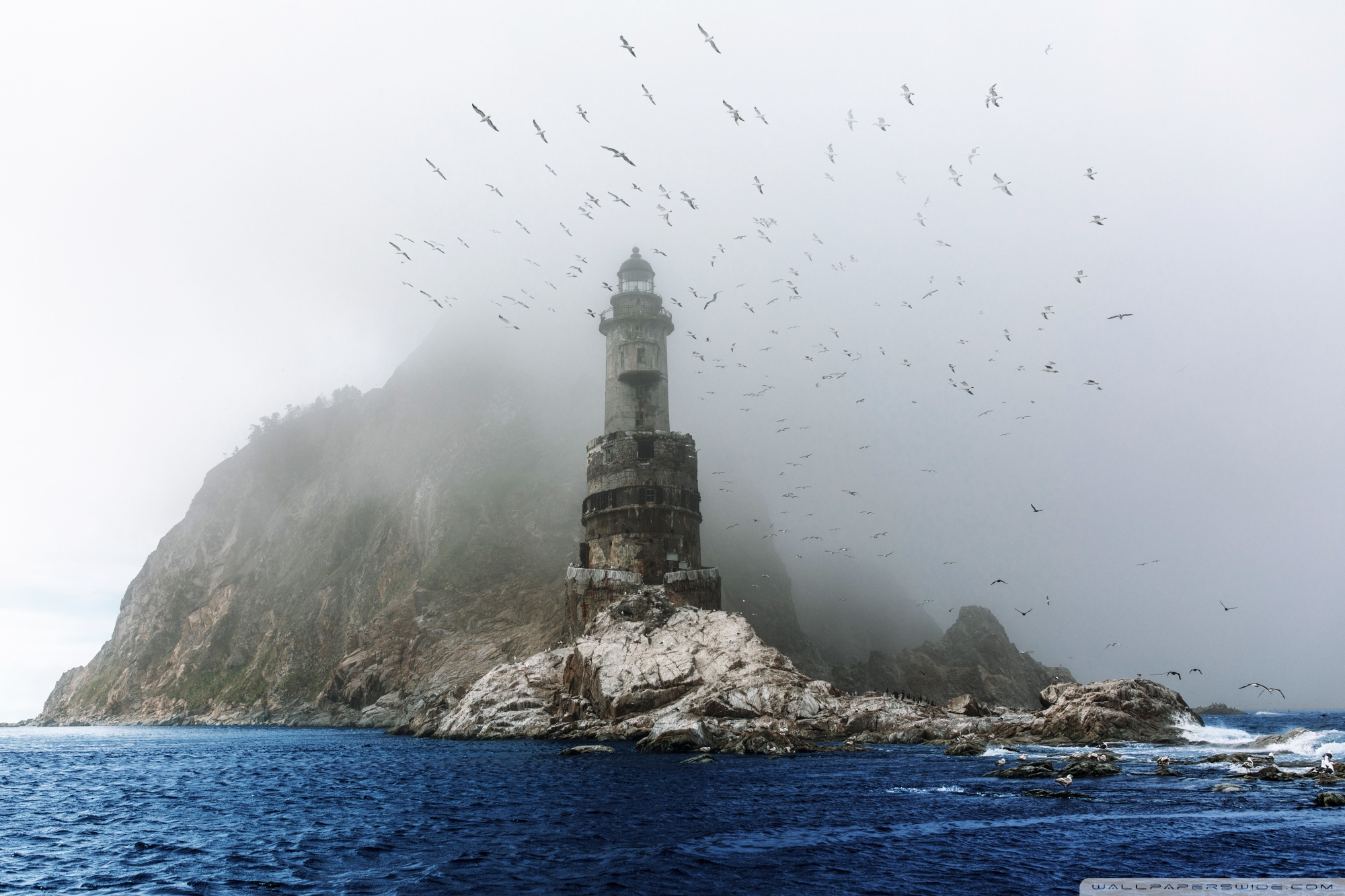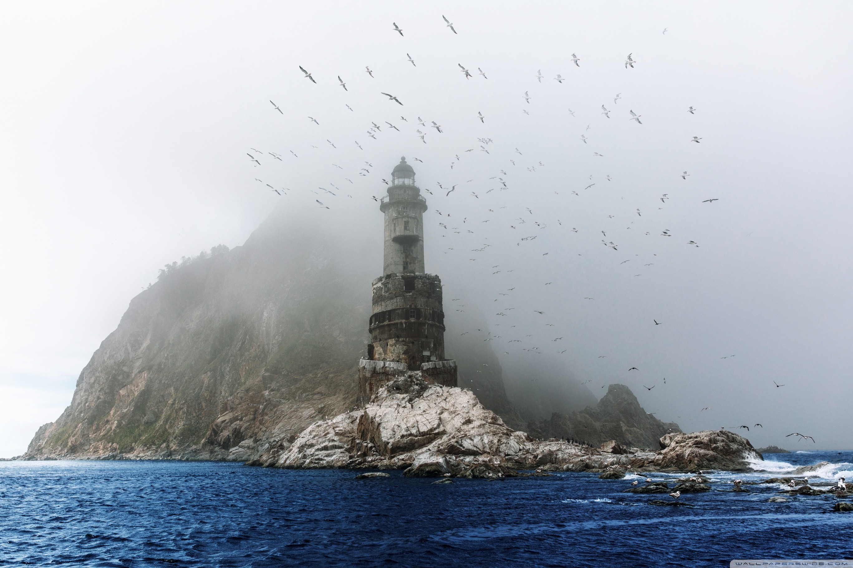 Download Seagulls Over Foggy Aniva Lighthouse 4K UHD Wallpaper