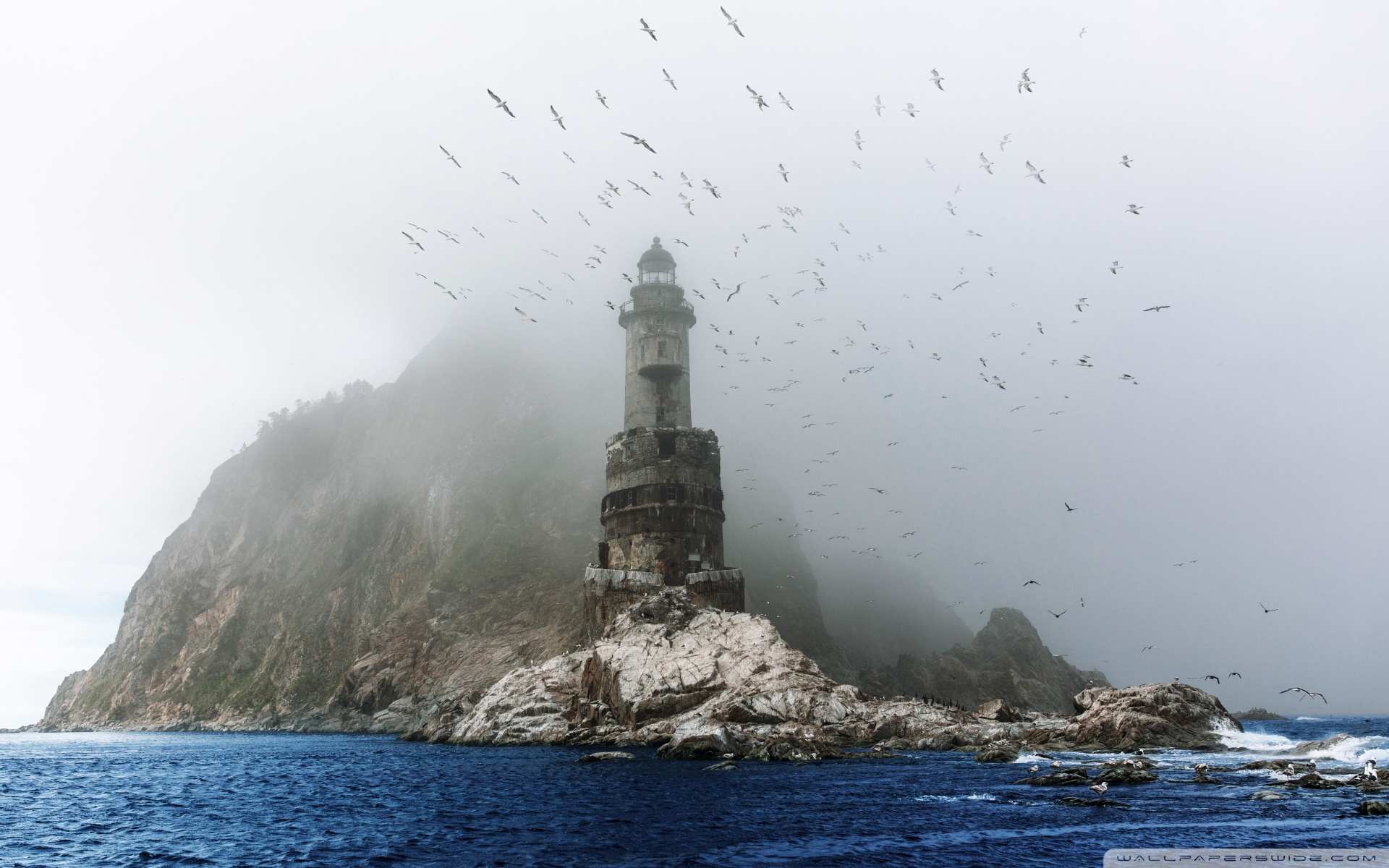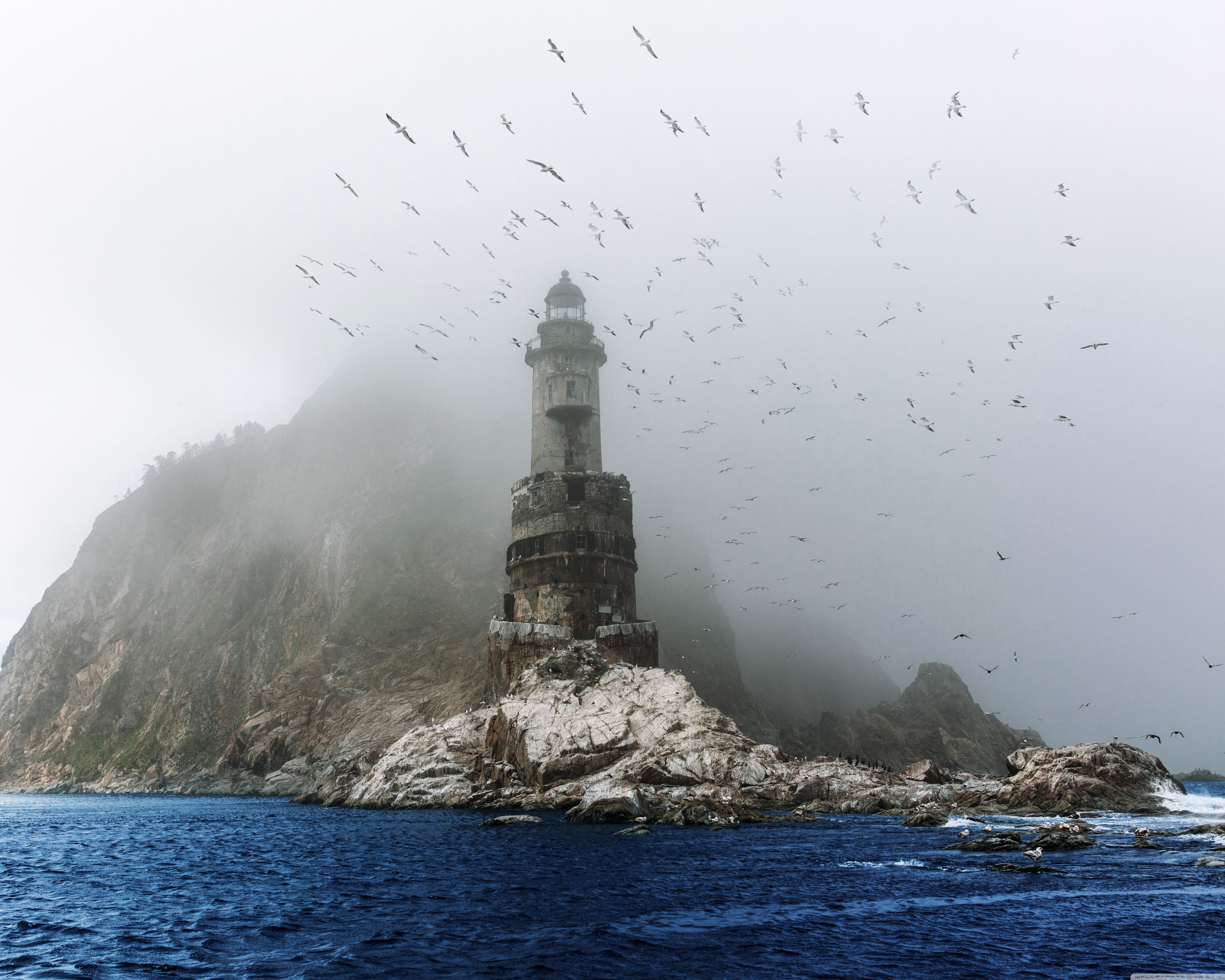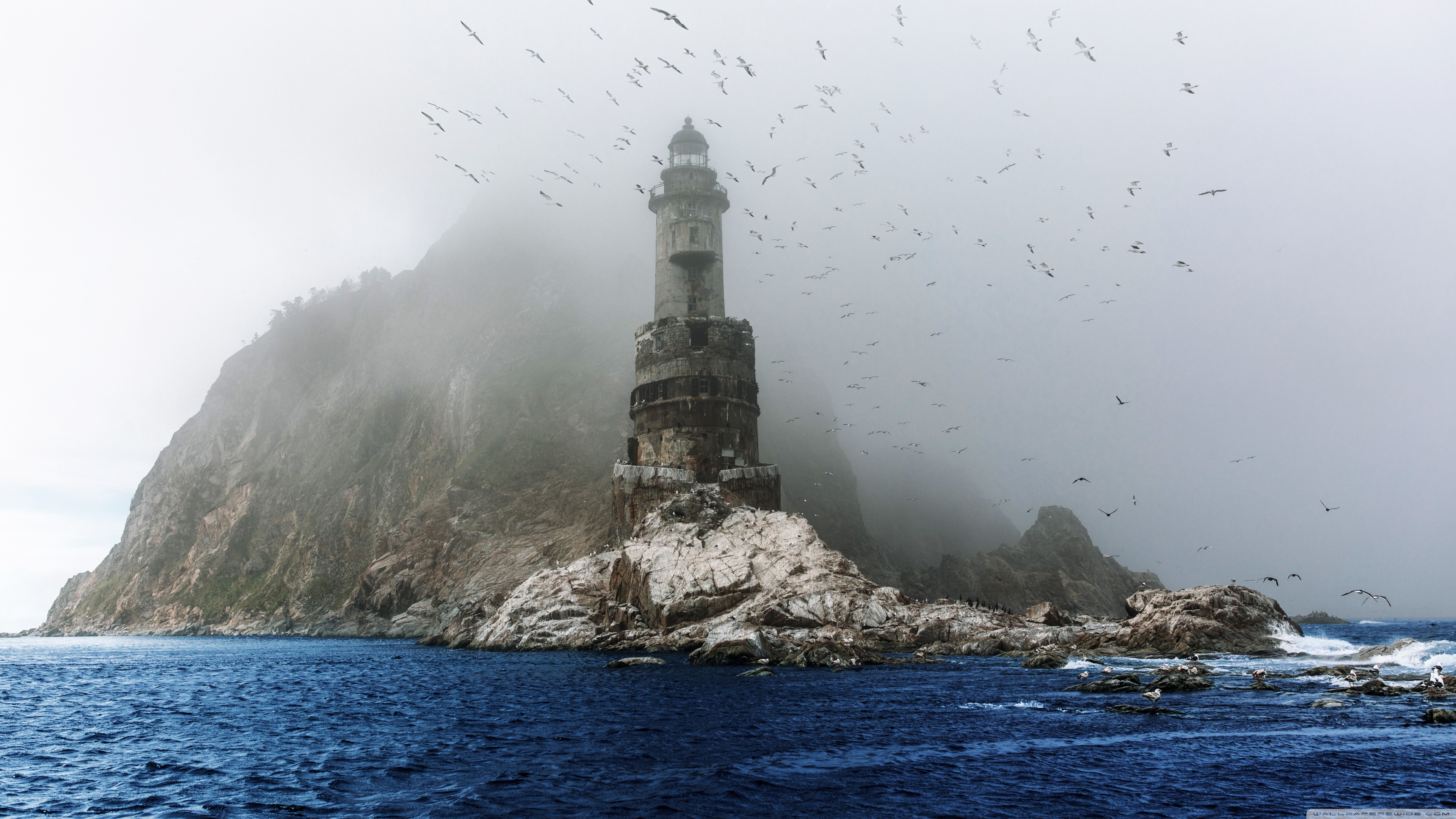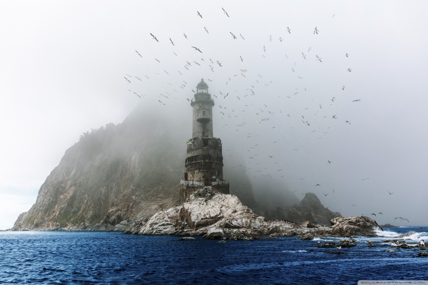 Download Seagulls Over Foggy Aniva Lighthouse 4K UHD Wallpaper