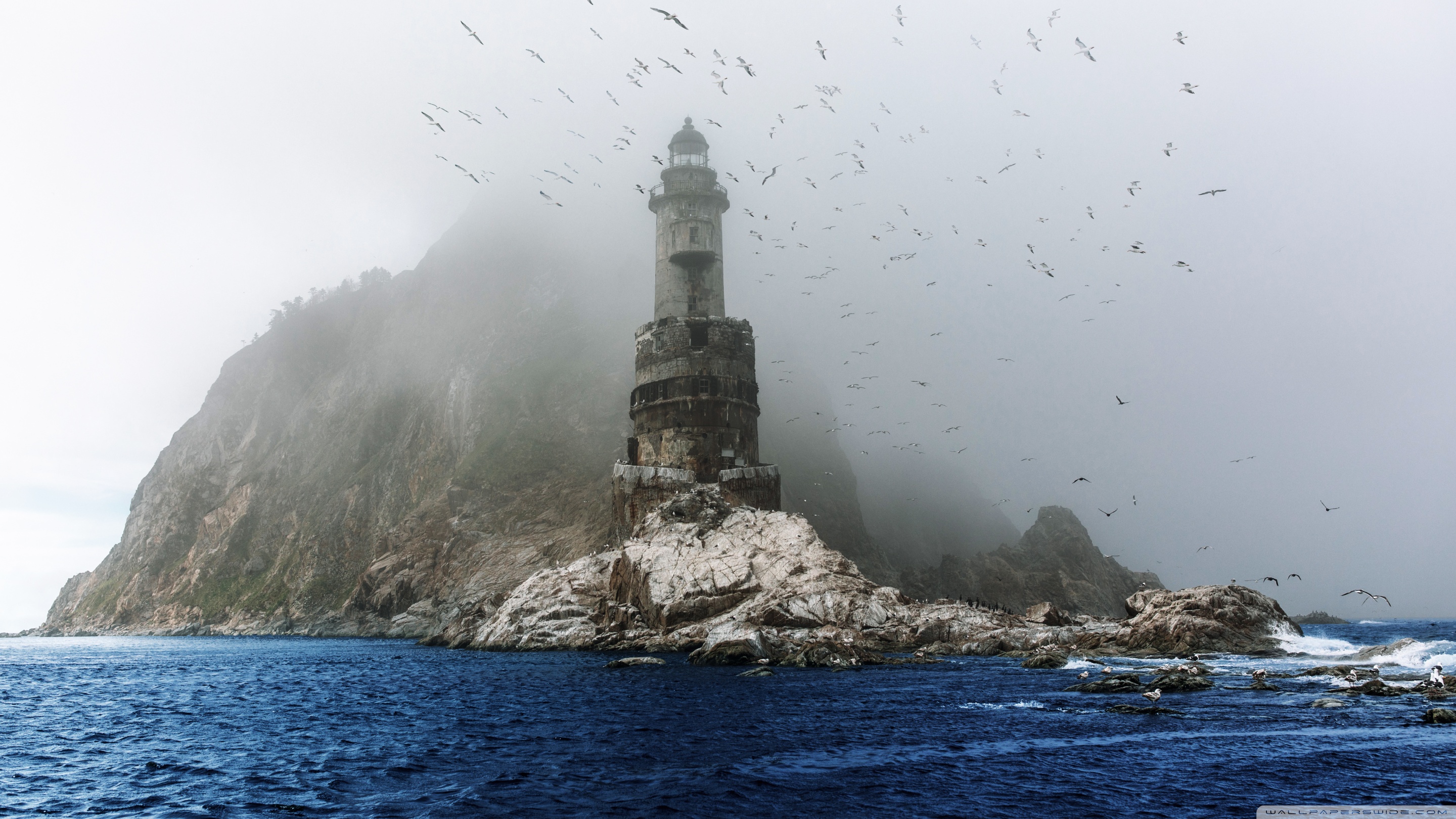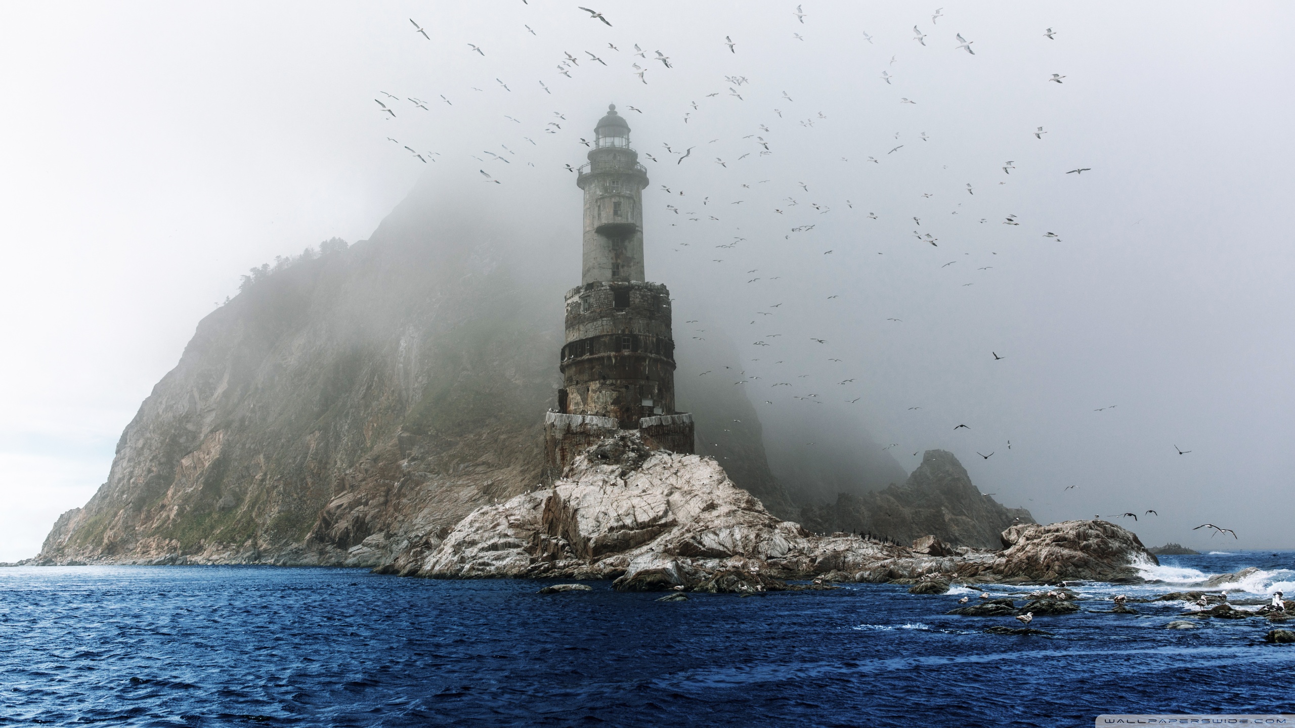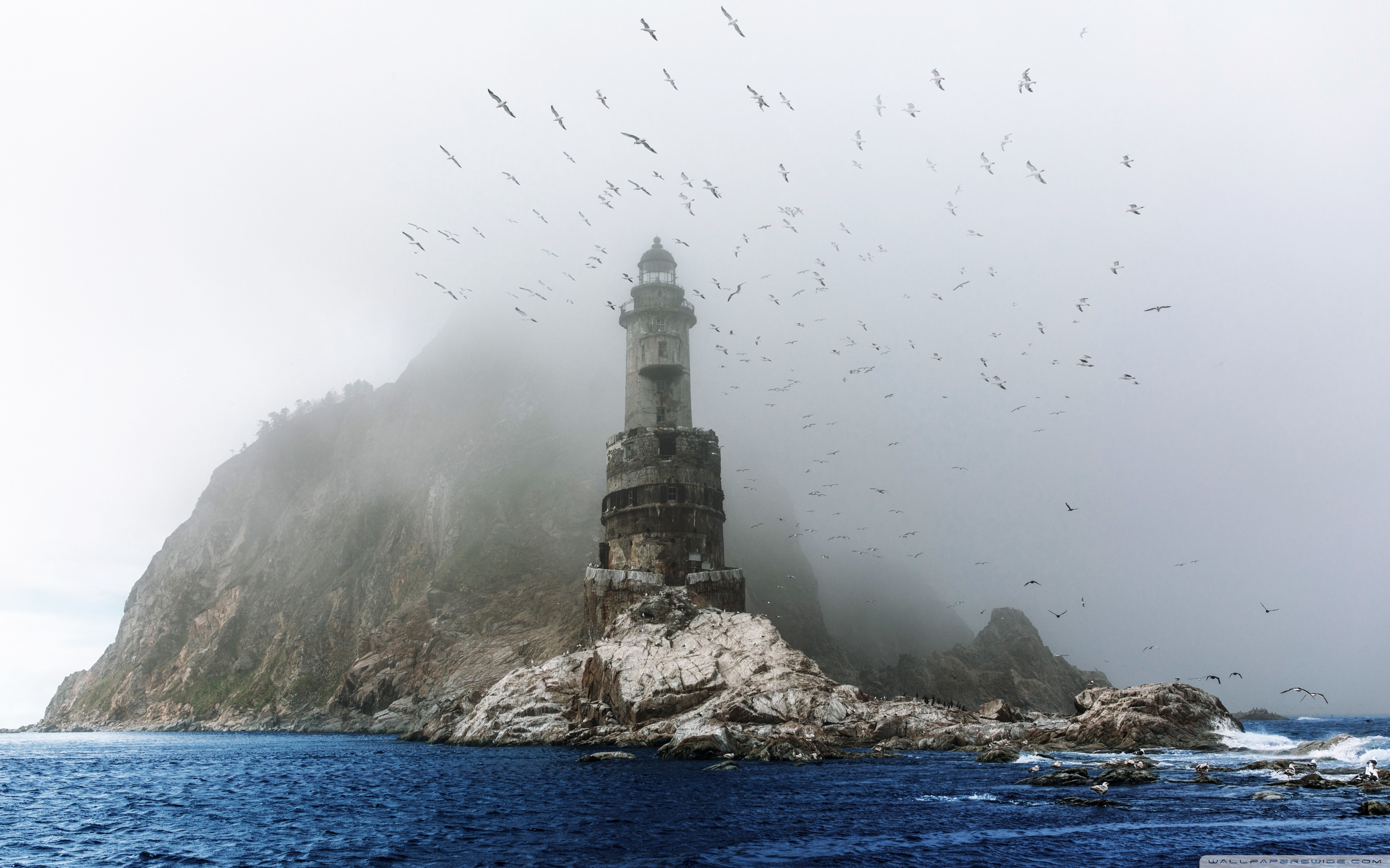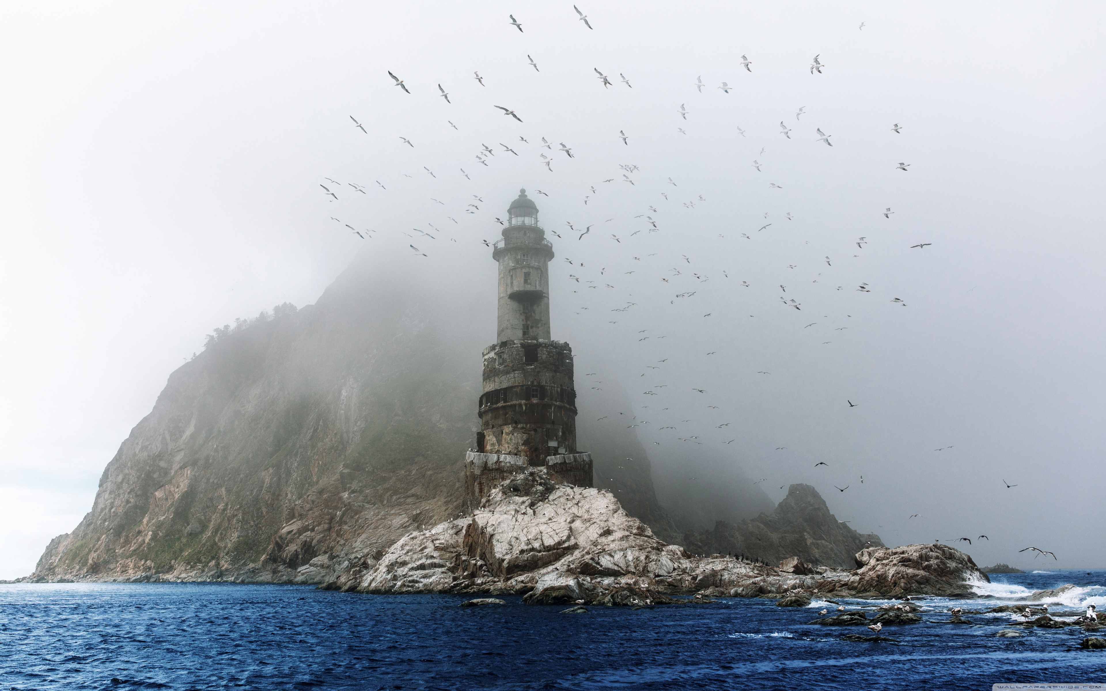 Download Seagulls Over Foggy Aniva Lighthouse 4K UHD Wallpaper
