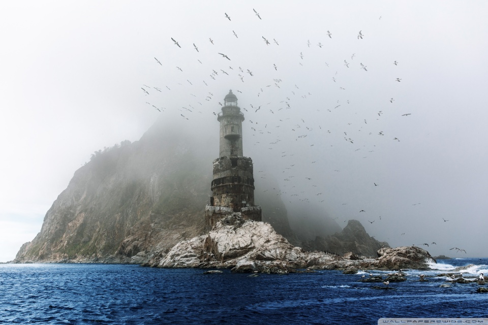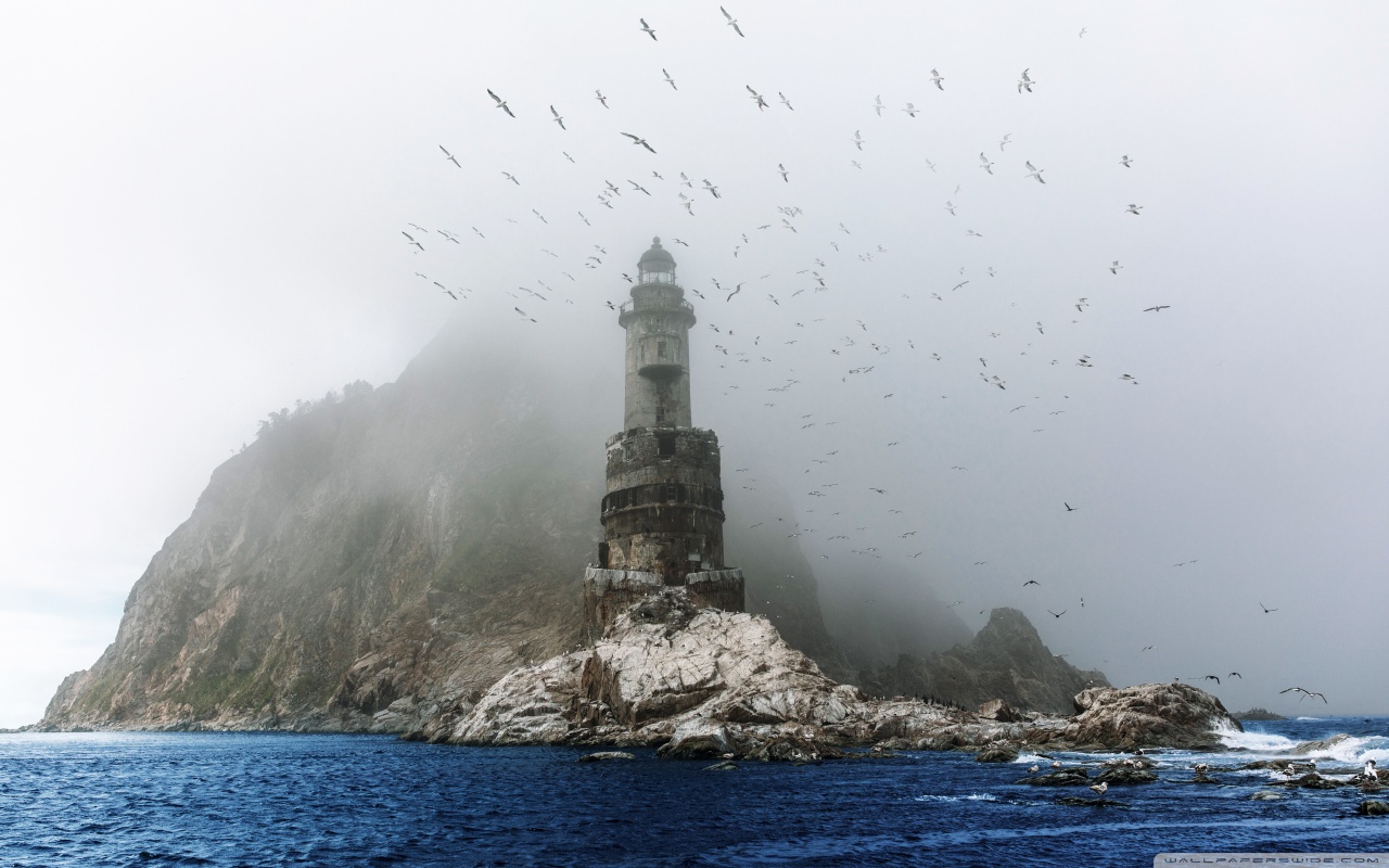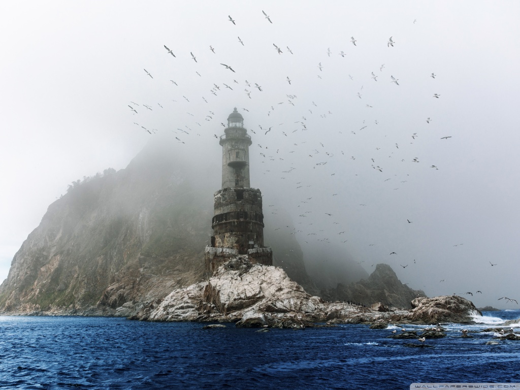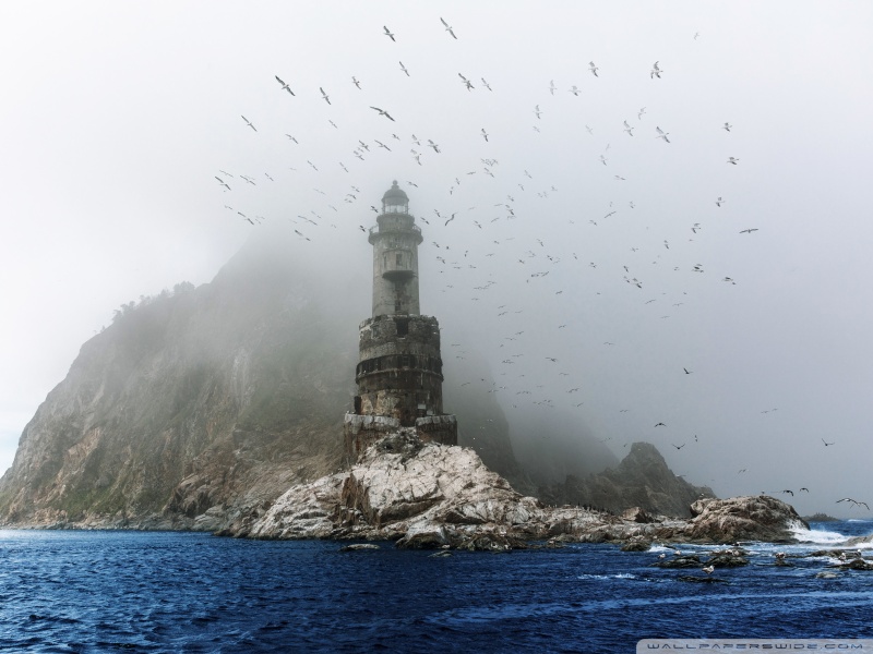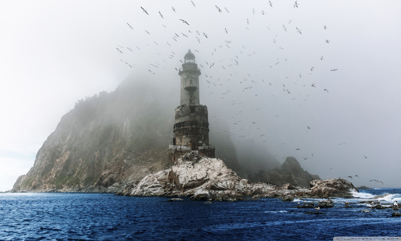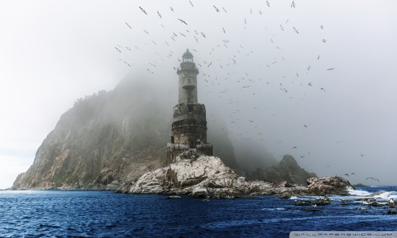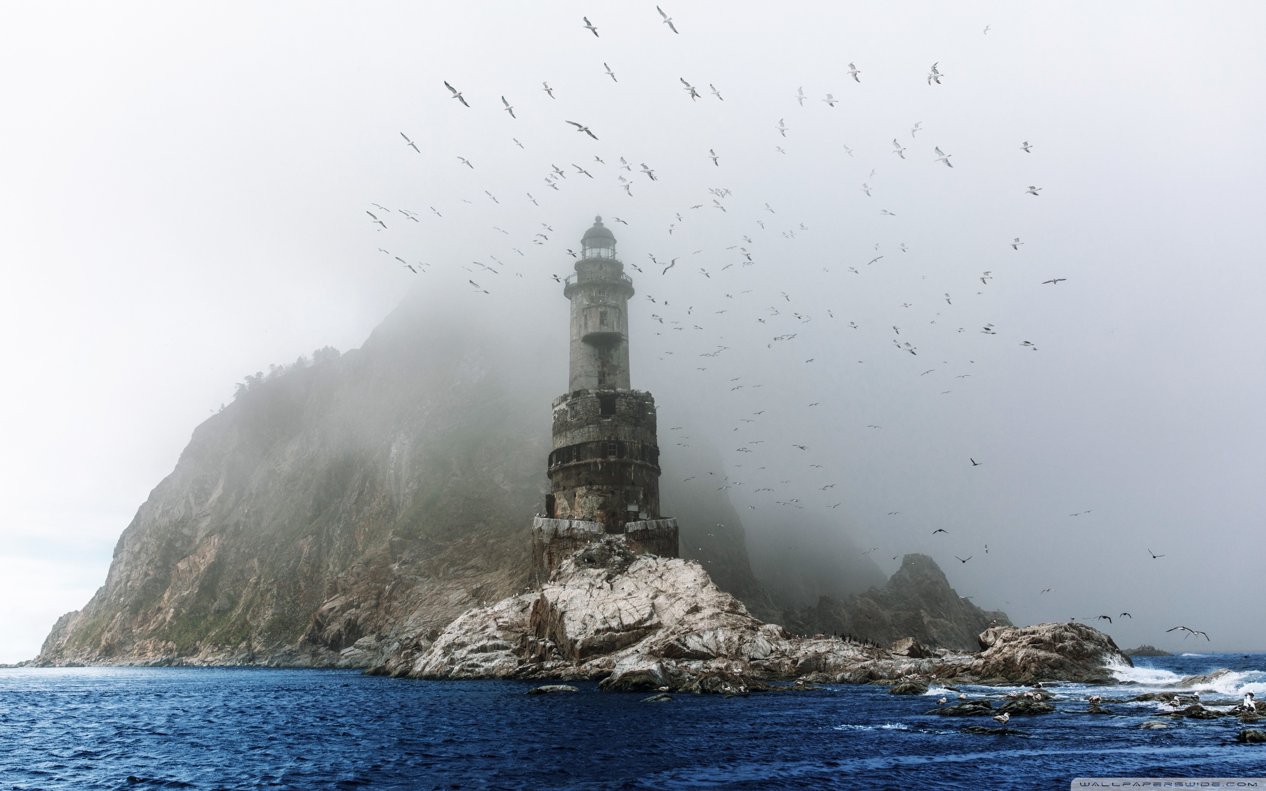 Download Seagulls Over Foggy Aniva Lighthouse 4K UHD Wallpaper