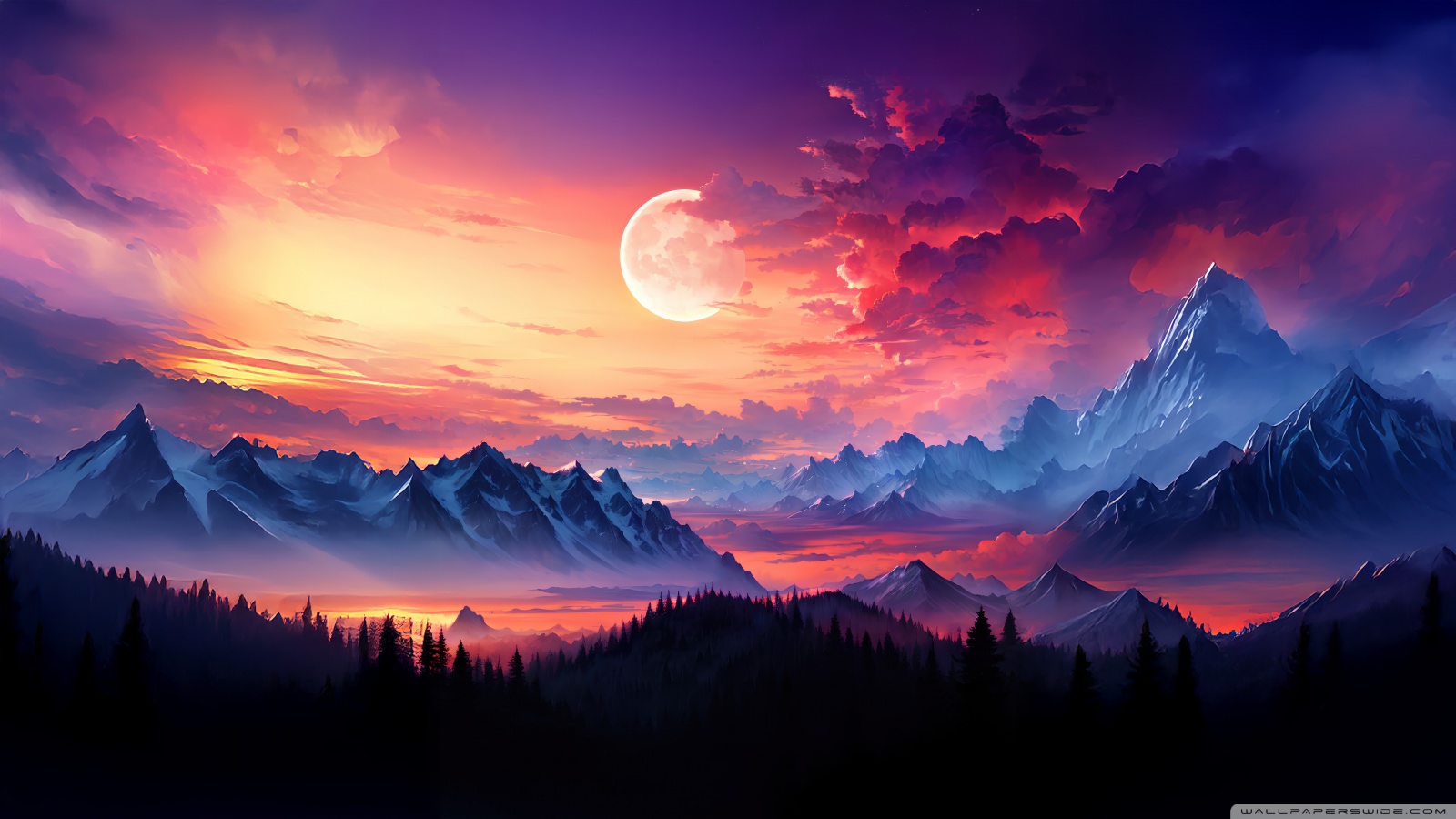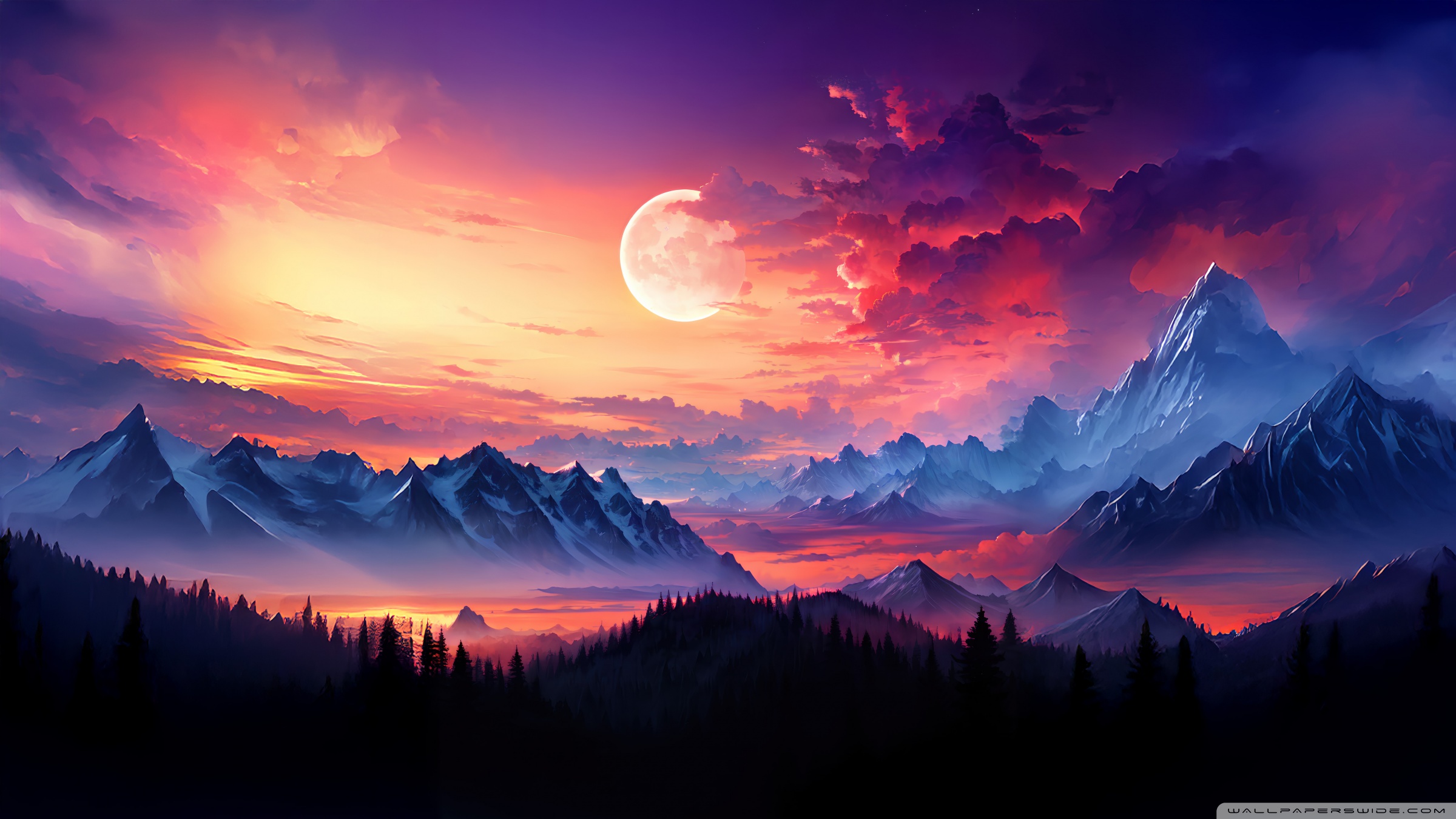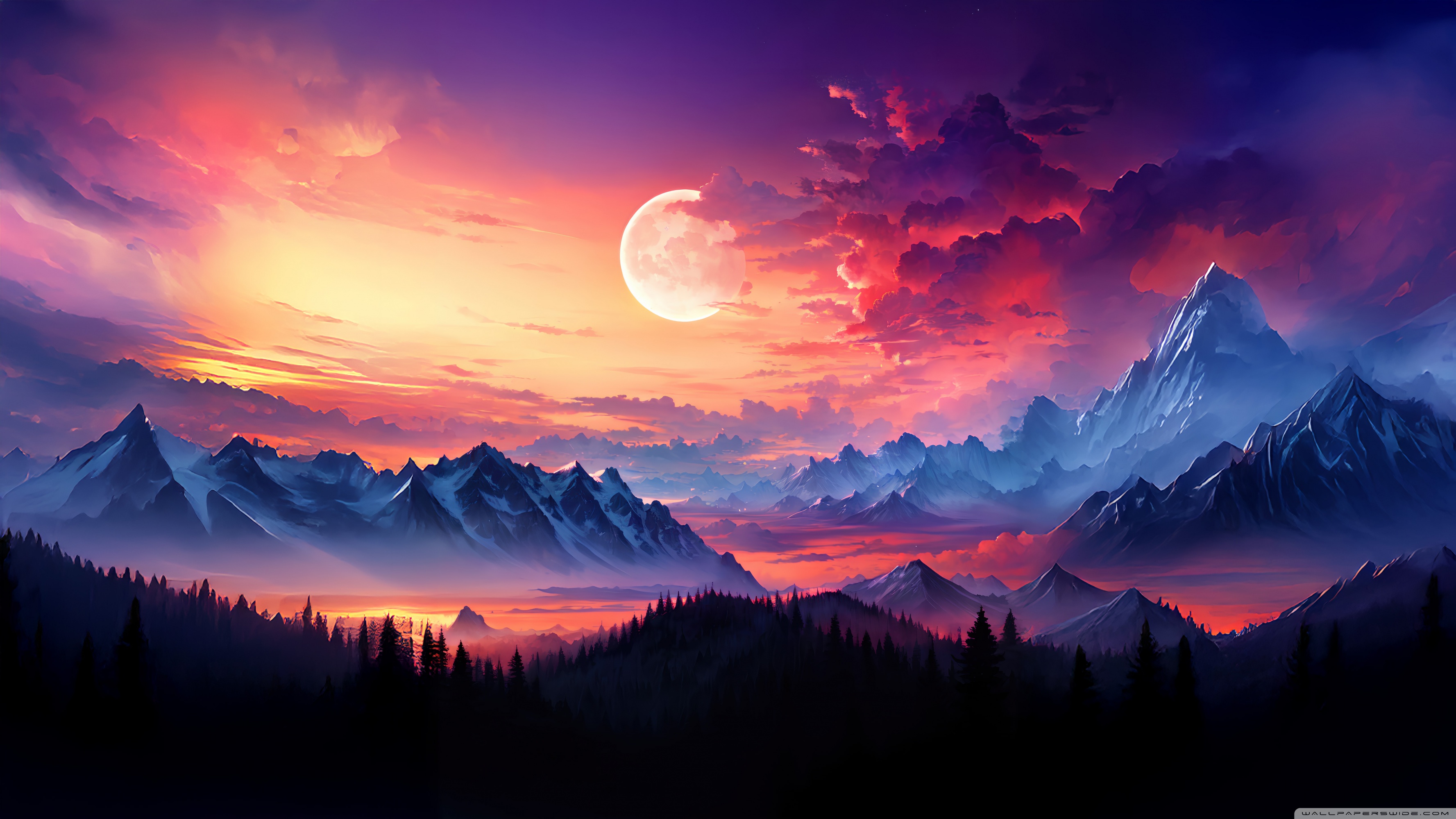 Download Snow Capped Mountains With Full Moon 4K UHD Wallpaper