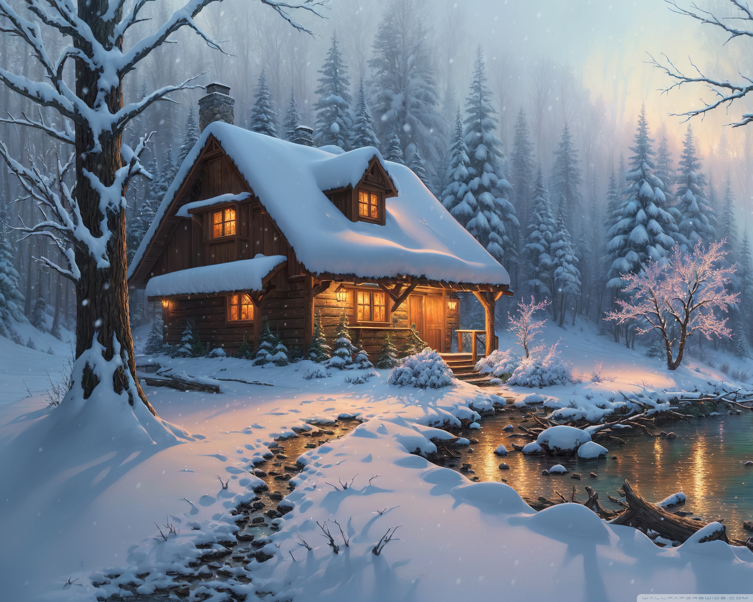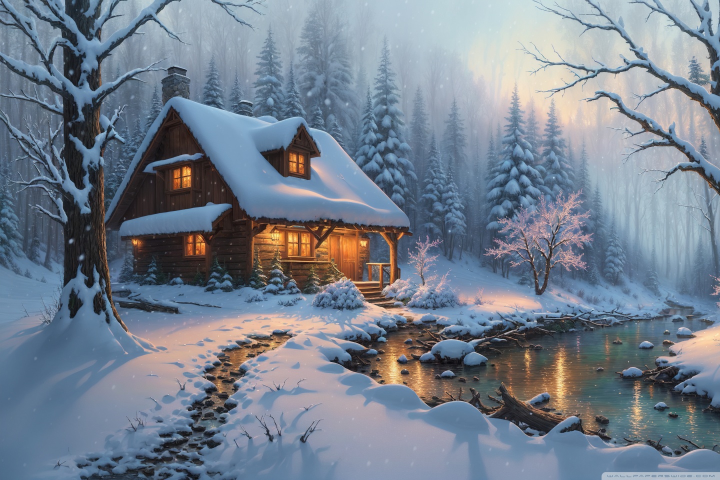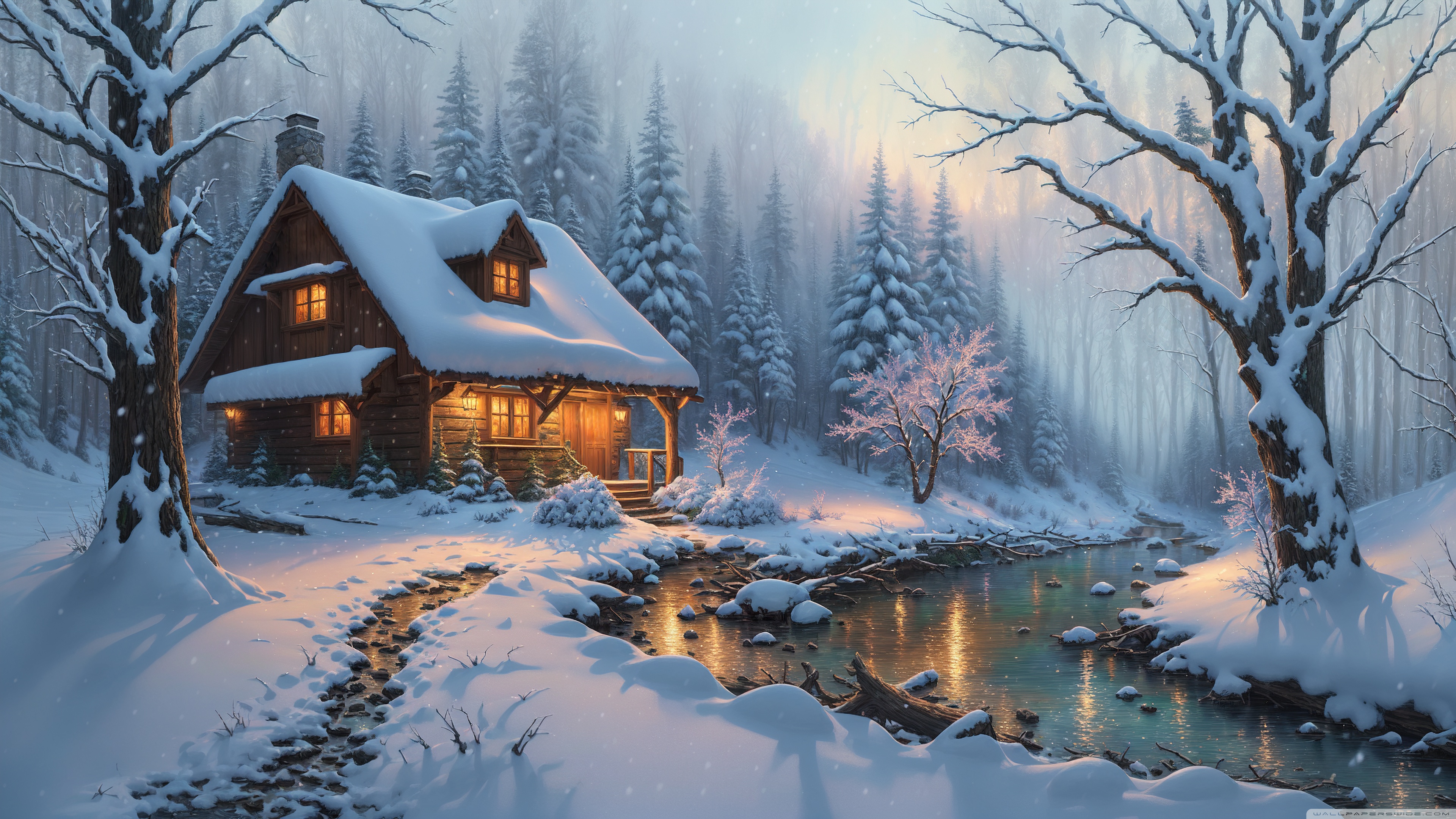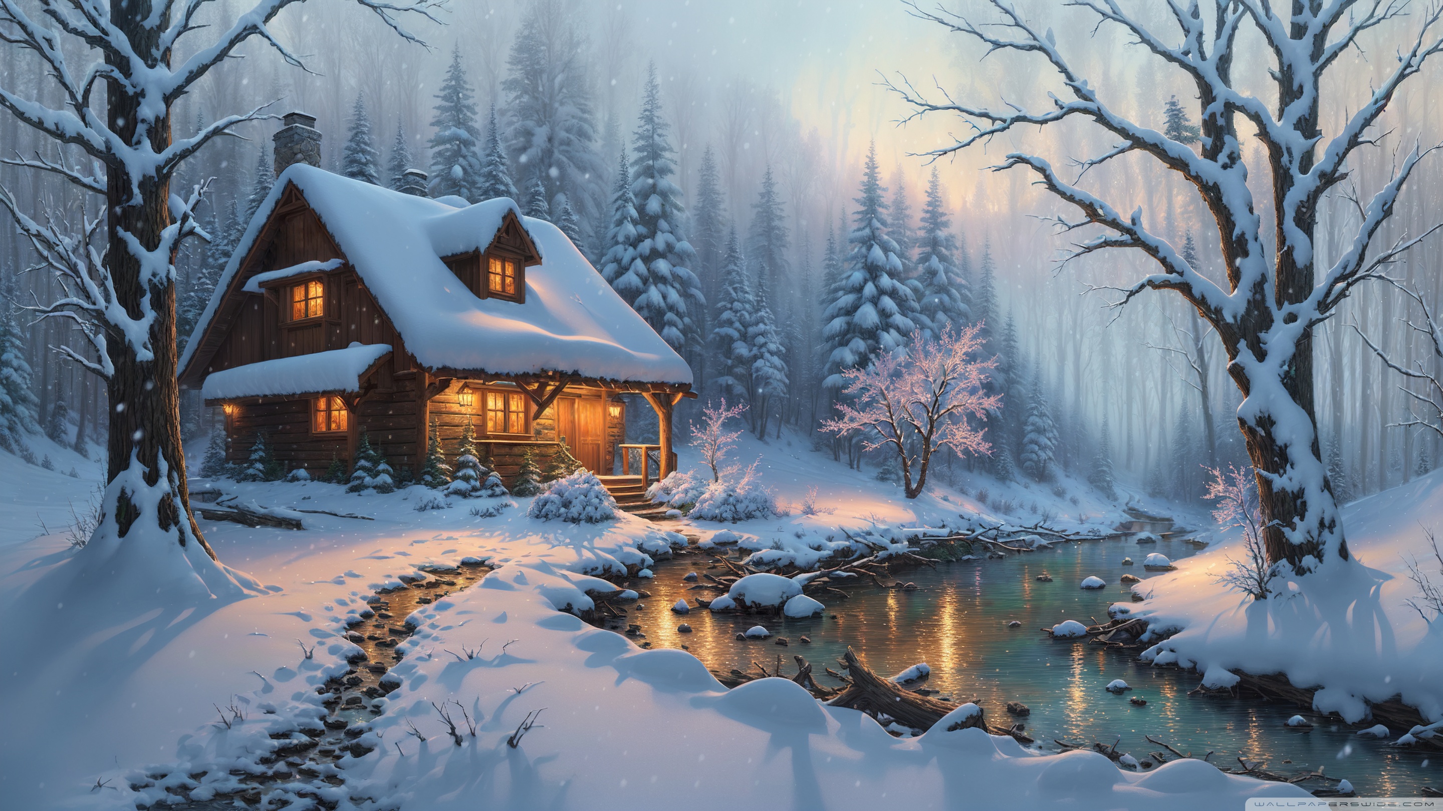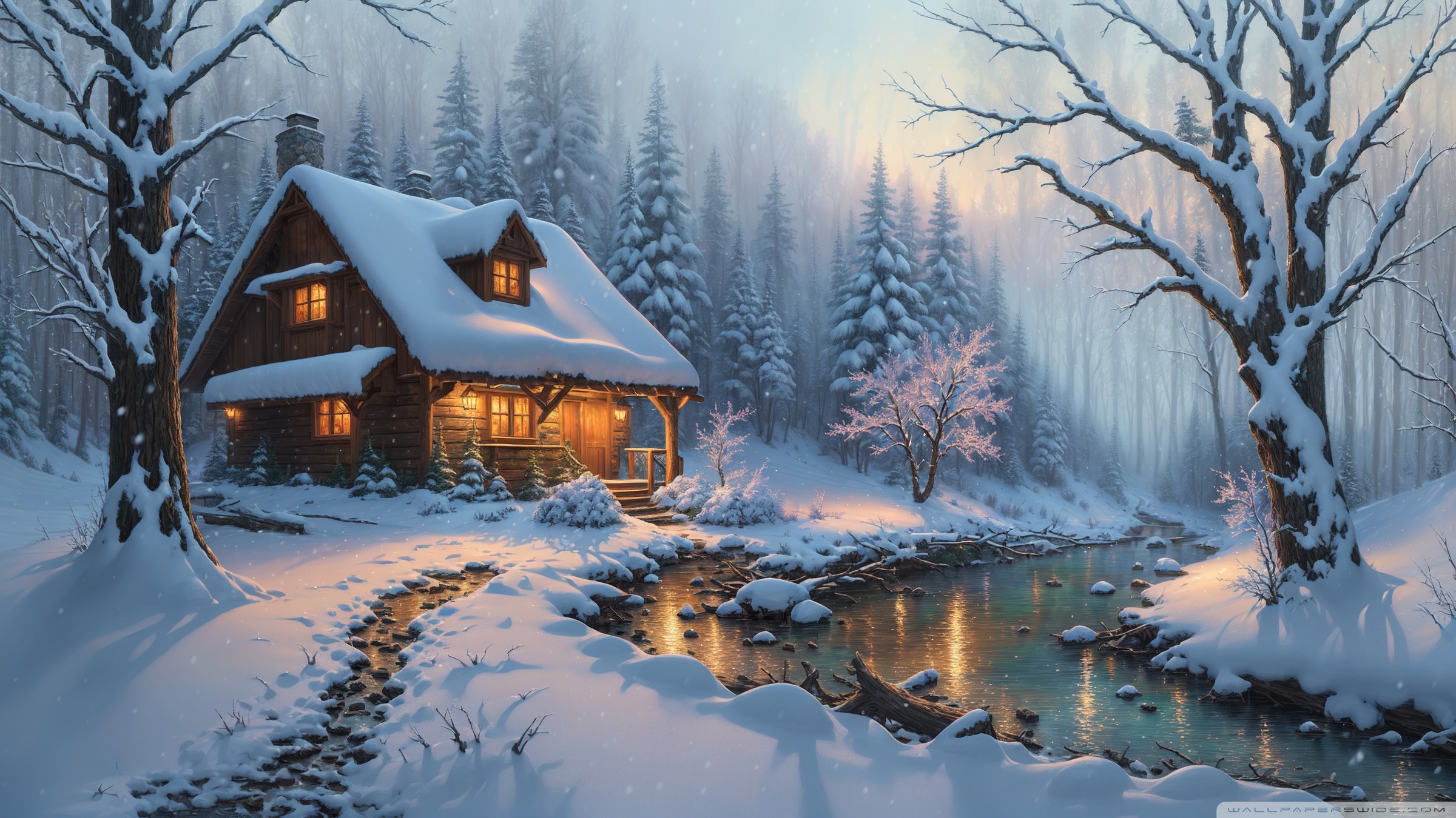 Download Snowy Cabin by the Woodland Stream Illustration 4K UHD Wallpaper