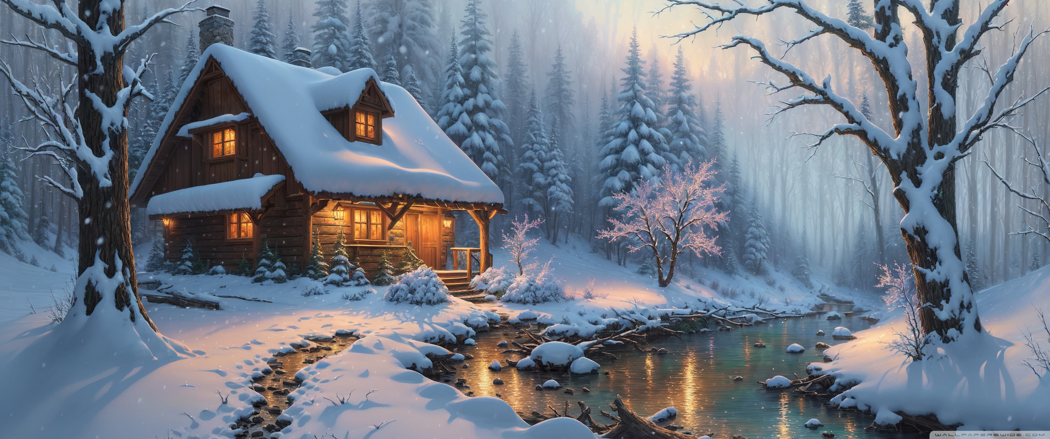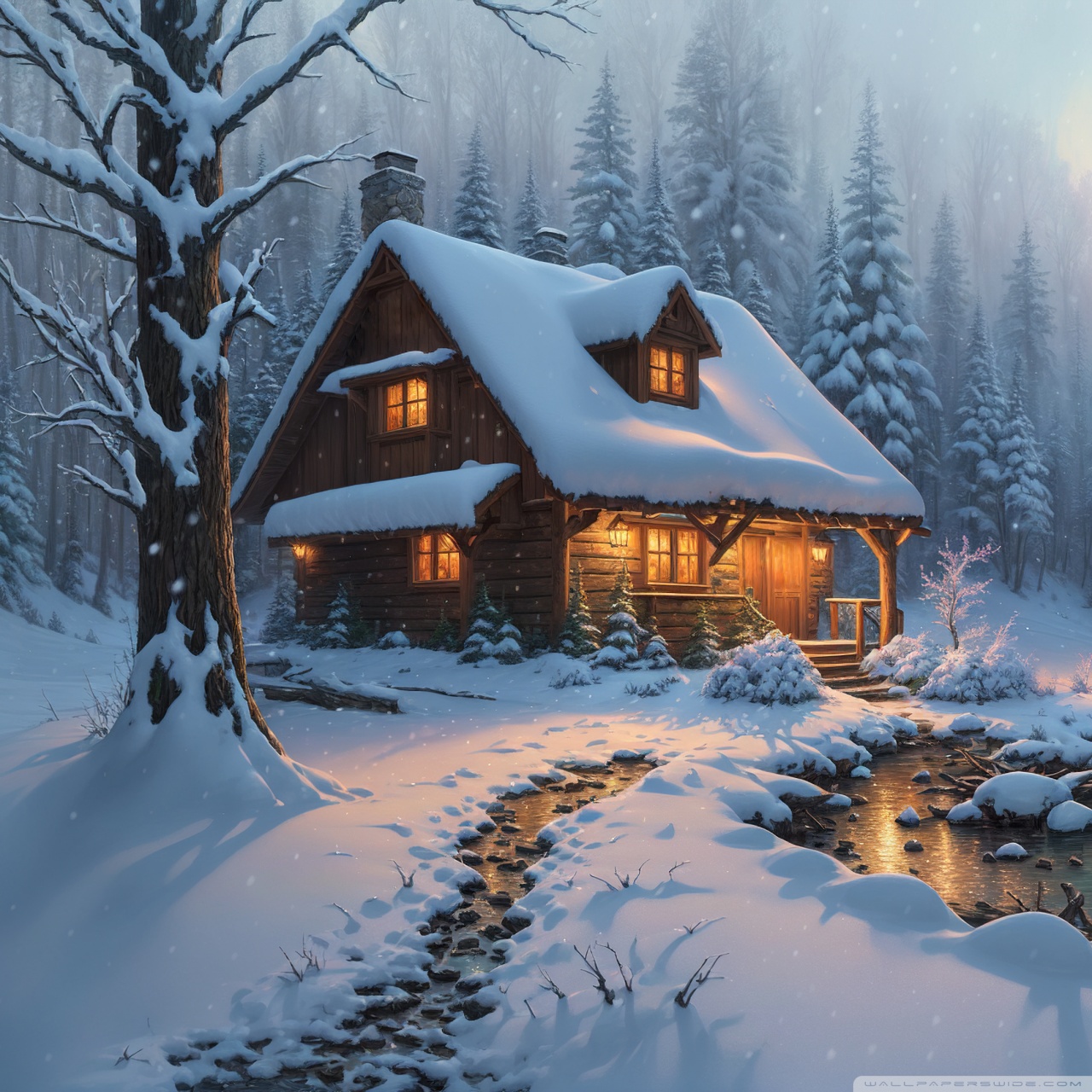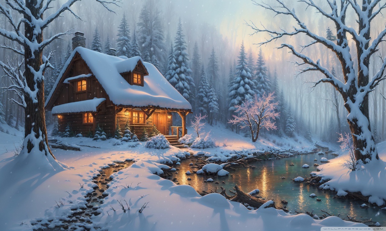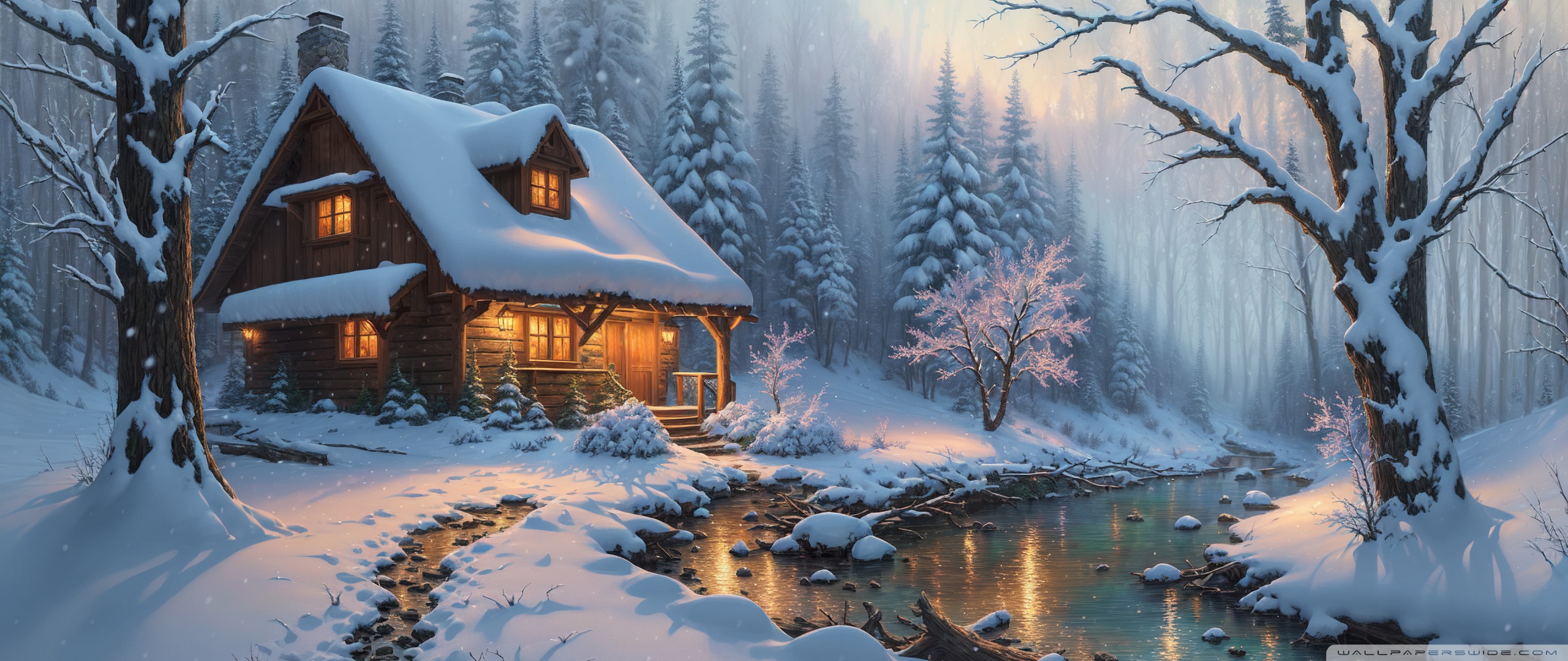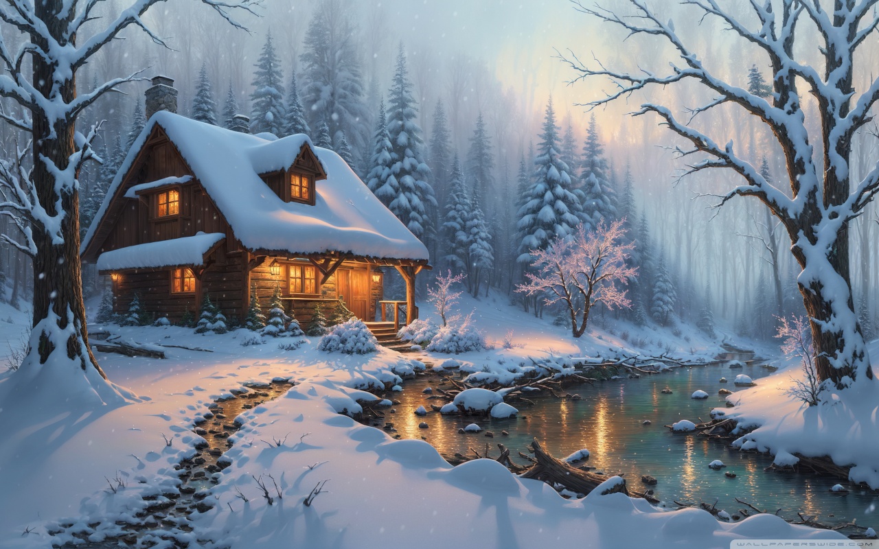 Download Snowy Cabin by the Woodland Stream Illustration 4K UHD Wallpaper