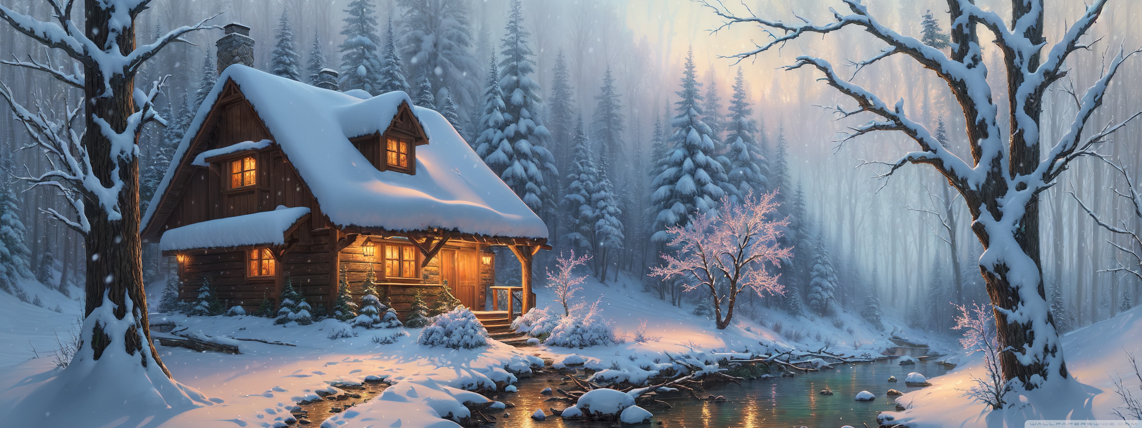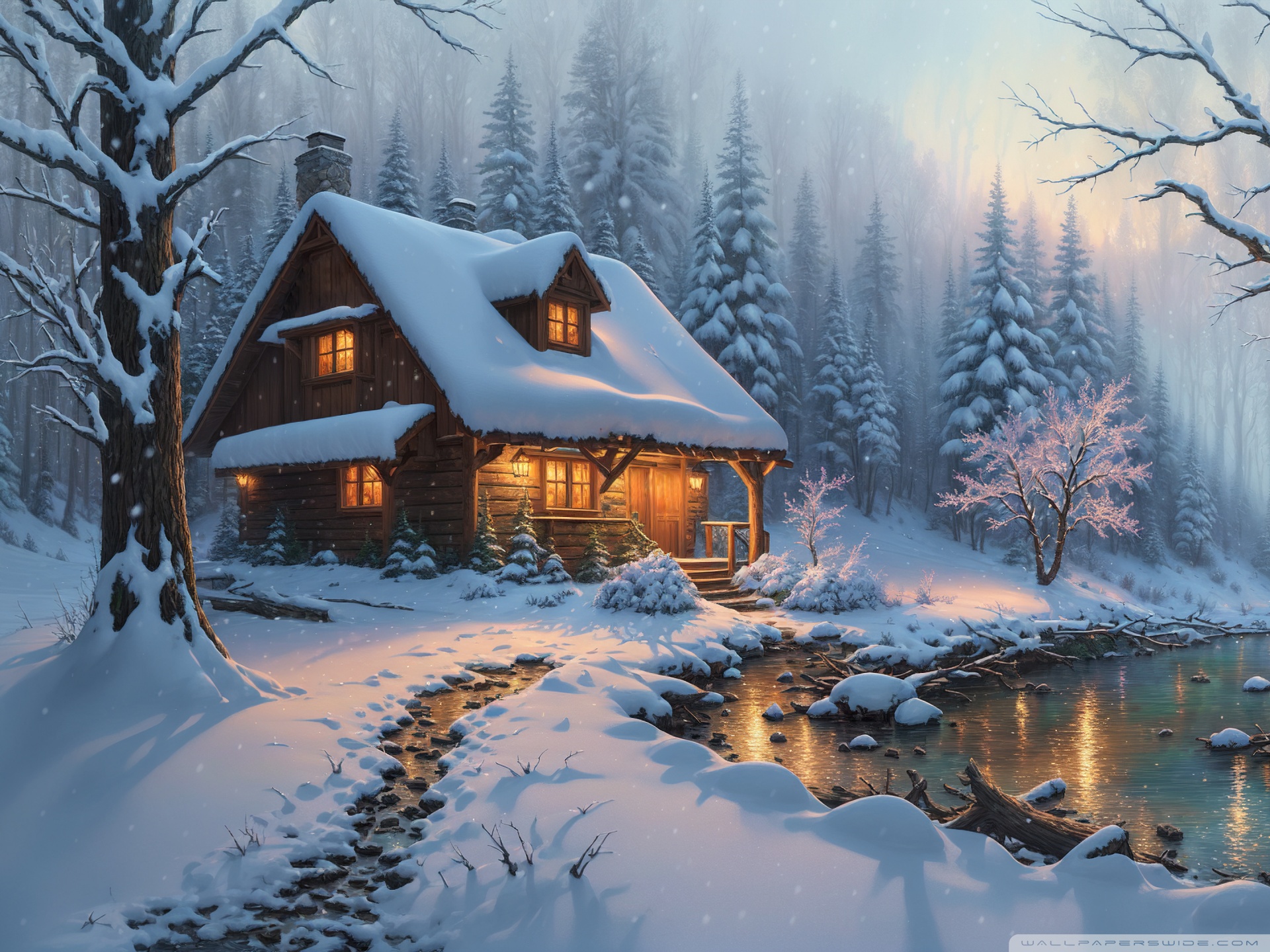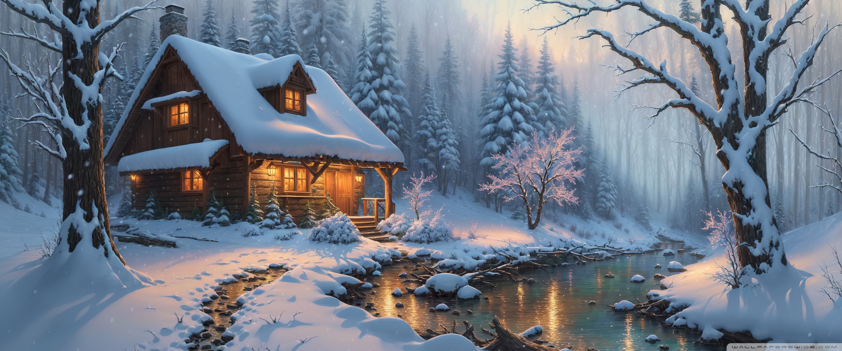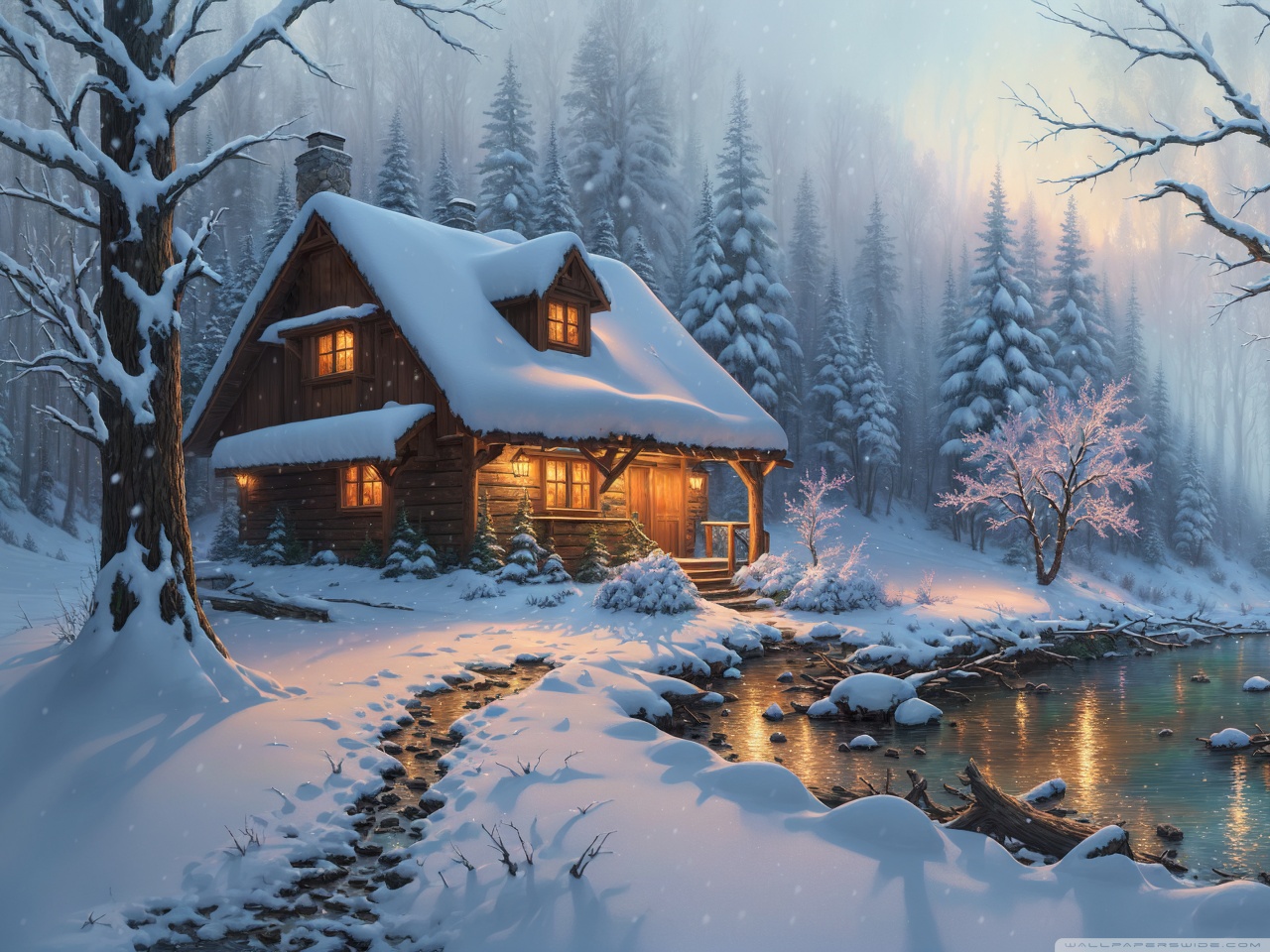 Download Snowy Cabin by the Woodland Stream Illustration 4K UHD Wallpaper