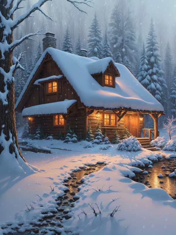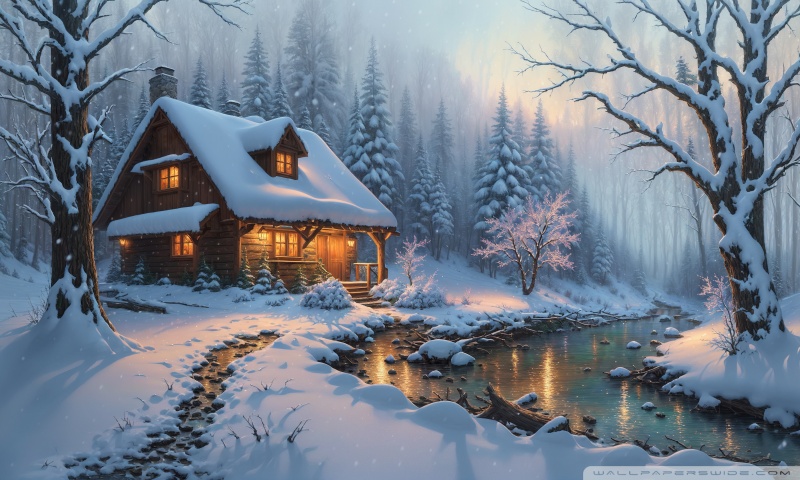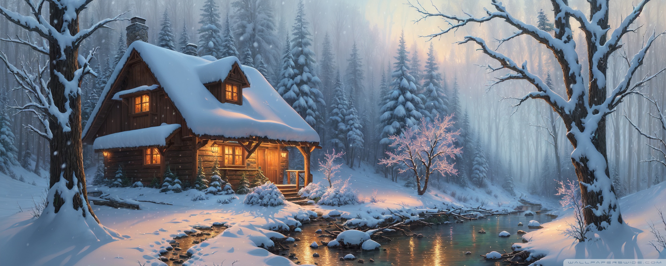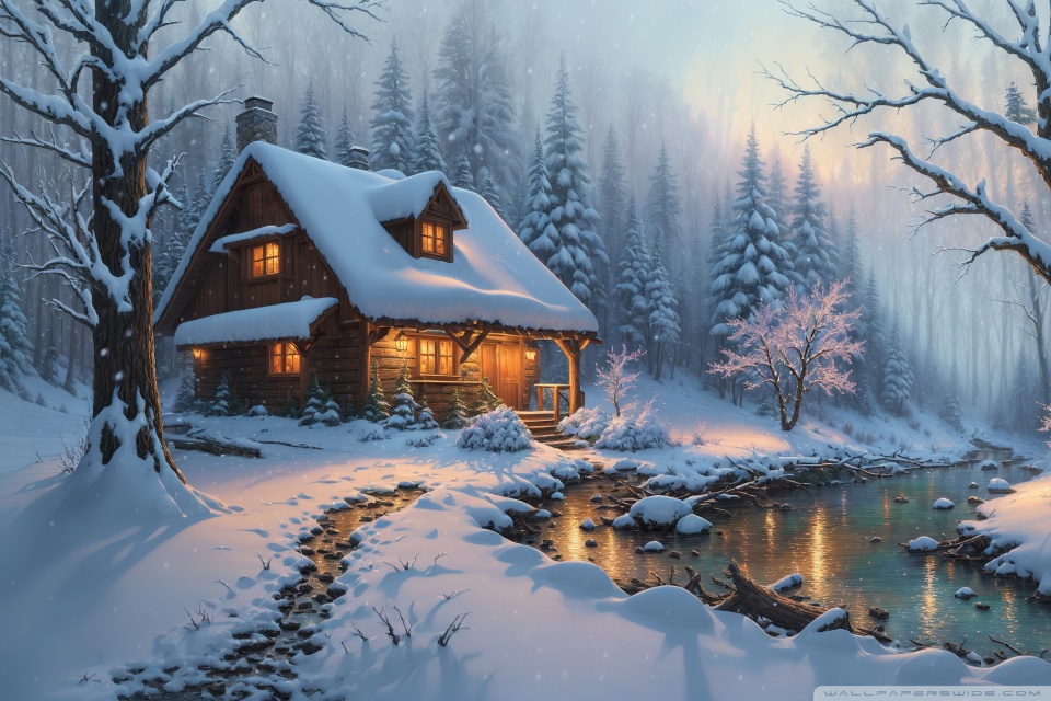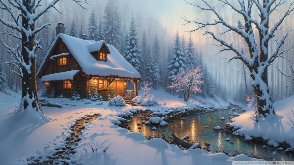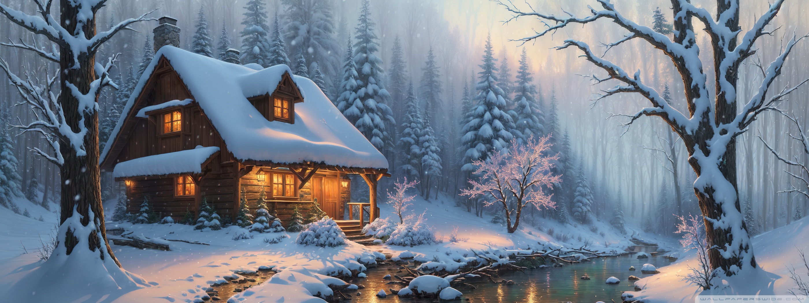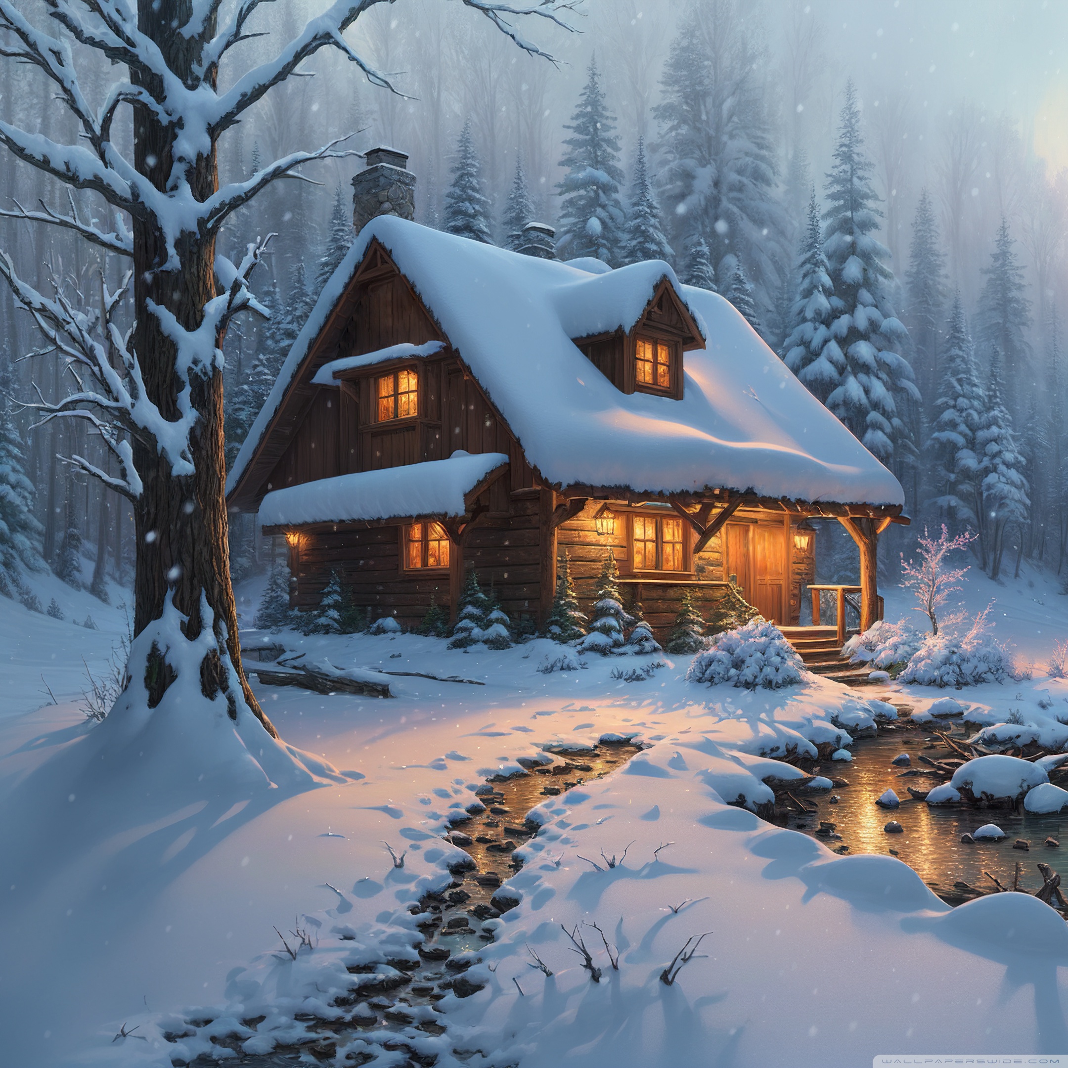 Download Snowy Cabin by the Woodland Stream Illustration 4K UHD Wallpaper