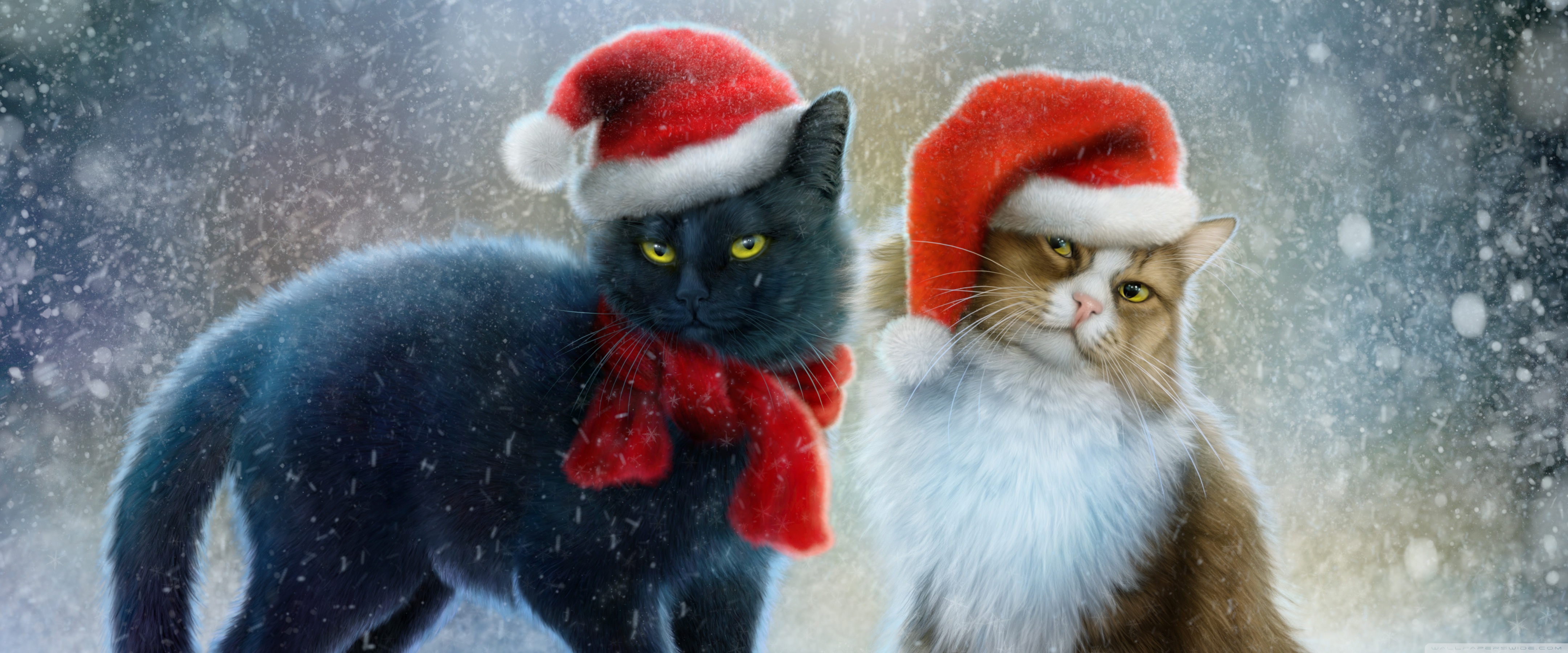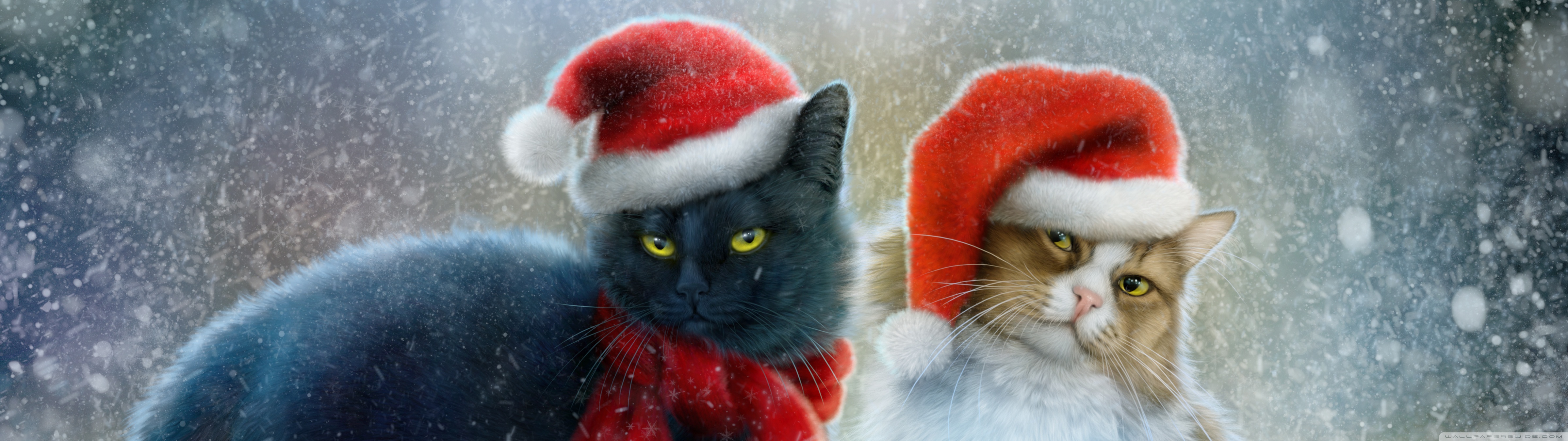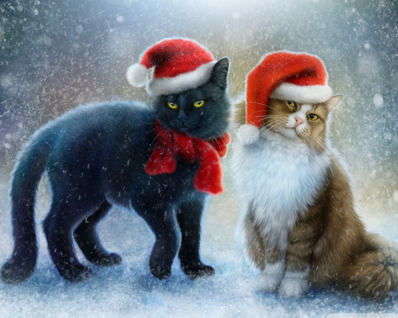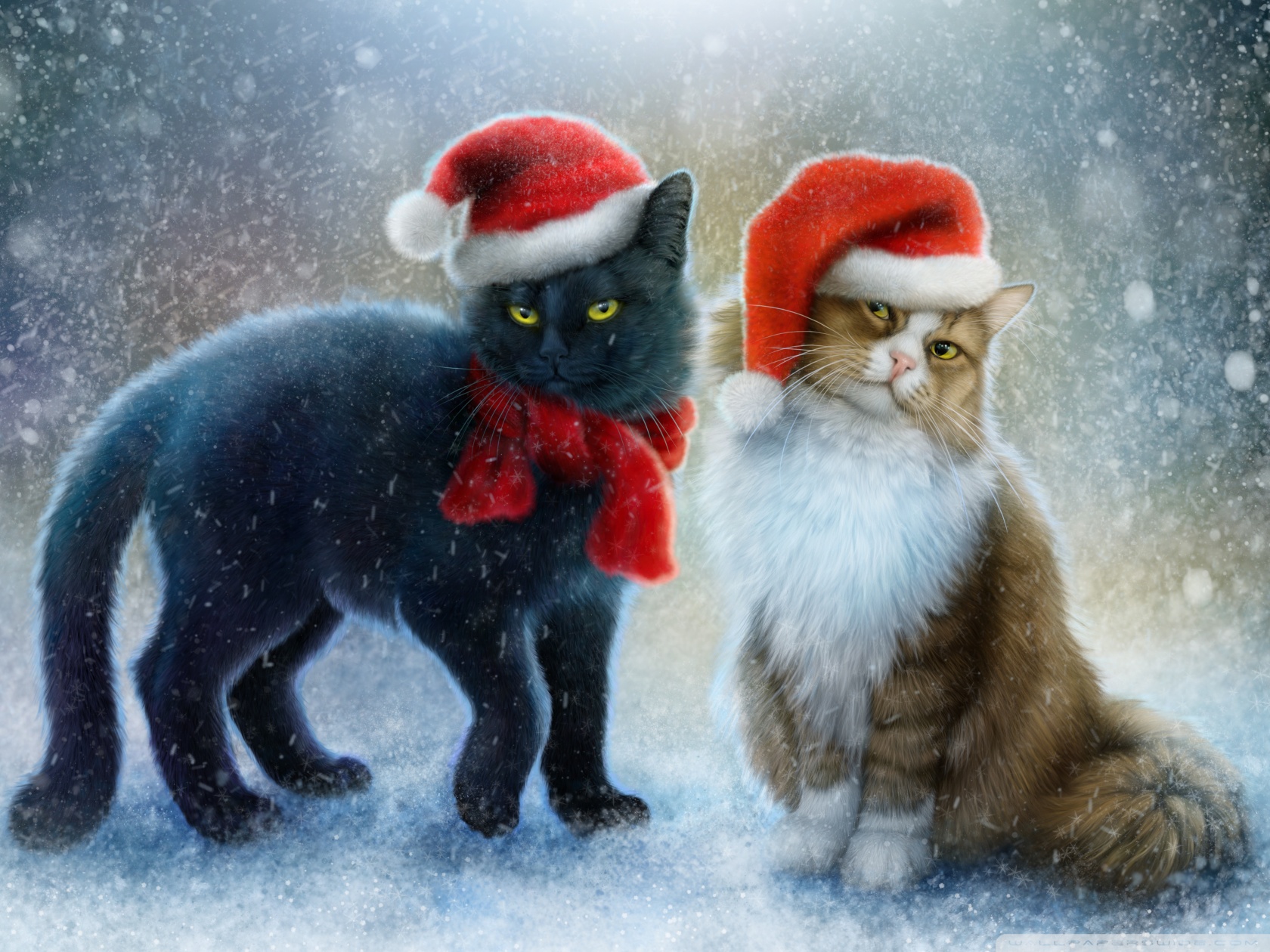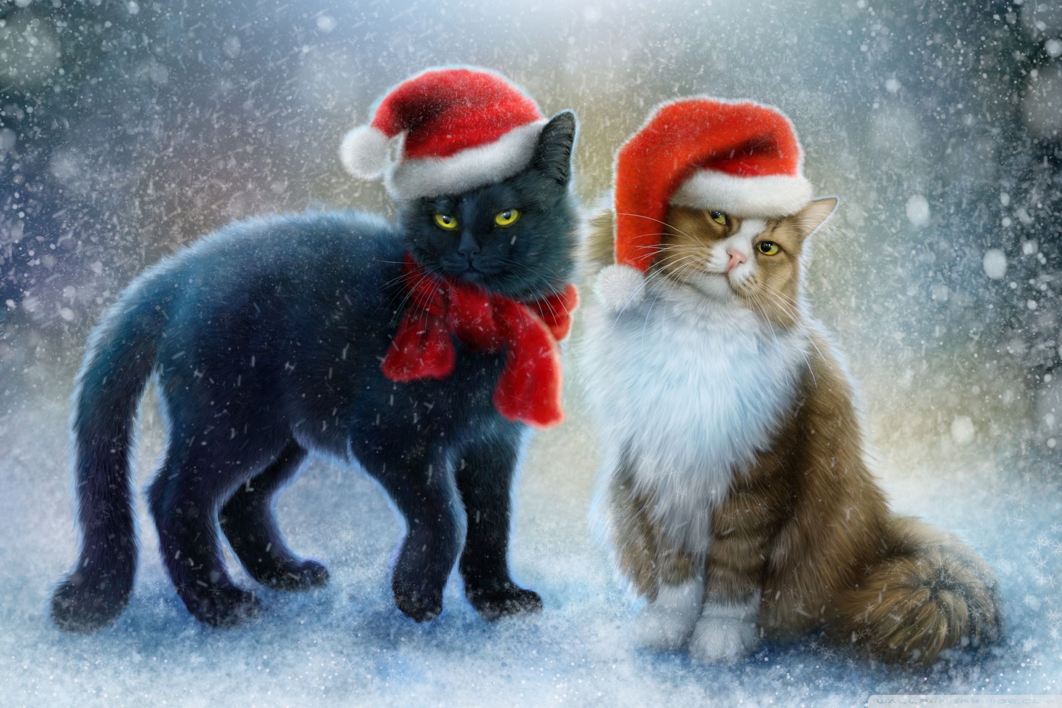 Download Snowy Christmas, Cats Wearing Santa Hats 4K UHD Wallpaper