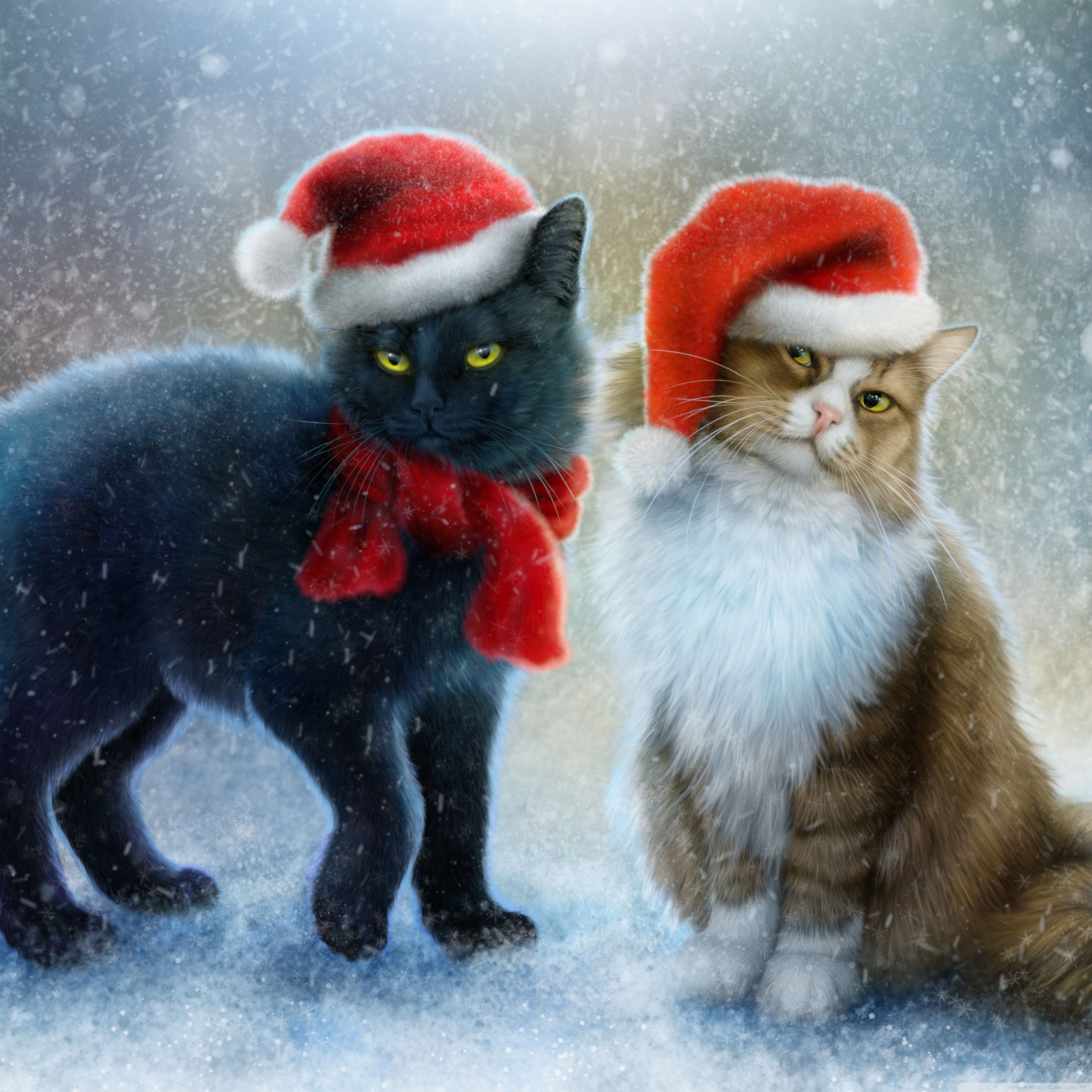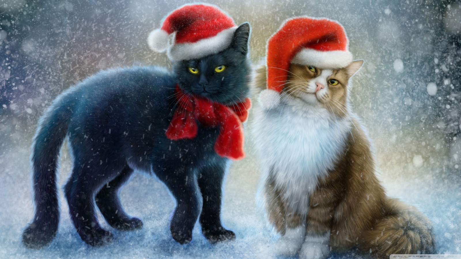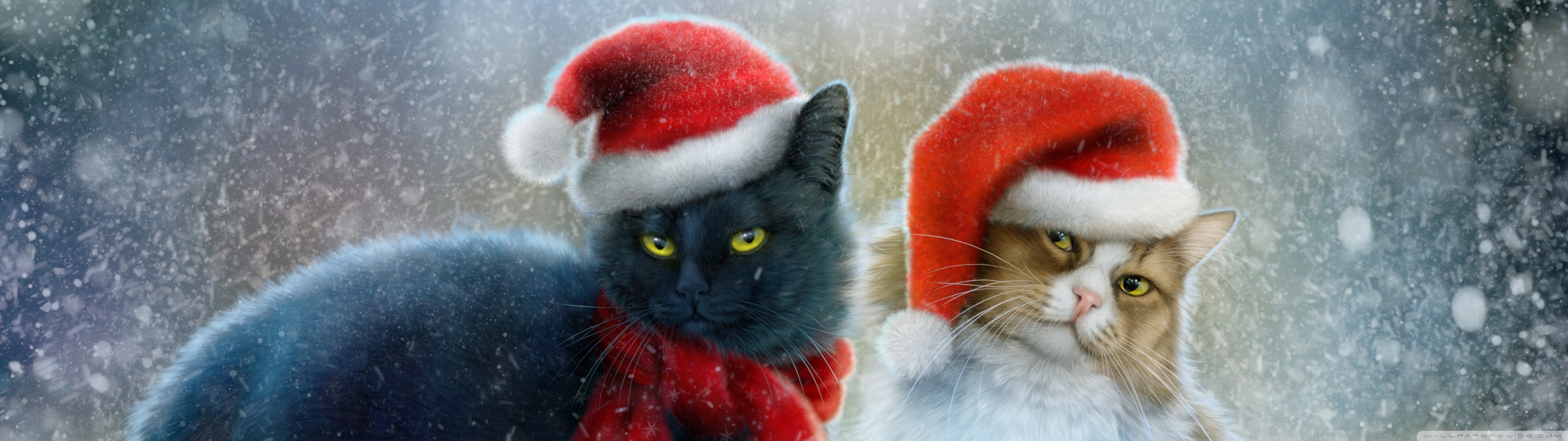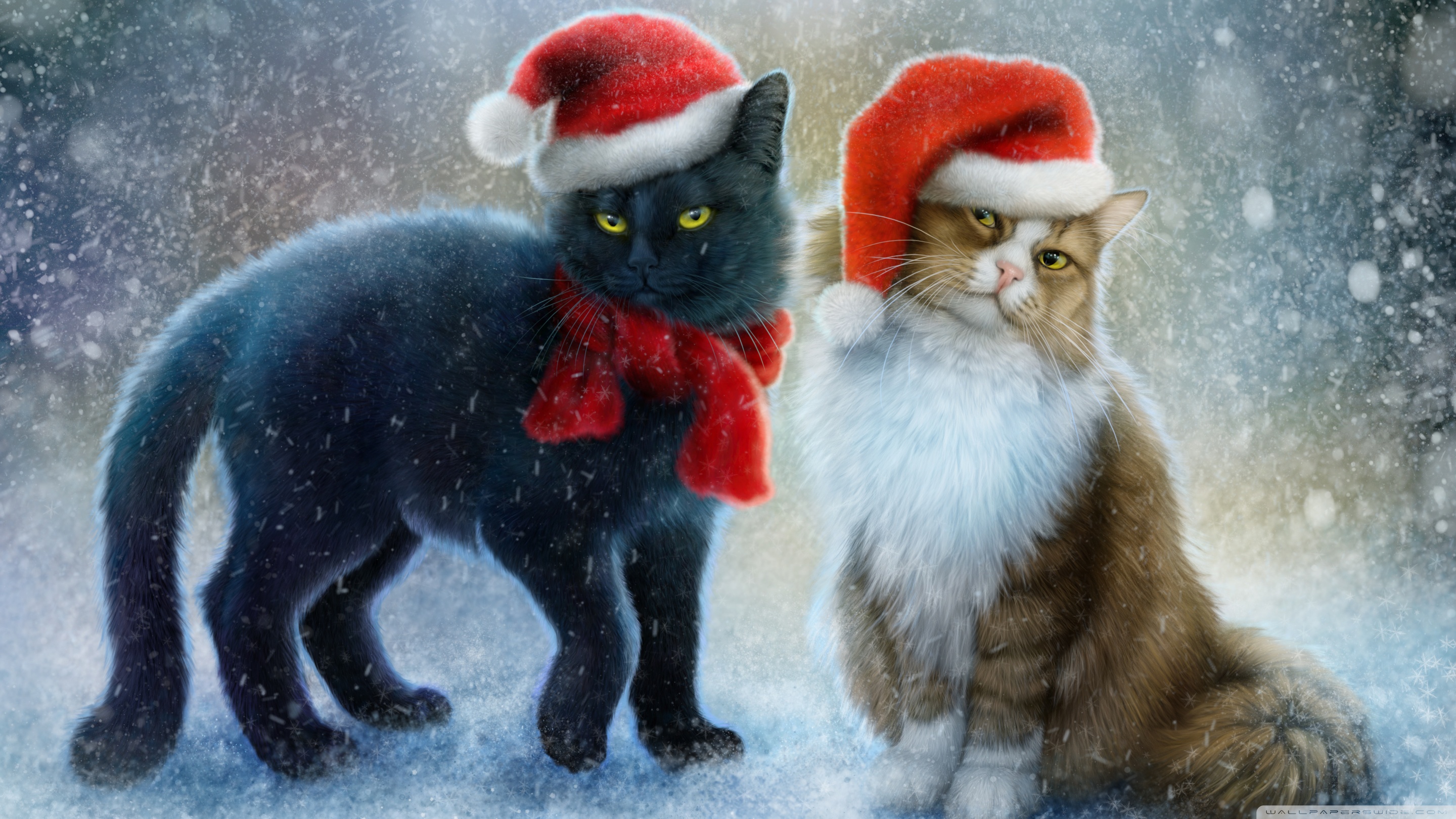 Download Snowy Christmas, Cats Wearing Santa Hats 4K UHD Wallpaper