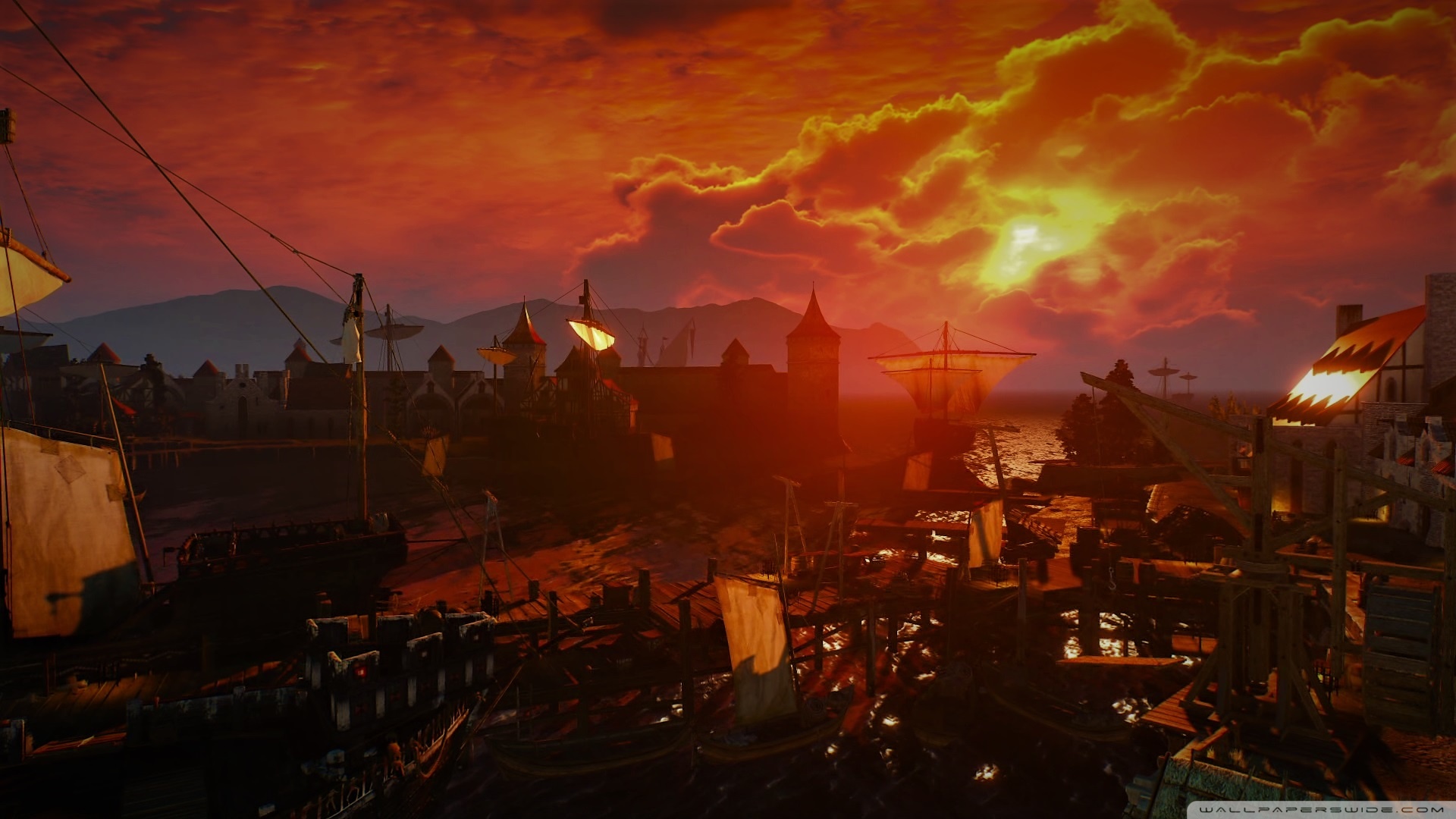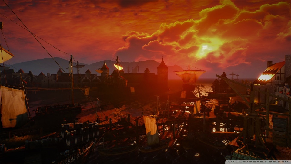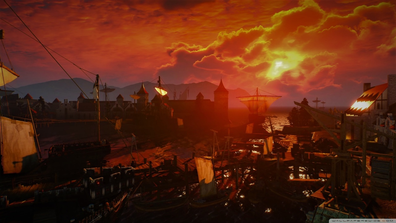 Description: Sunset in Witcher 3 Wild Hunt - screened from cutscene. Belongs to CD Project.