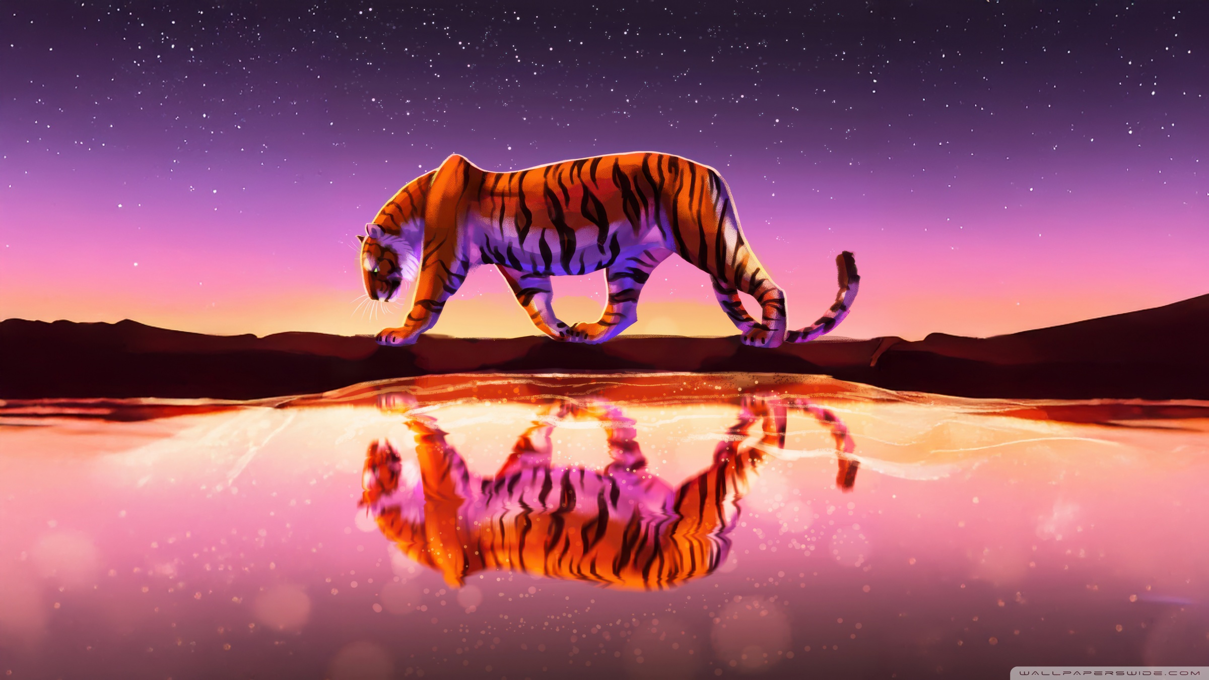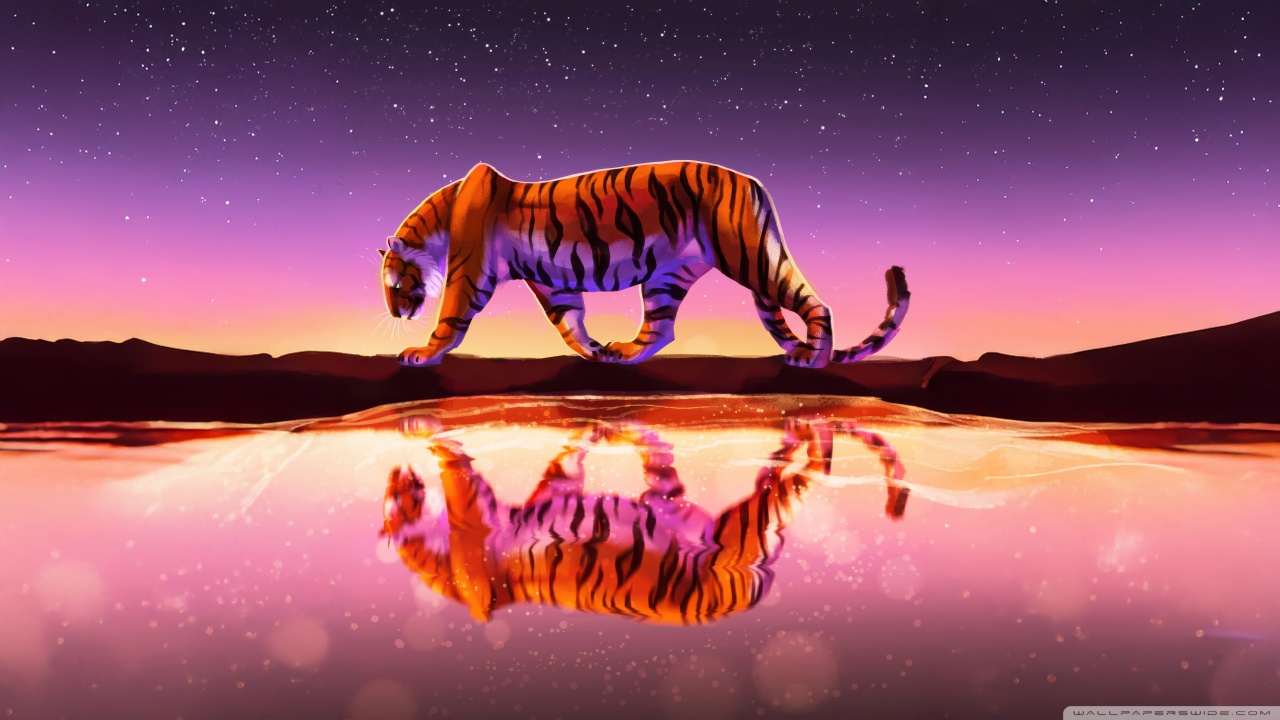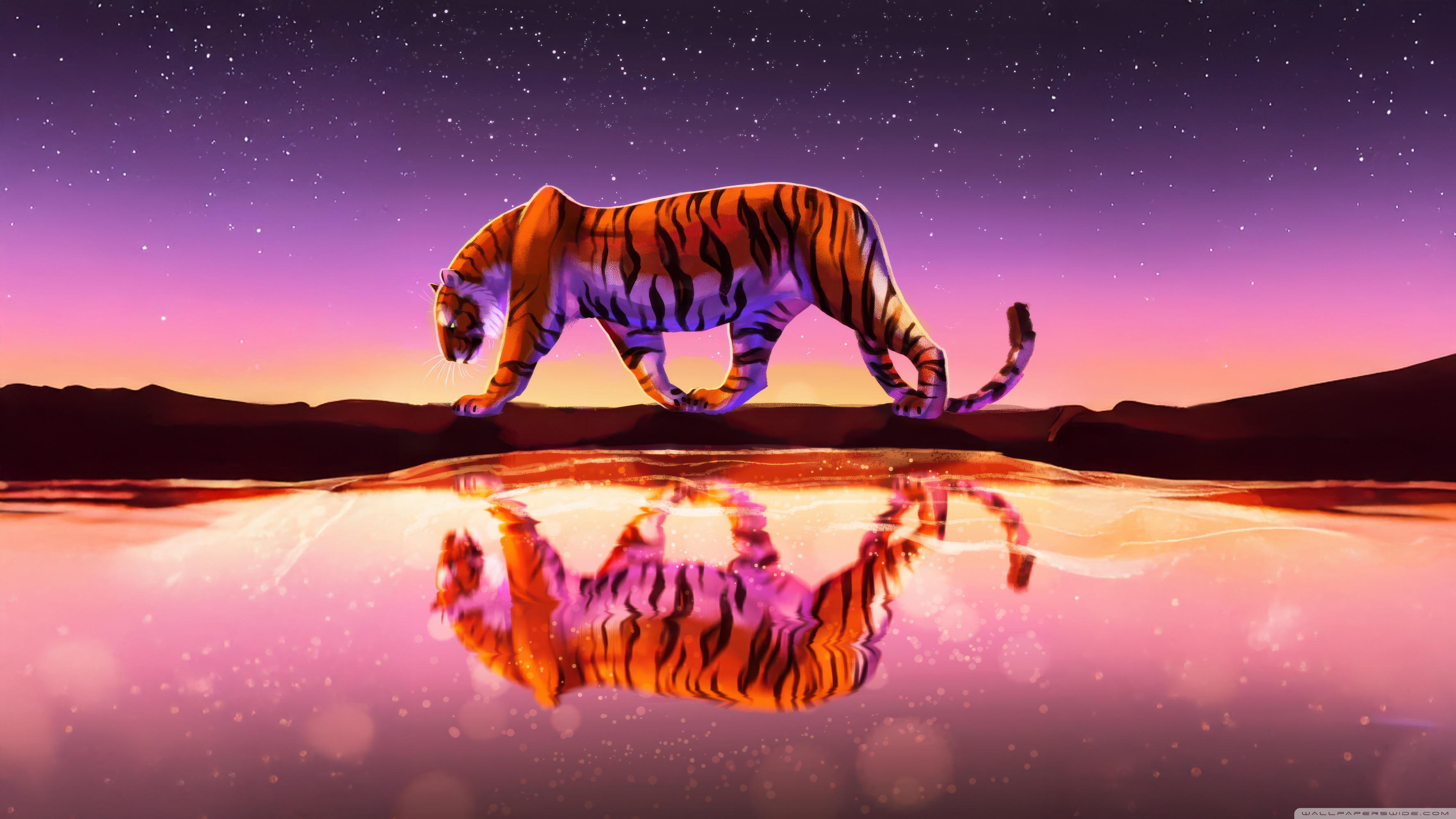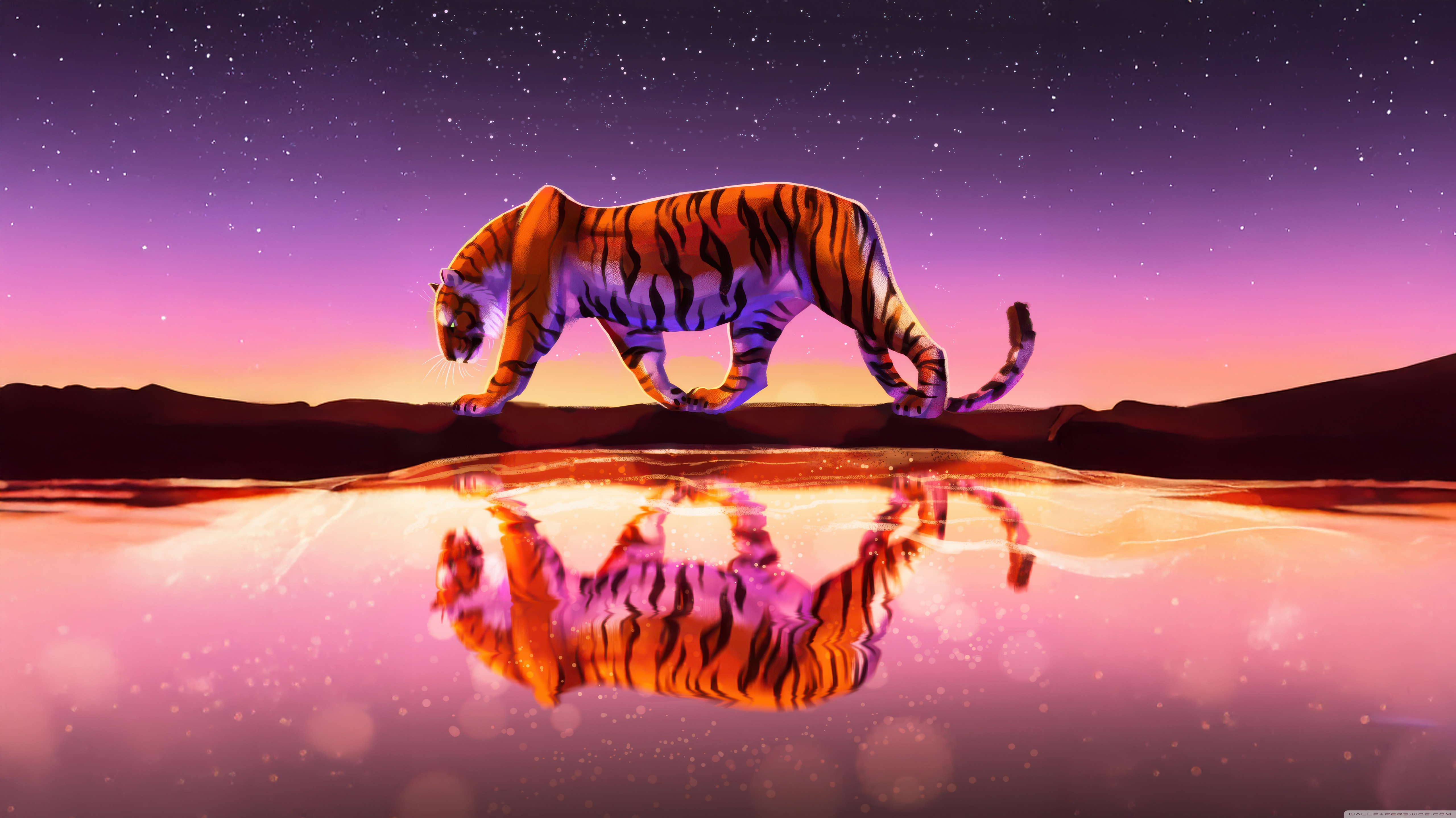 Download Tiger Reflected In Water Under Starry Sky 4K UHD Wallpaper