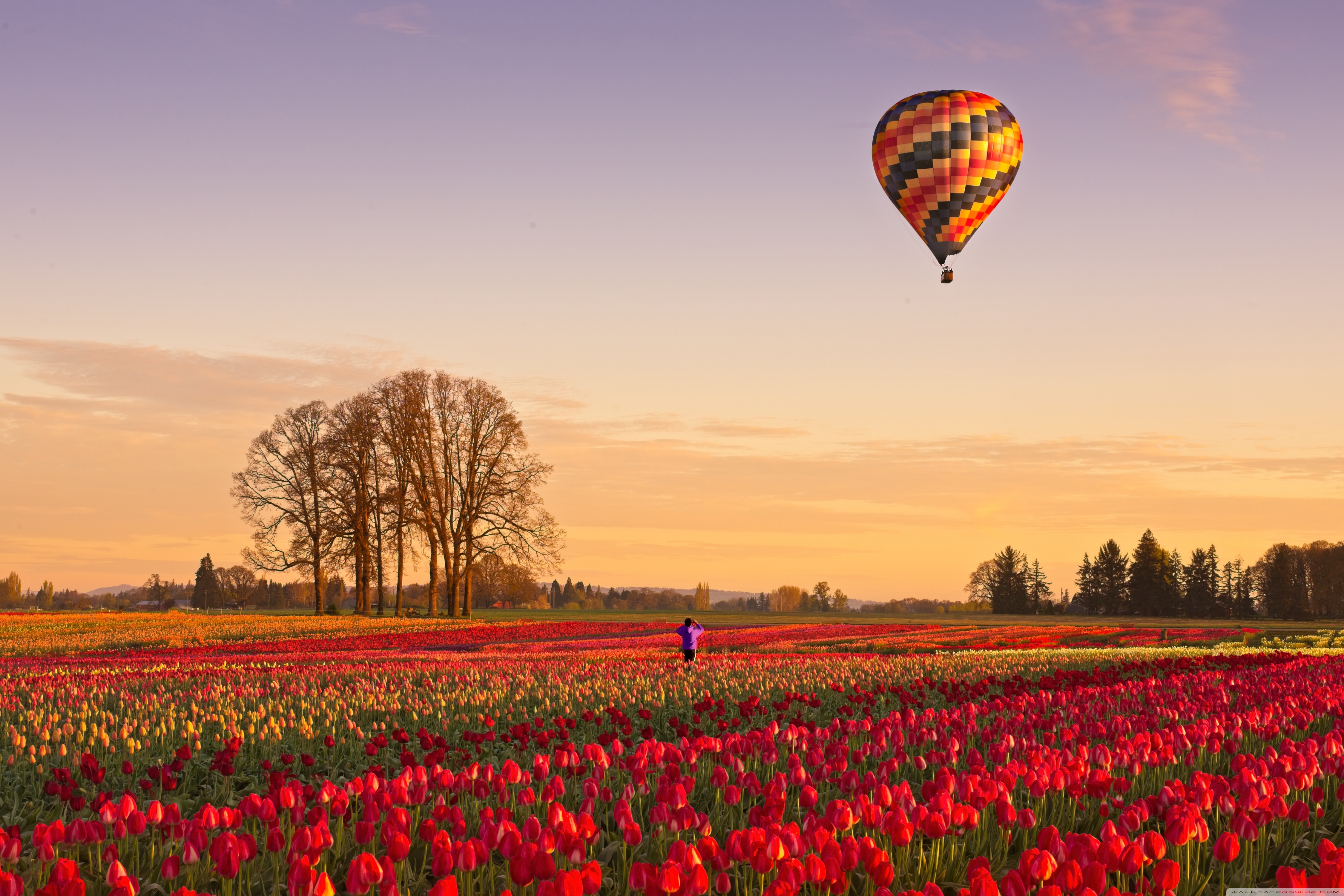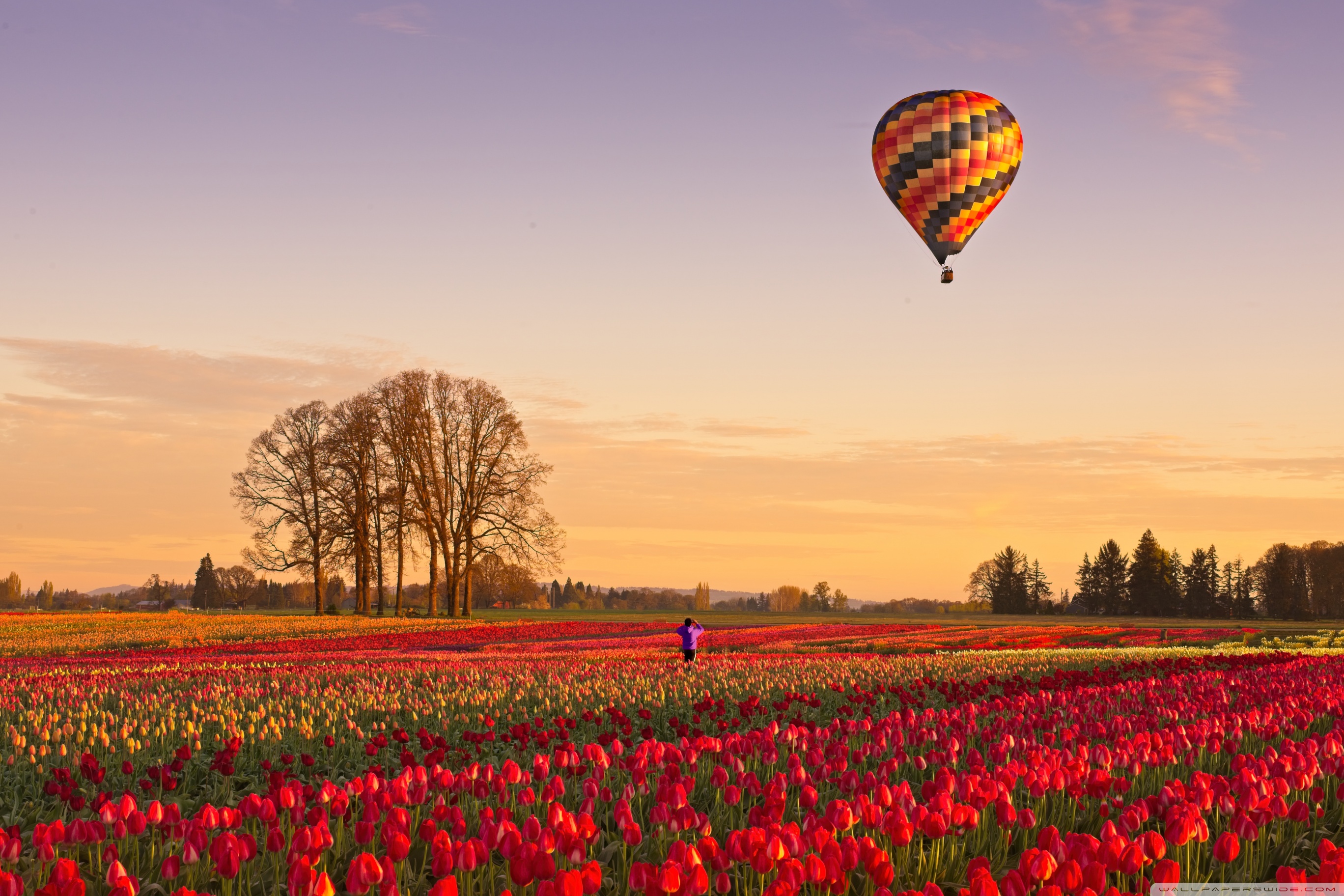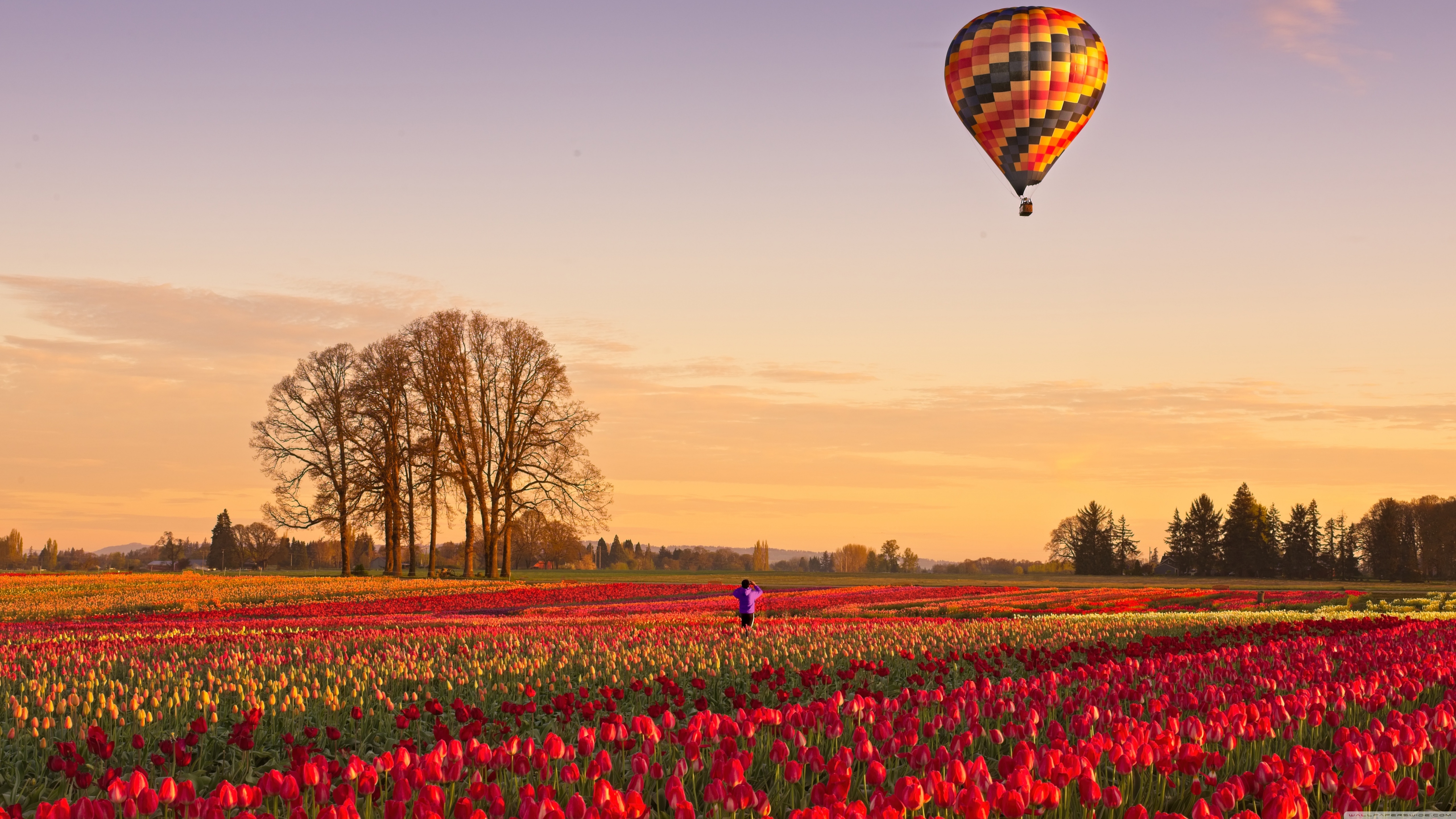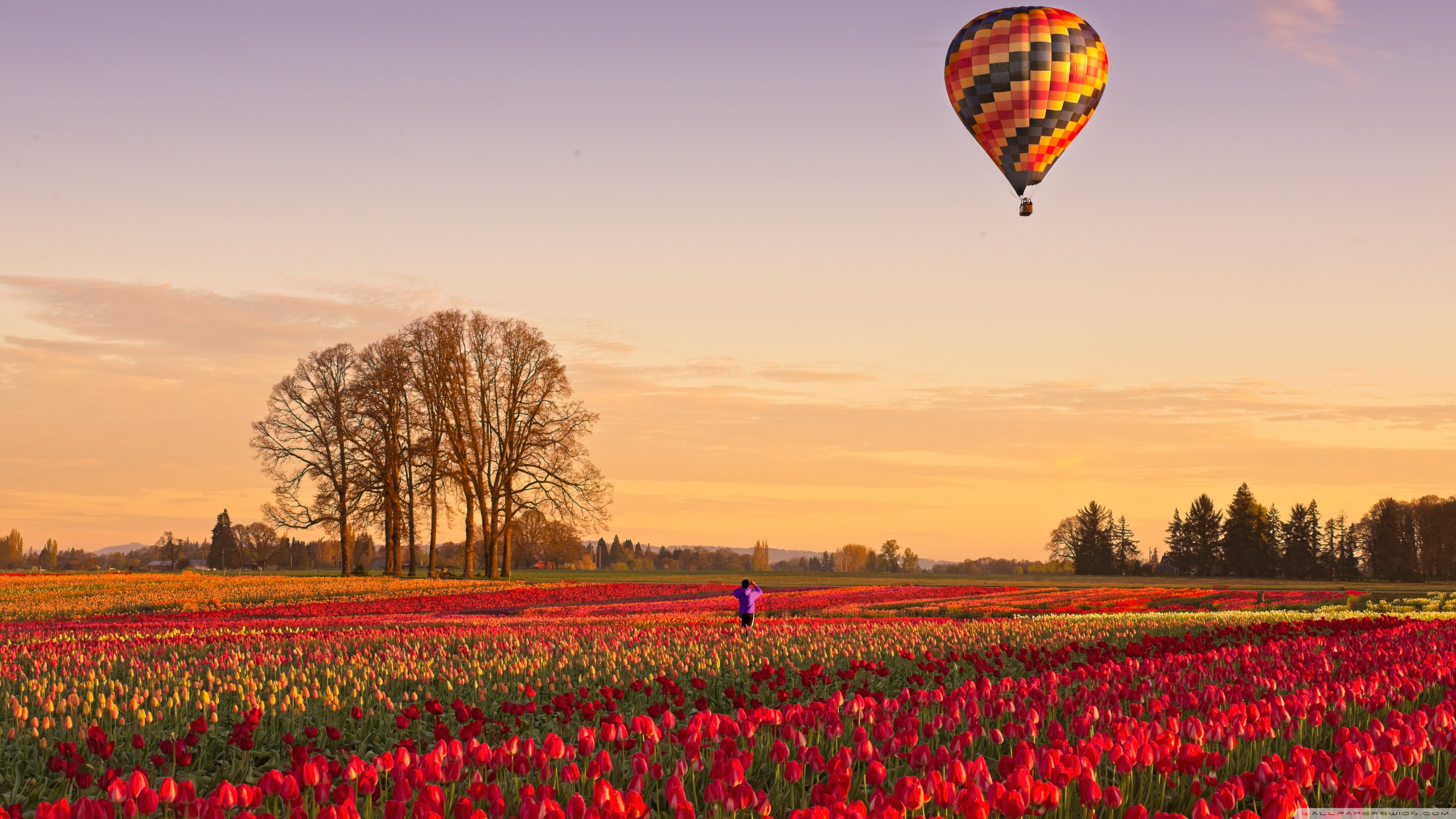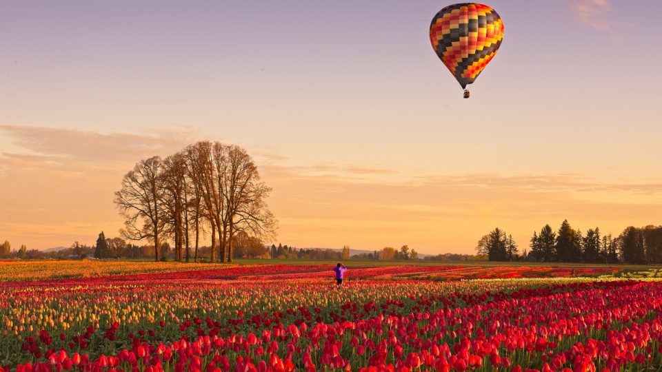 Download Tulip Fields at Sunrise with Hot Air Balloon 4K UHD Wallpaper