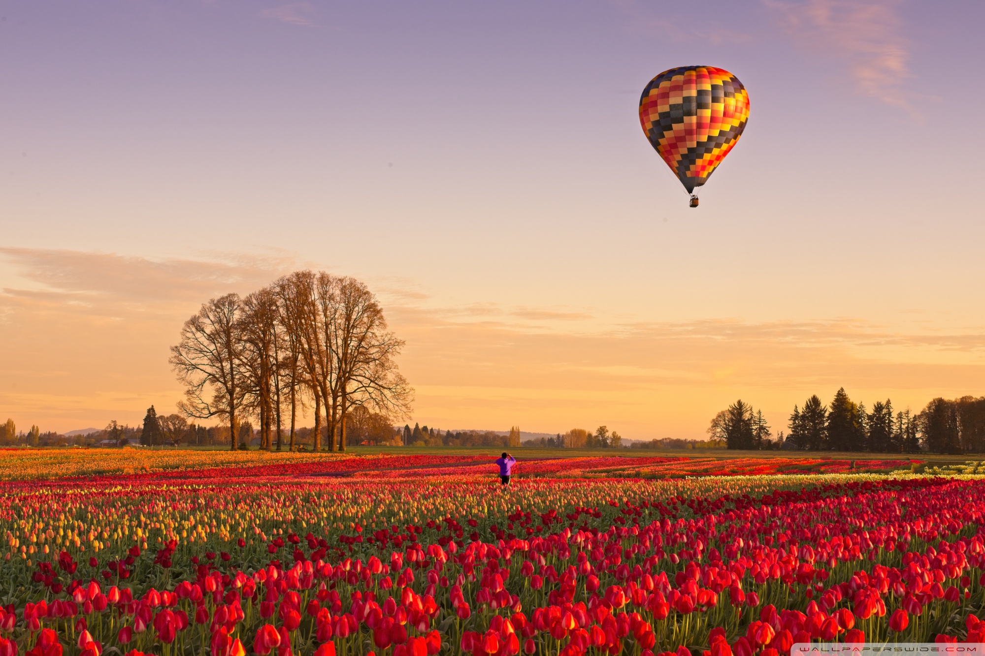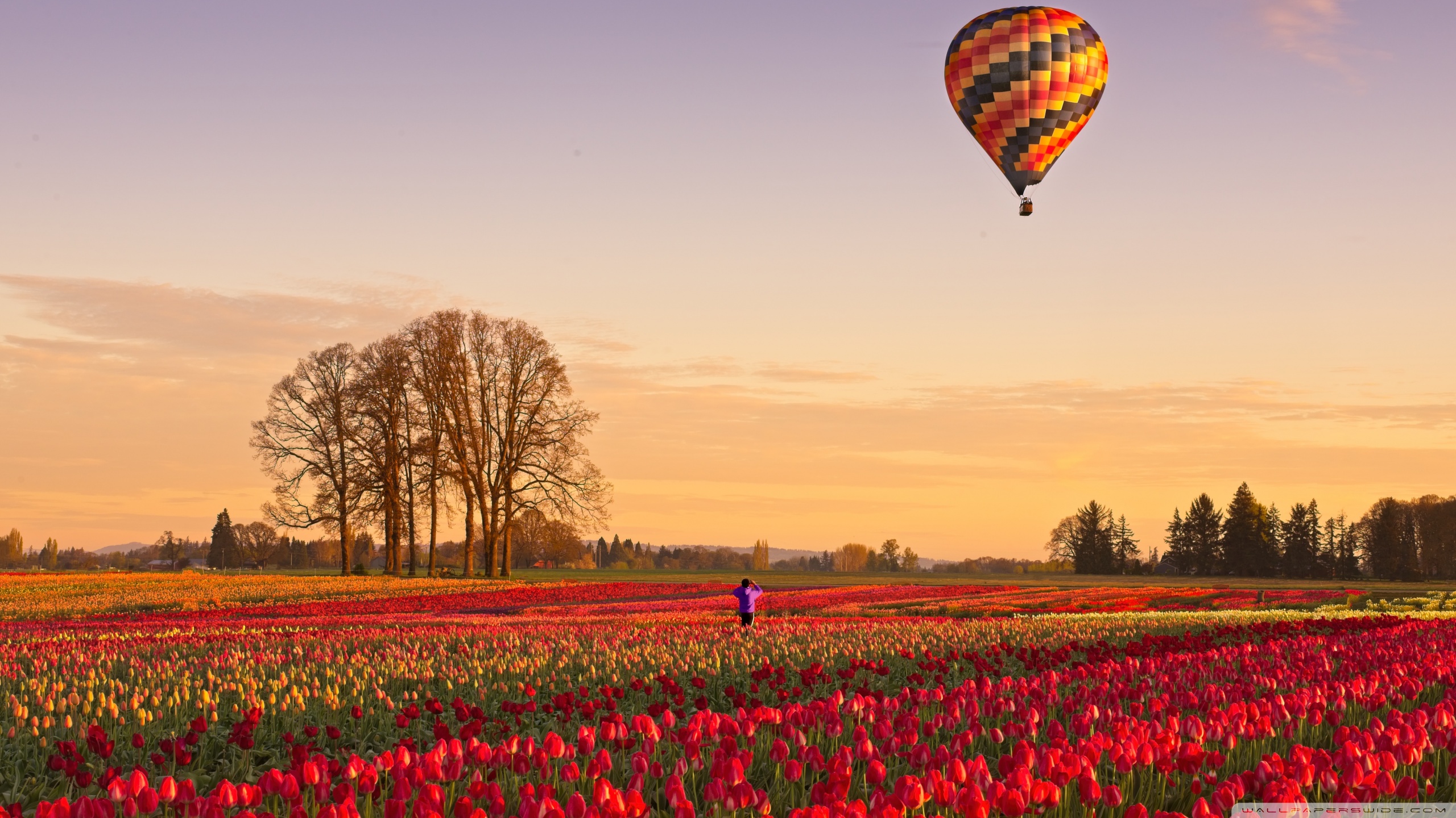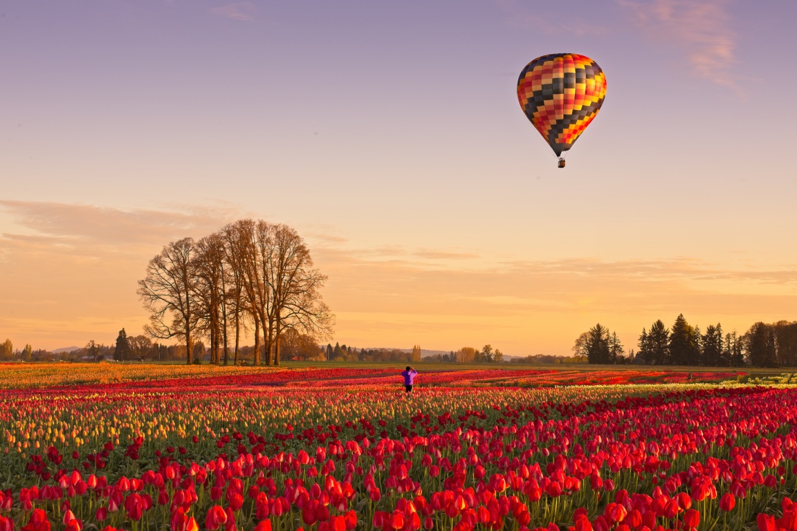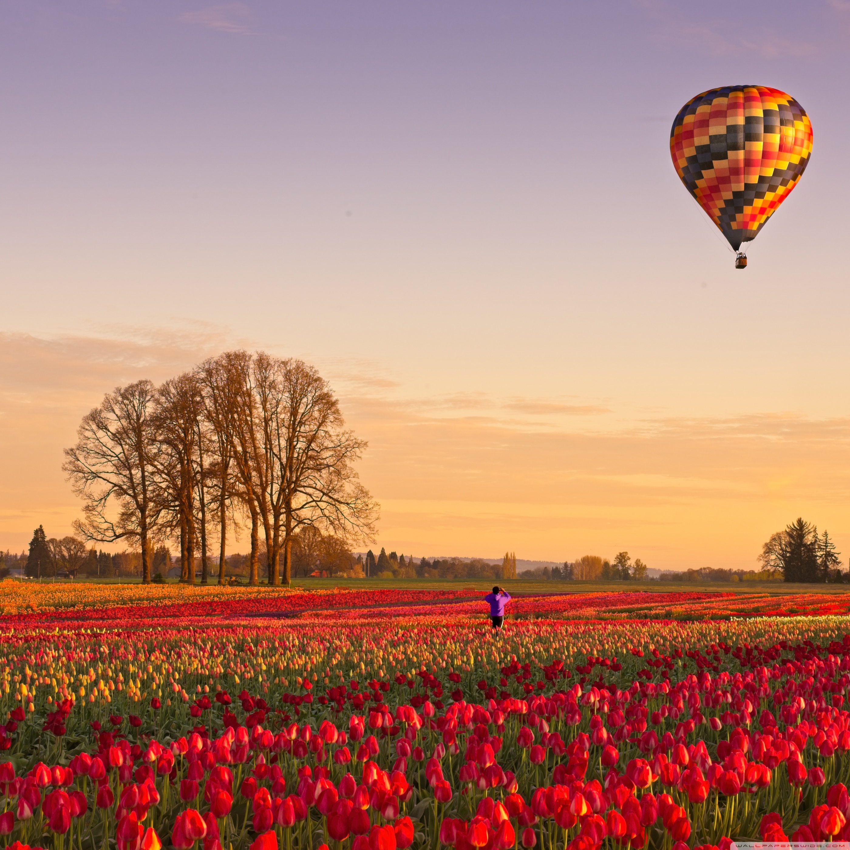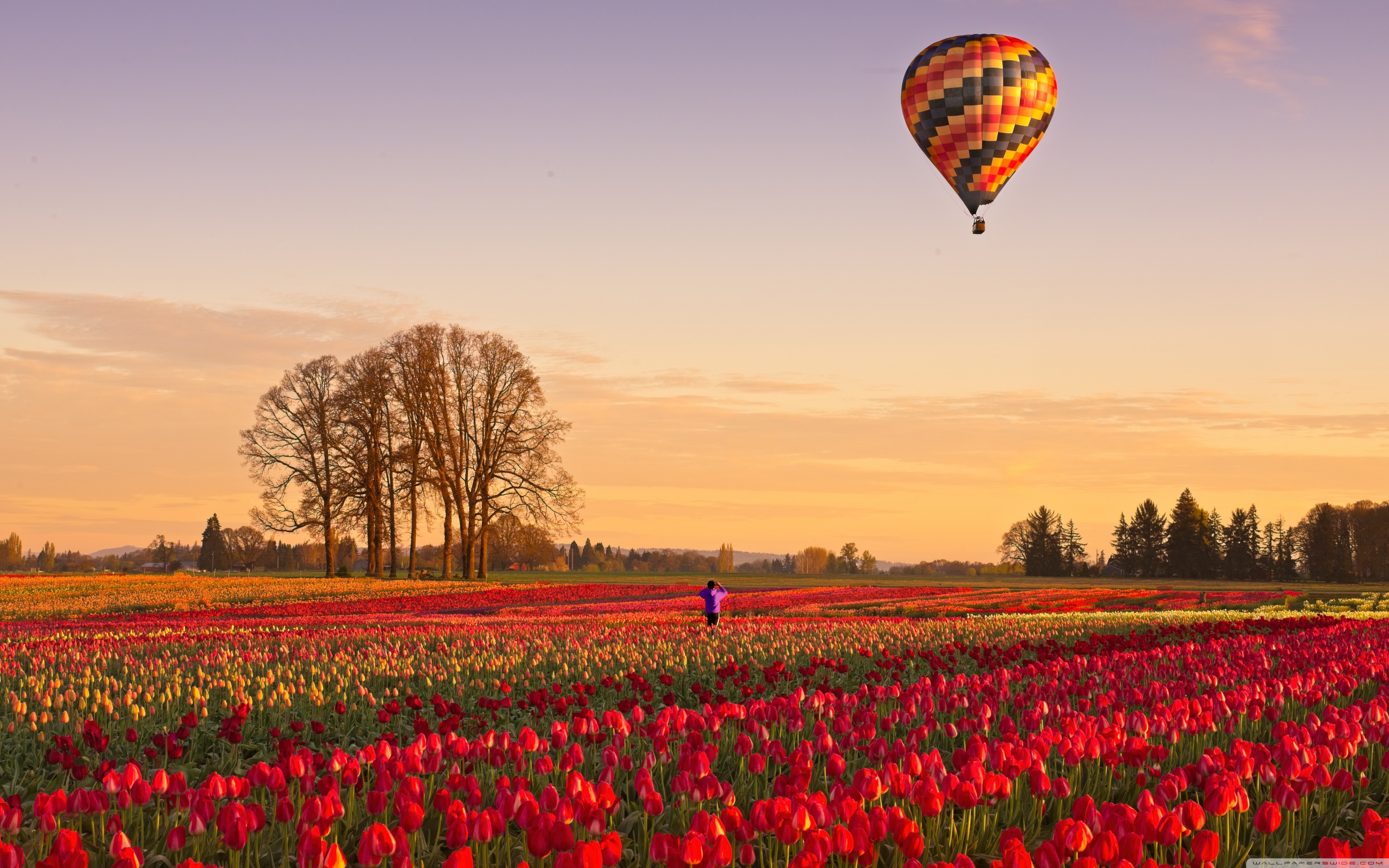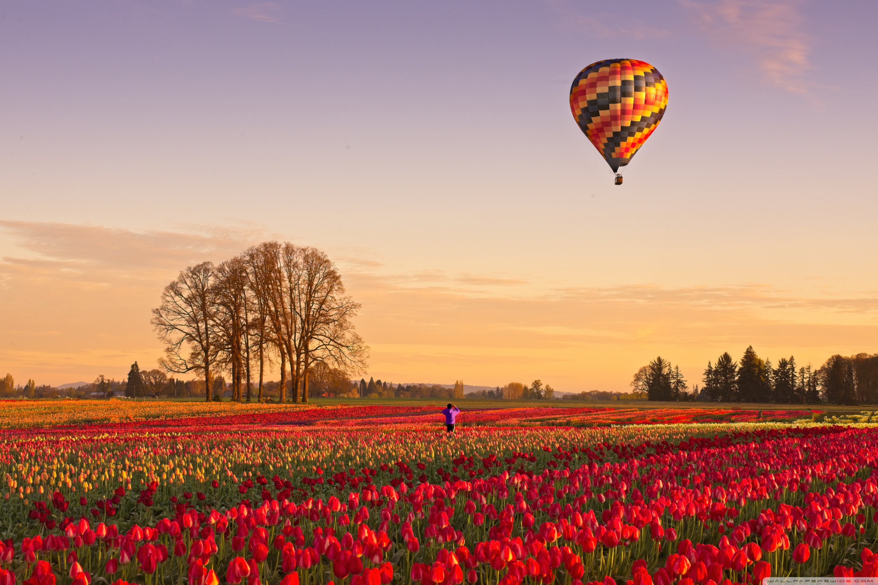 Download Tulip Fields at Sunrise with Hot Air Balloon 4K UHD Wallpaper