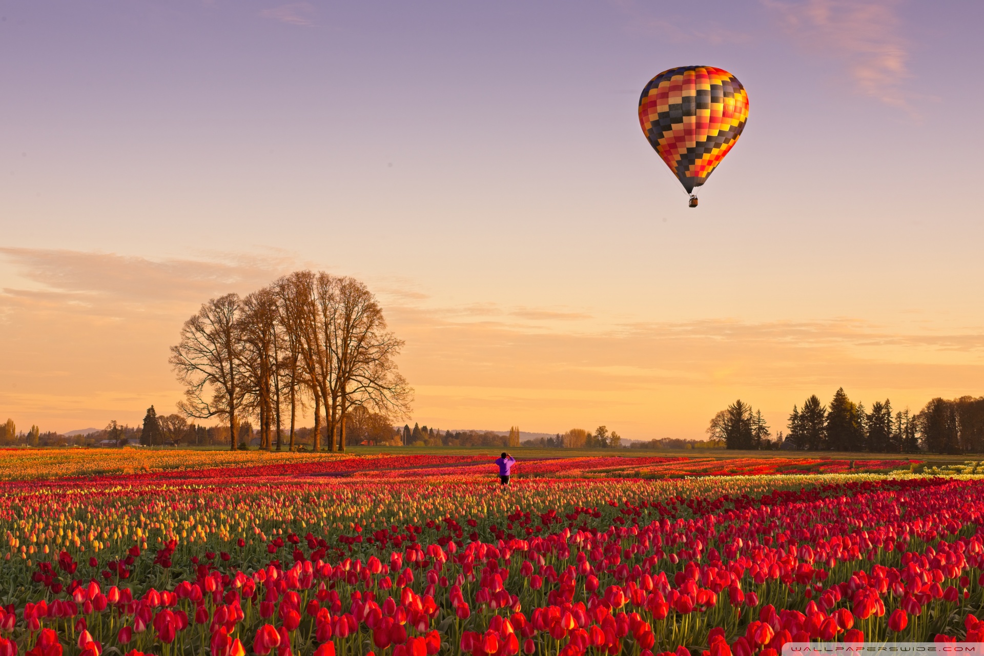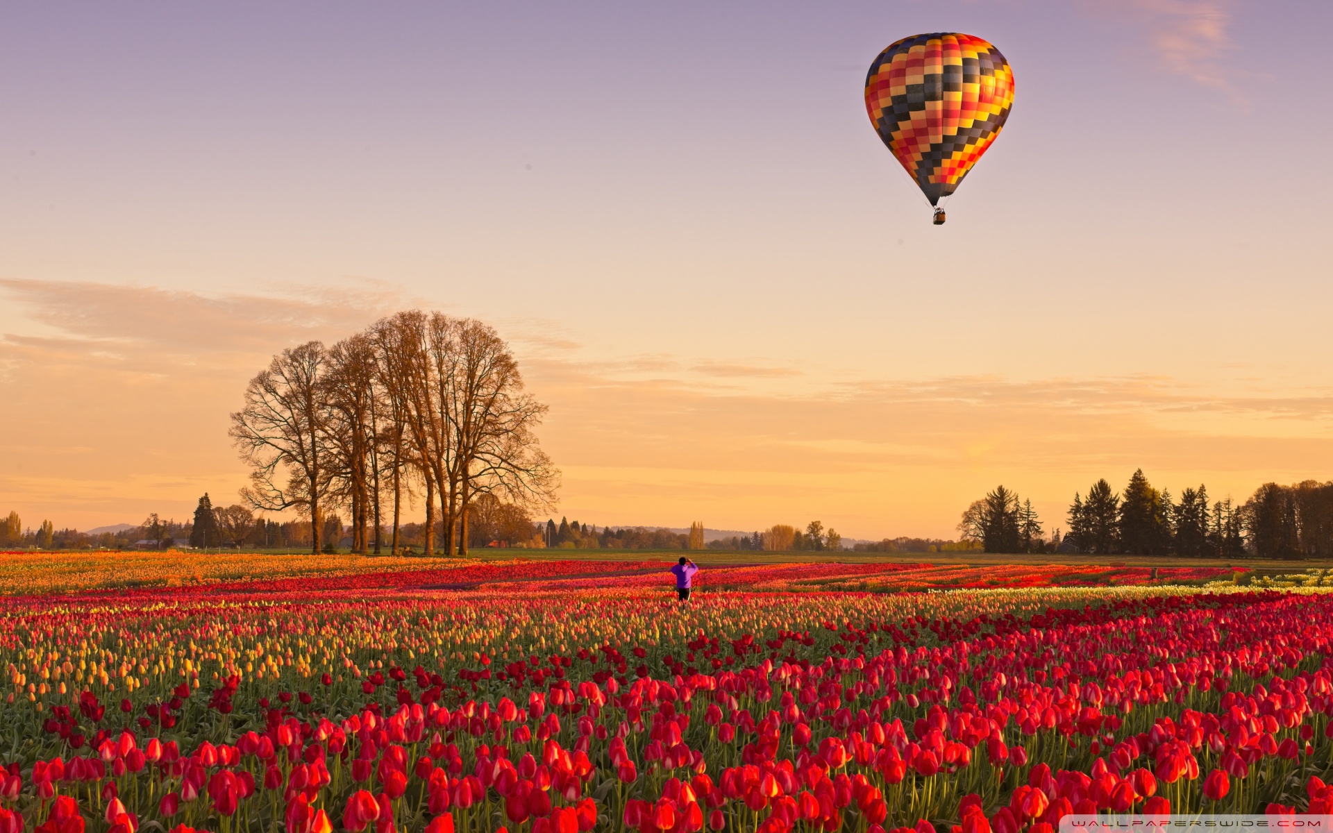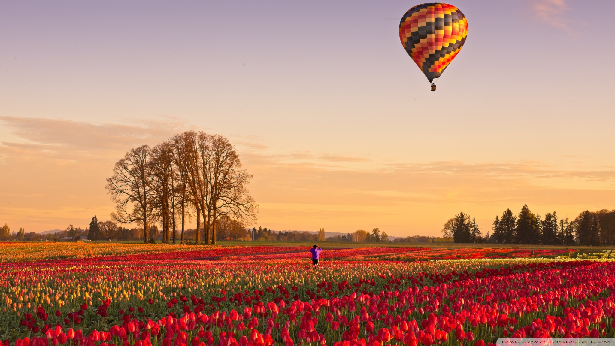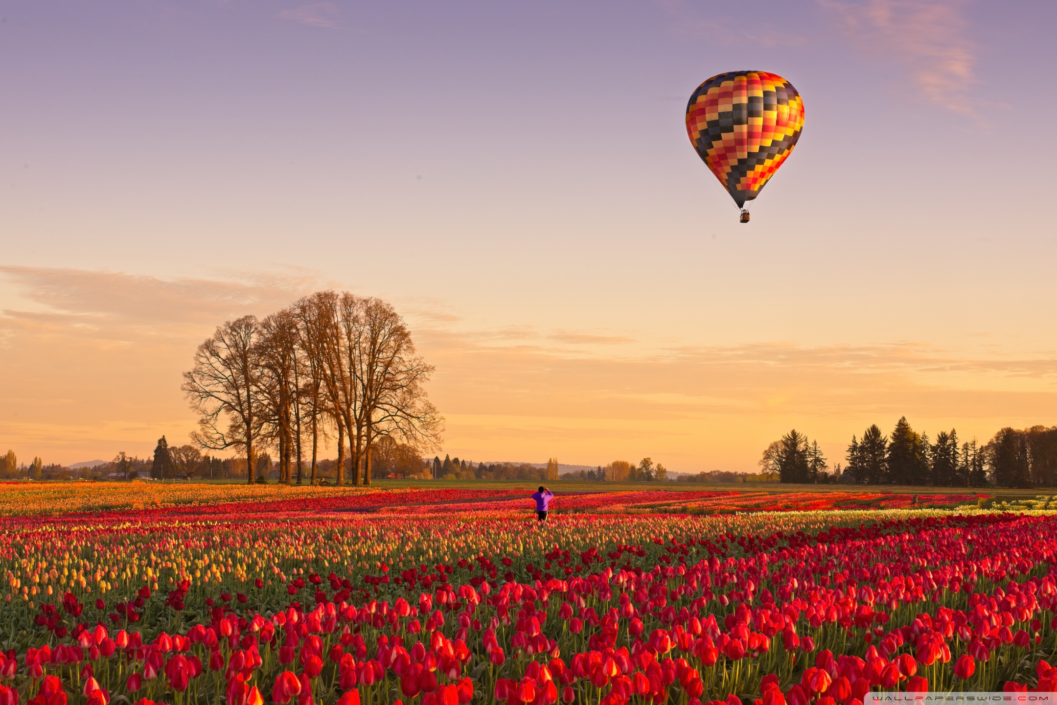 Download Tulip Fields at Sunrise with Hot Air Balloon 4K UHD Wallpaper