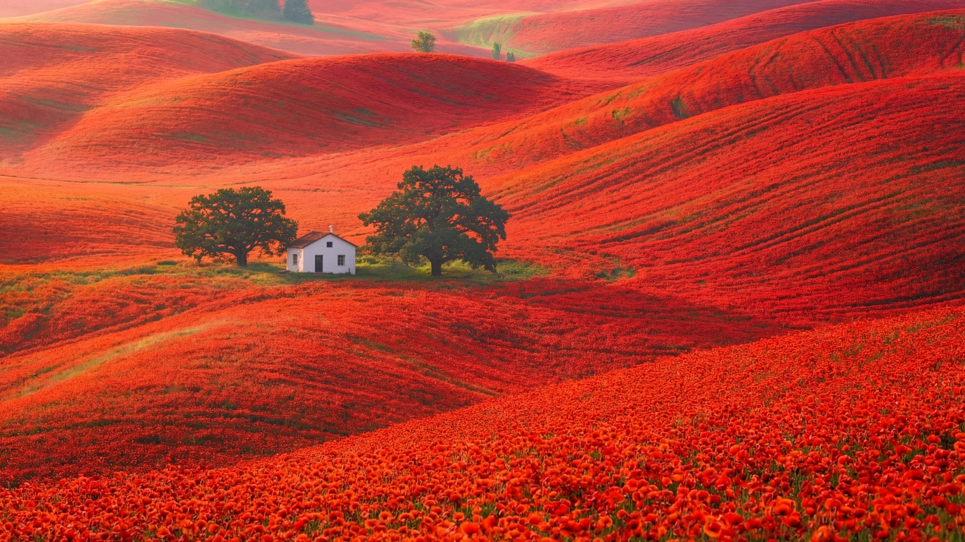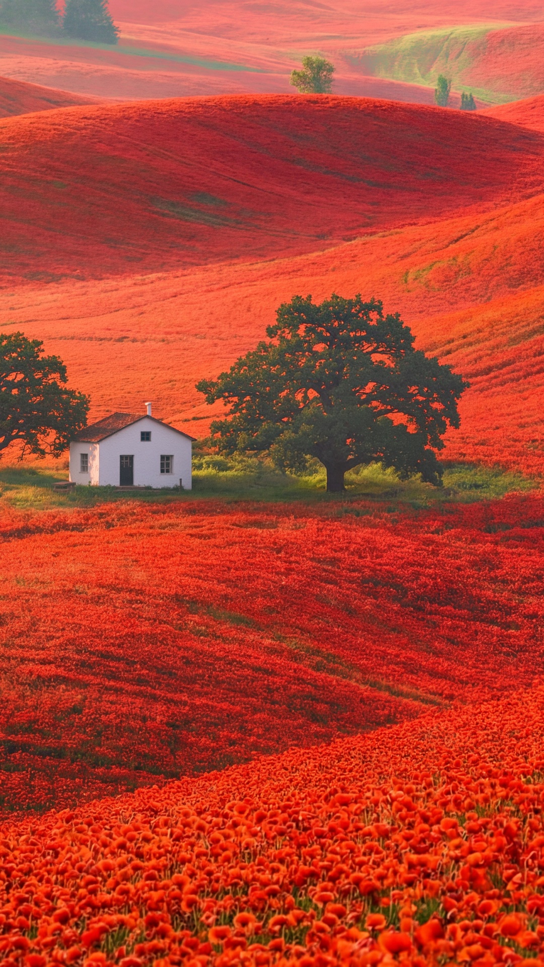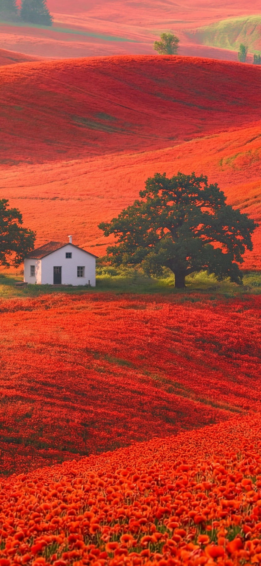 White House Between Trees in Red Flower Hills UltraHD Wallpaper for UHD 16:9 ; HD 16:9 ; UltraWide 21:9 24:10 32:9 32:10 ; Widescreen 16:10 ; Tablet 1:1 ; Mobile 9:16 9:19.5 9:20 9:21 9:22 ; Dual 16:10 16:9 ;