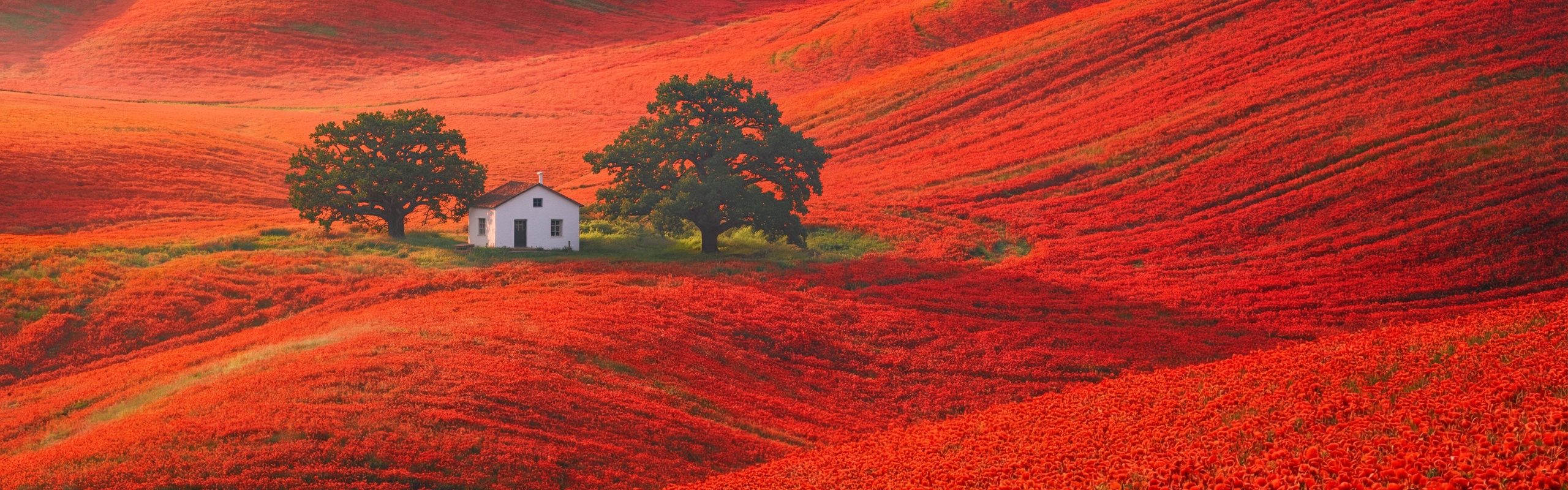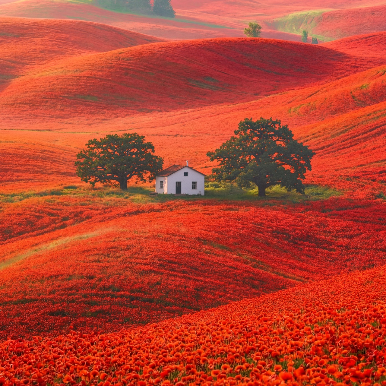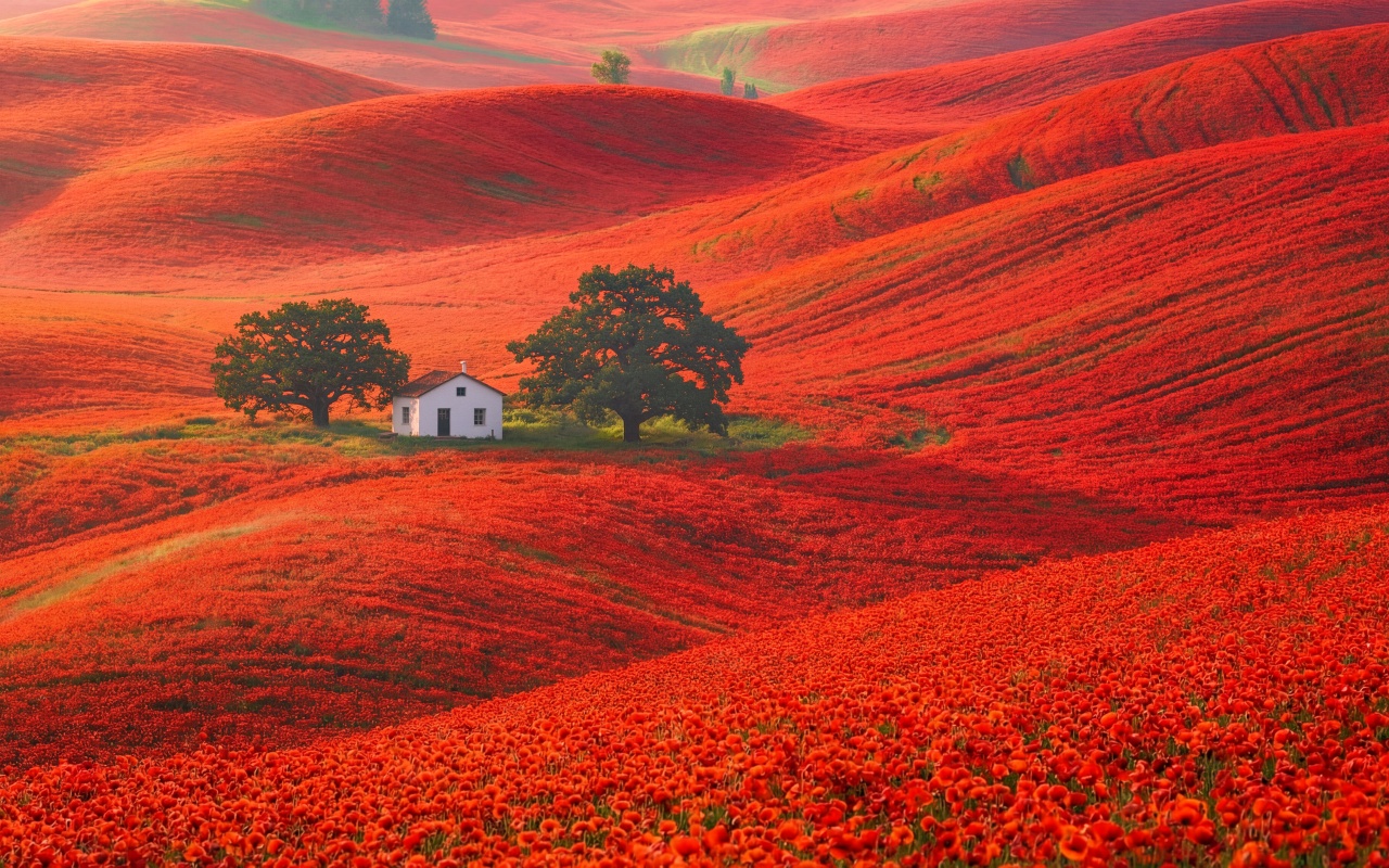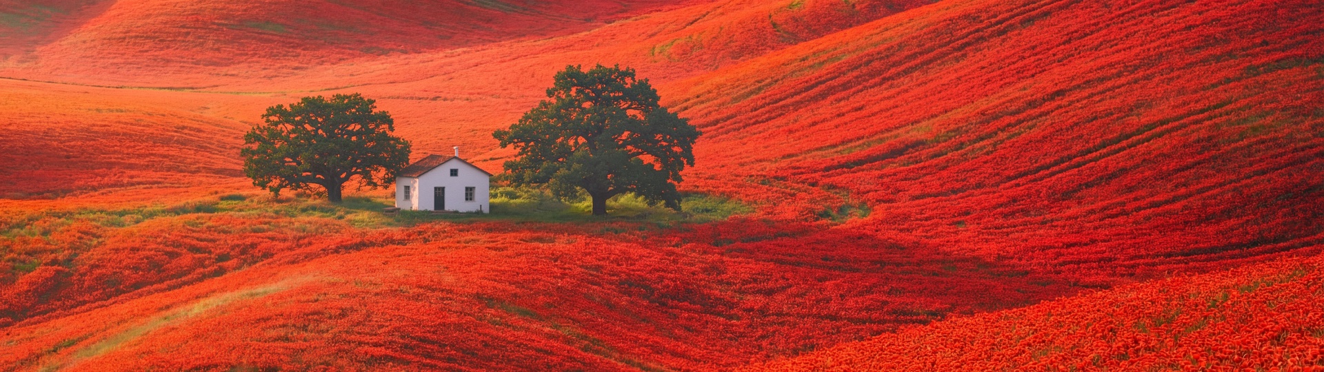 White House Between Trees in Red Flower Hills UltraHD Wallpaper for UHD 16:9 ; HD 16:9 ; UltraWide 21:9 24:10 32:9 32:10 ; Widescreen 16:10 ; Tablet 1:1 ; Mobile 9:16 9:19.5 9:20 9:21 9:22 ; Dual 16:10 16:9 ;