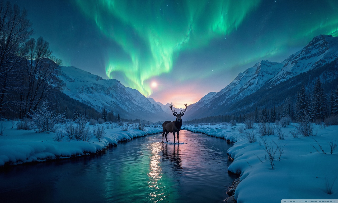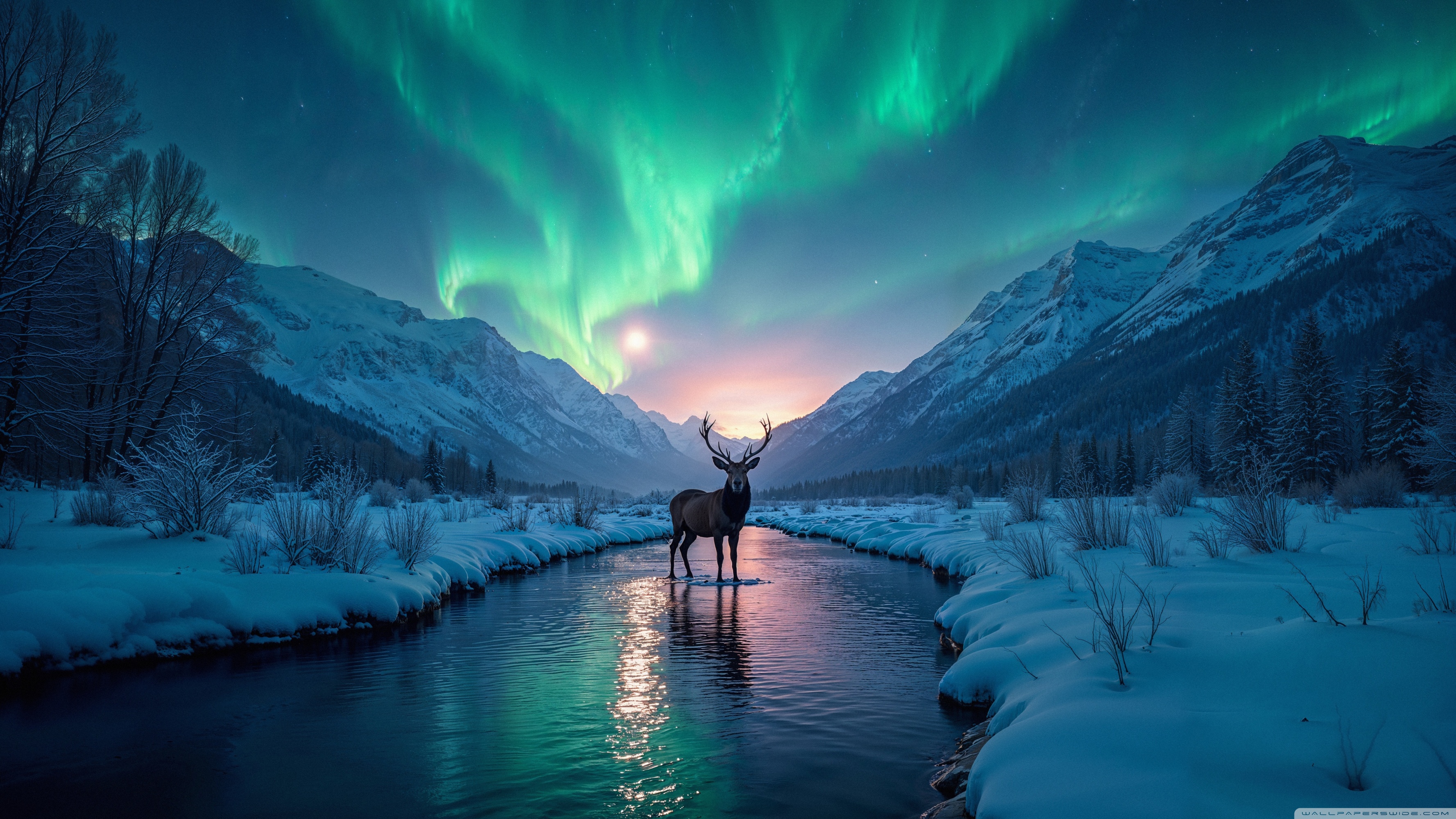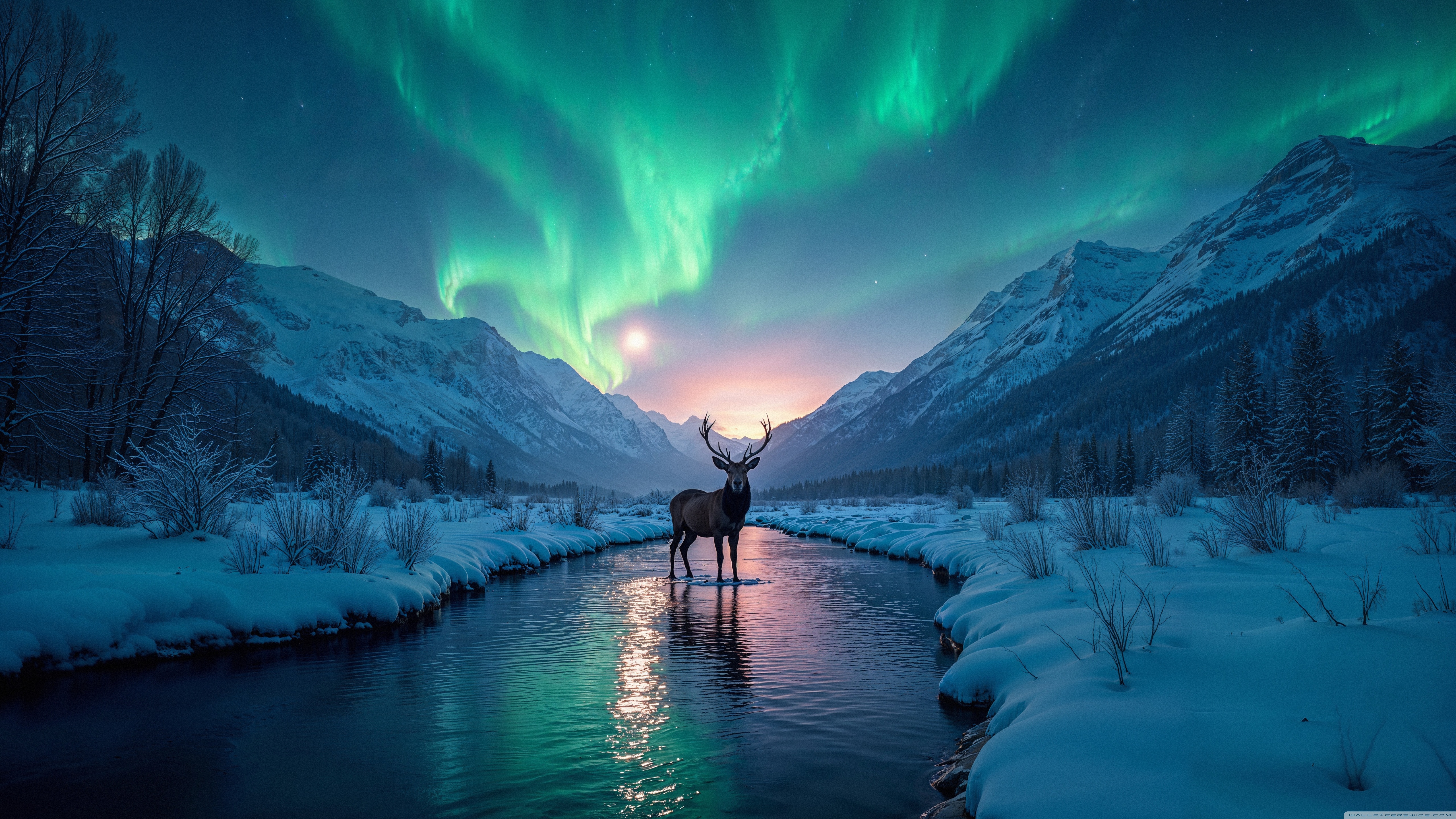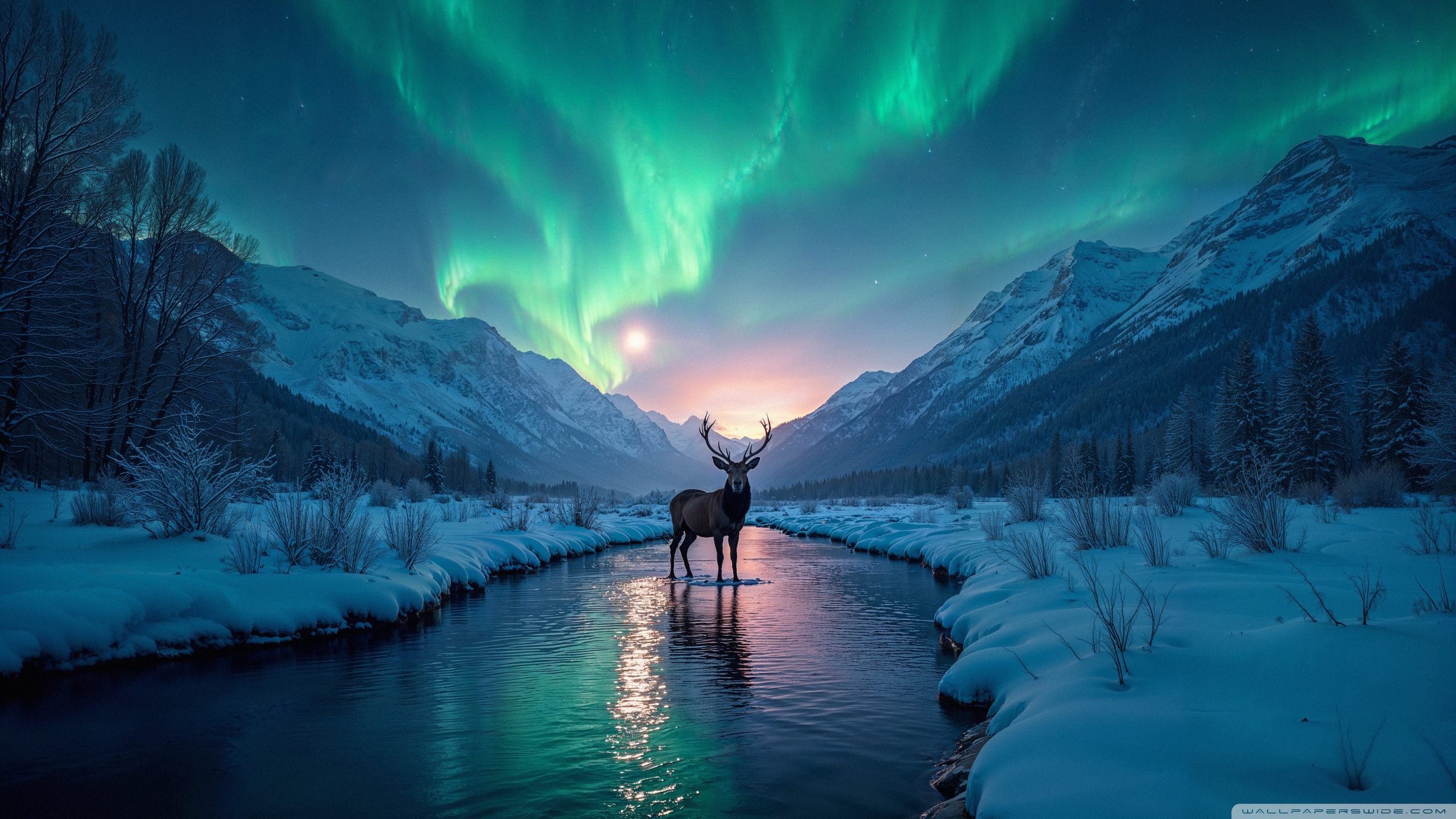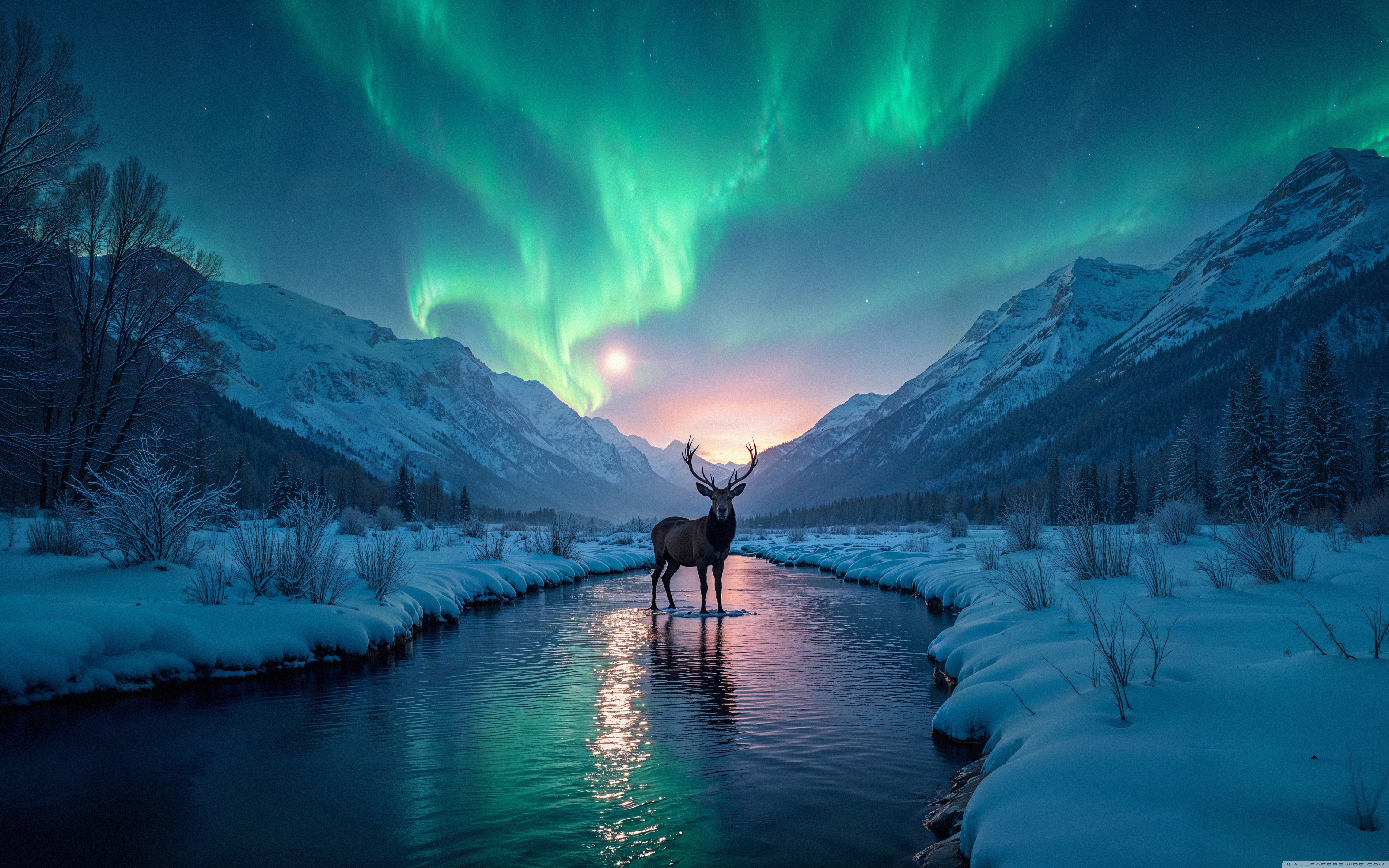 Download Winter, Mountains, Stream, and Wildlife 4K UHD Wallpaper