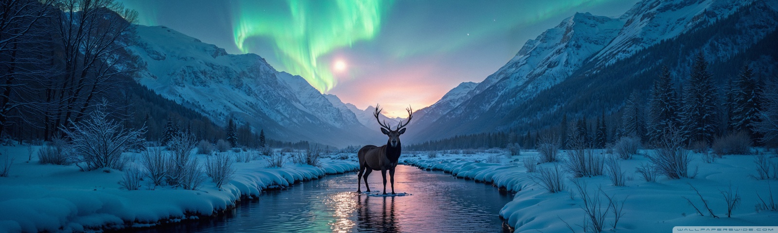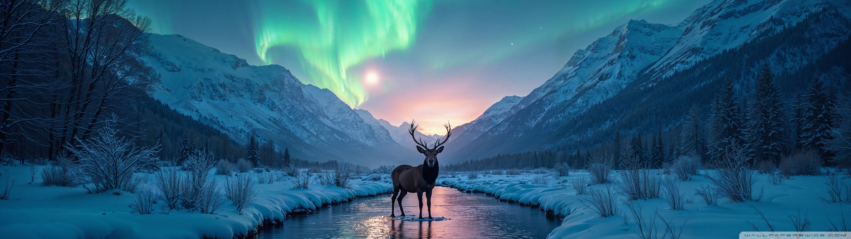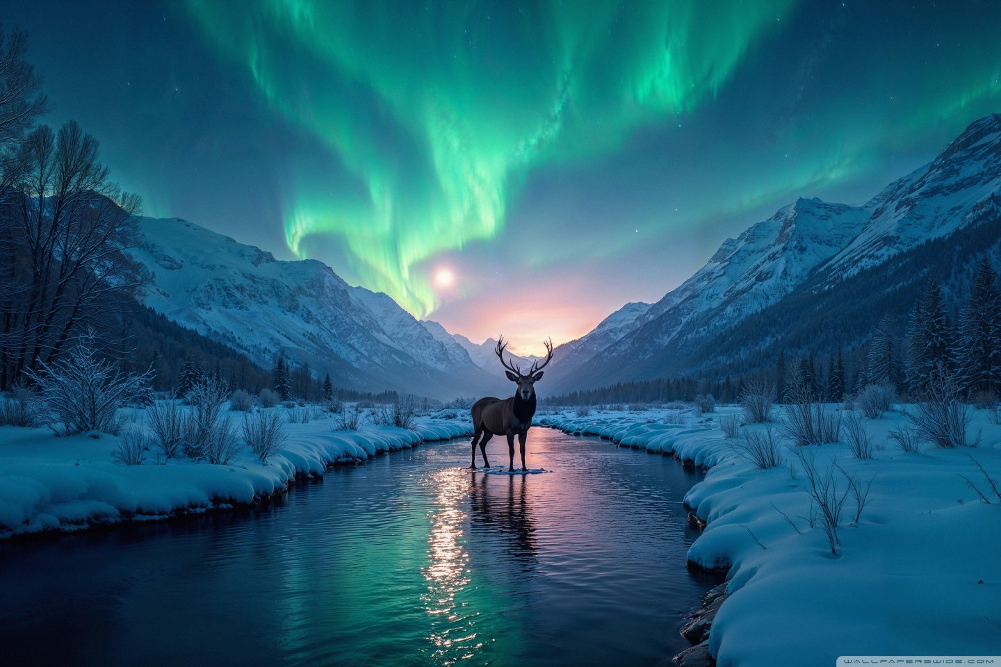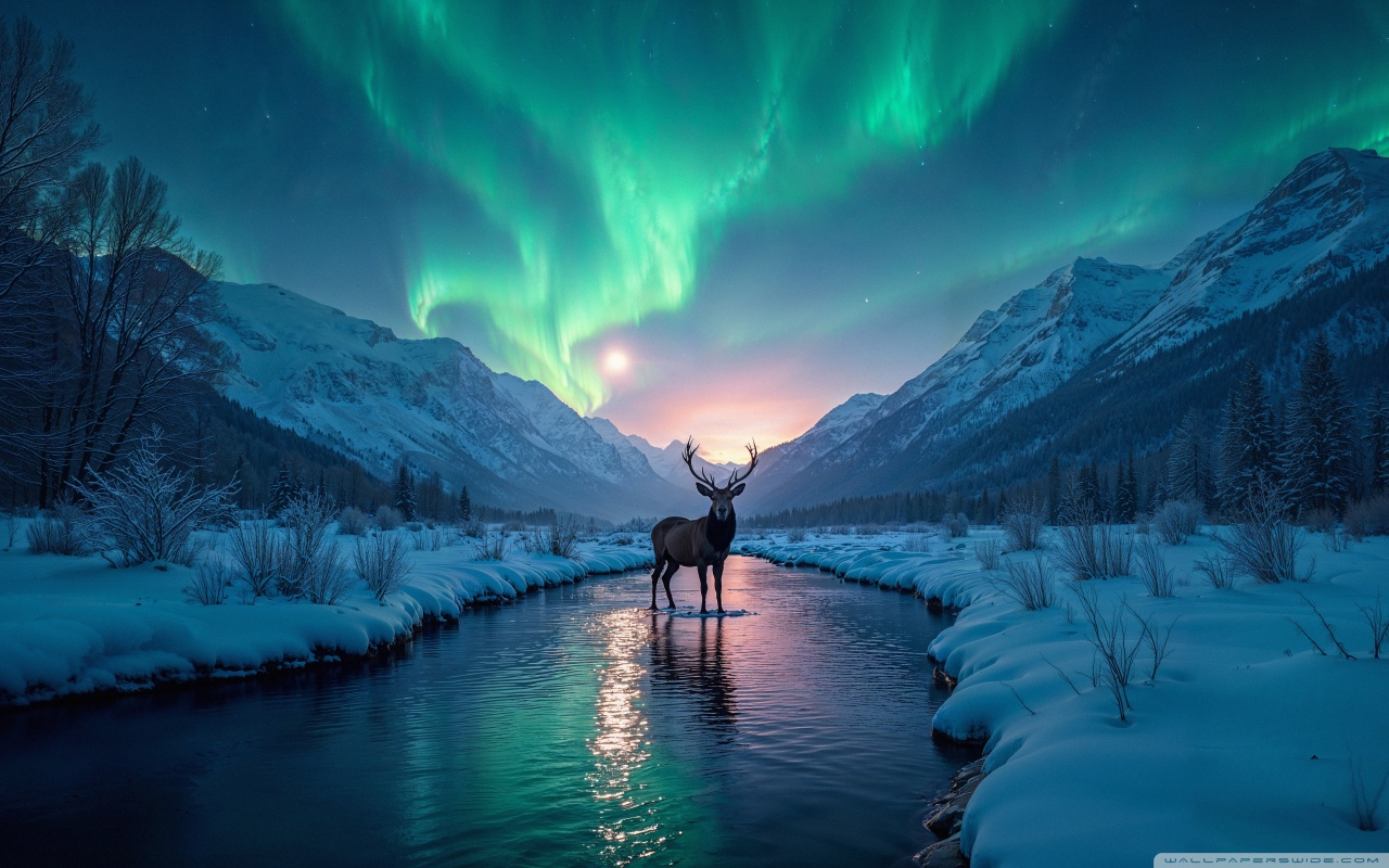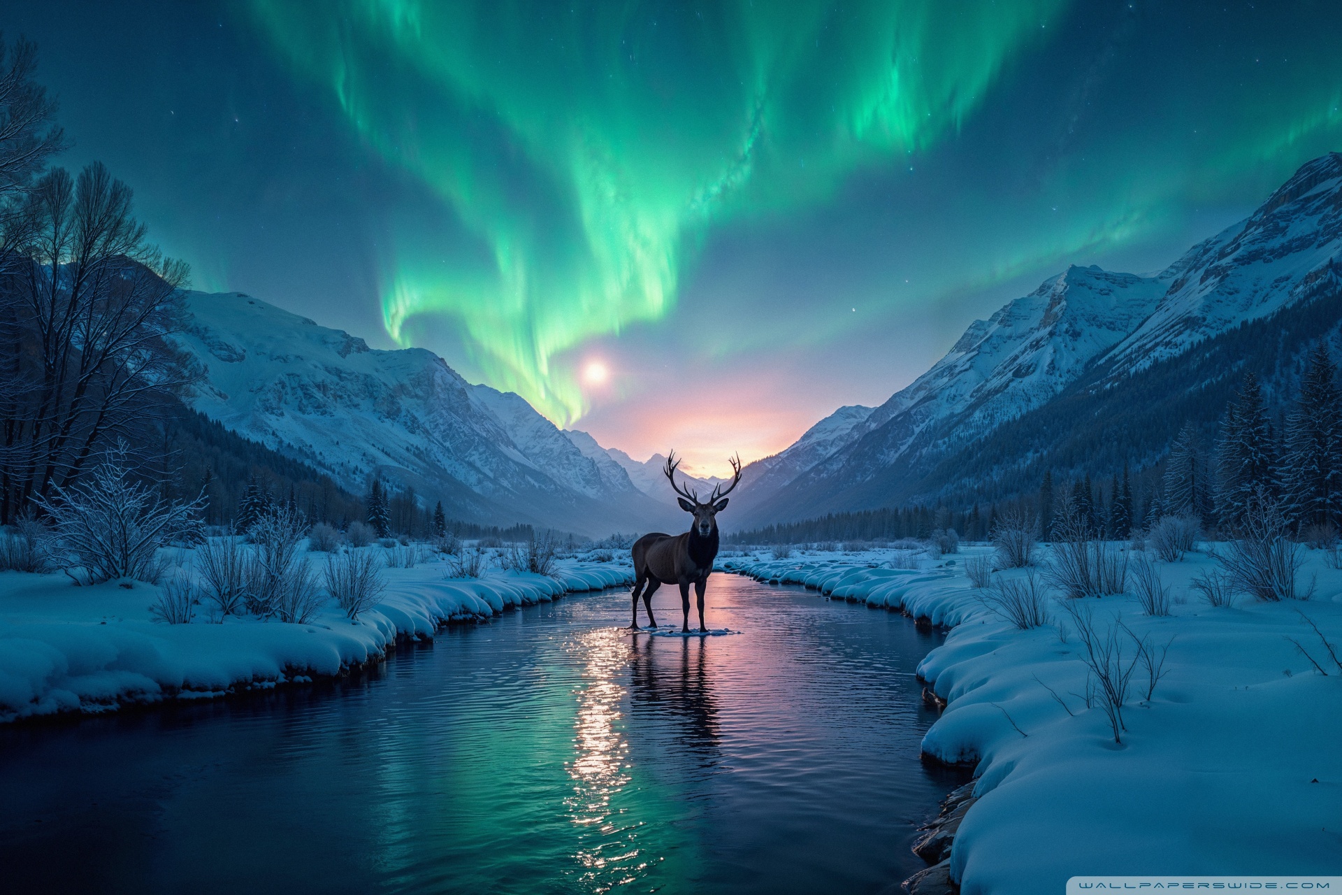 Download Winter, Mountains, Stream, and Wildlife 4K UHD Wallpaper