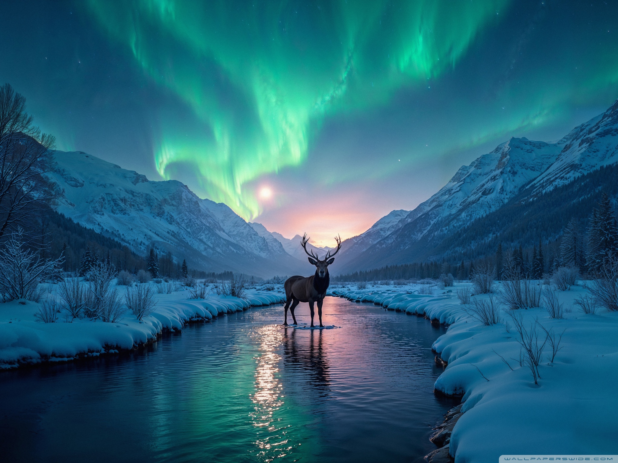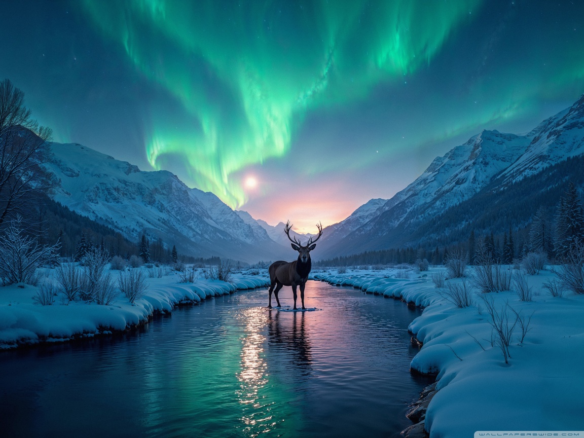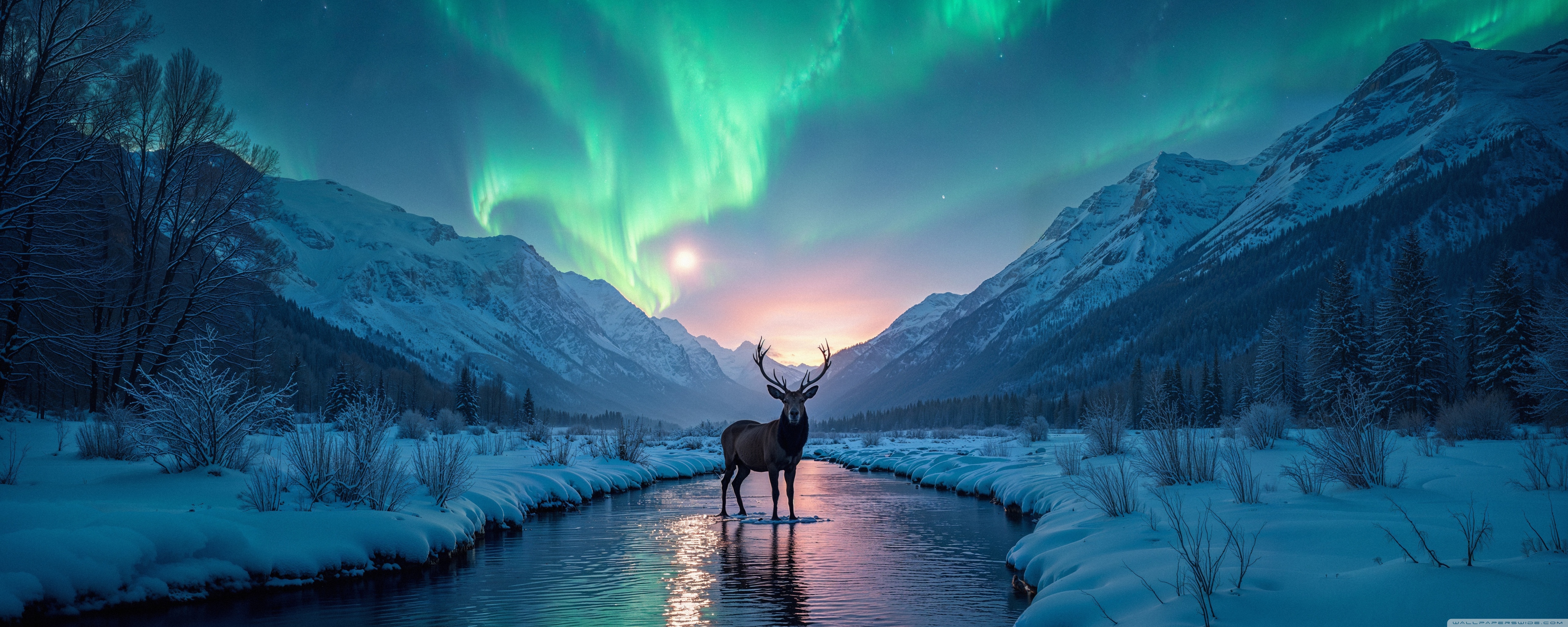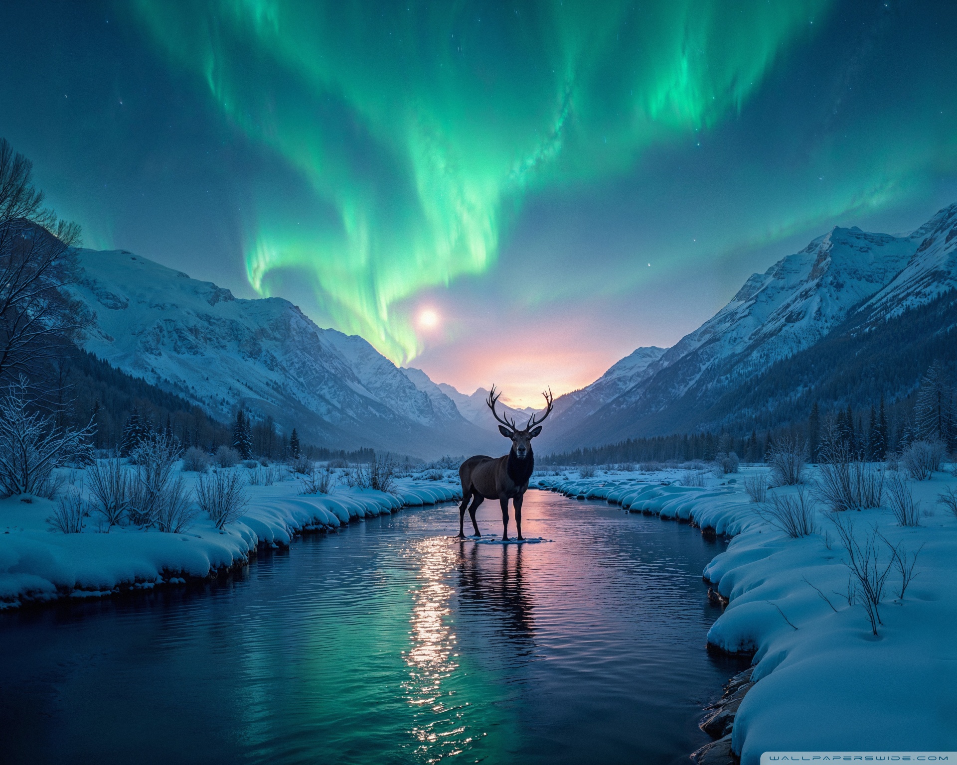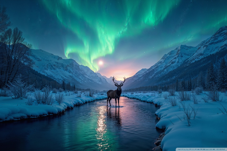 Download Winter, Mountains, Stream, and Wildlife 4K UHD Wallpaper