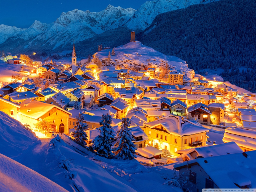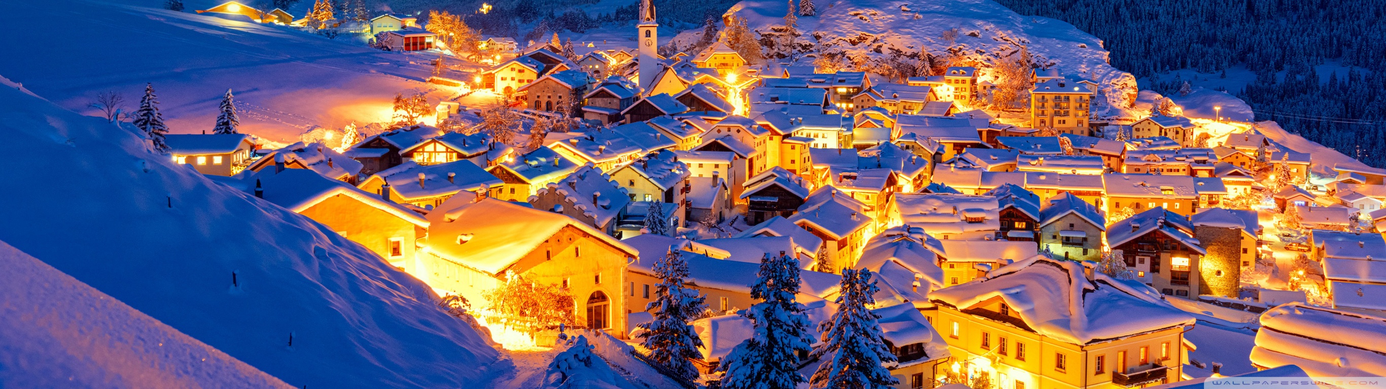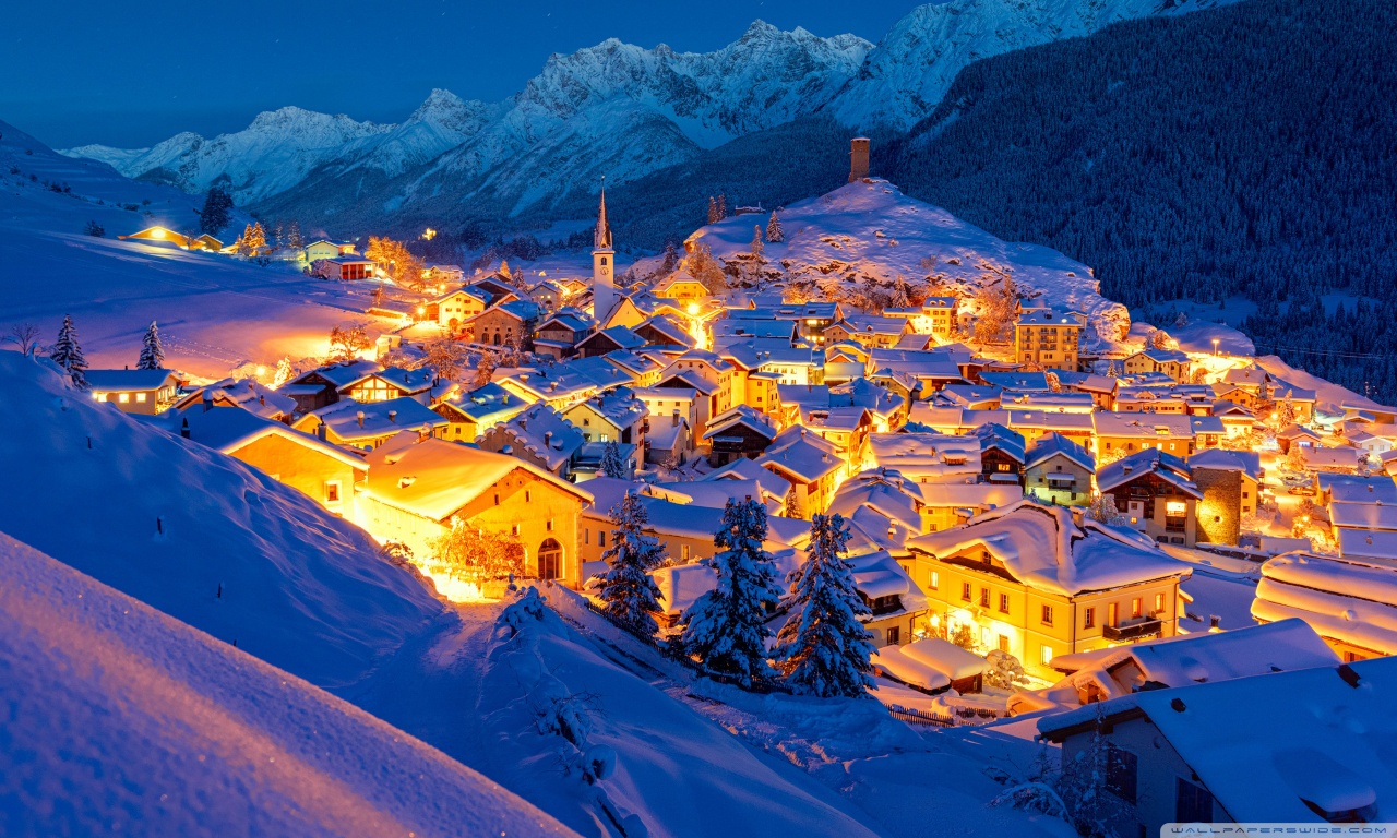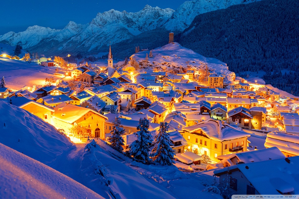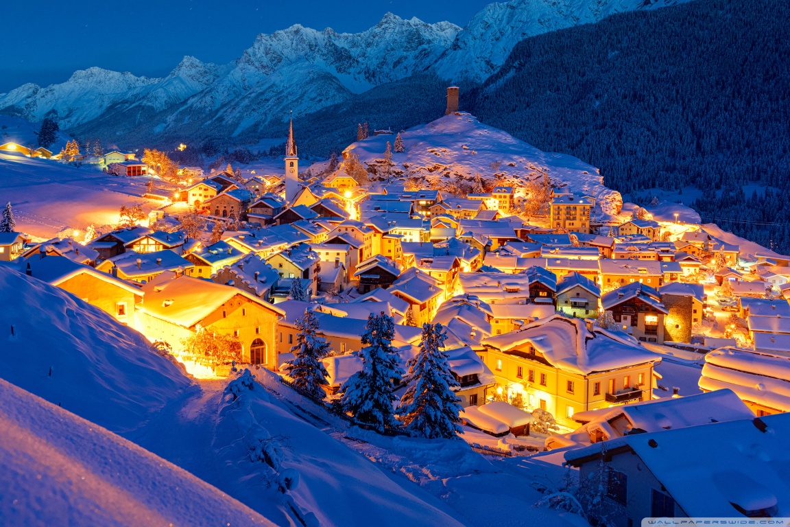 Download Winter, Snowy Mountain Town, Evening, Golden... 4K UHD Wallpaper