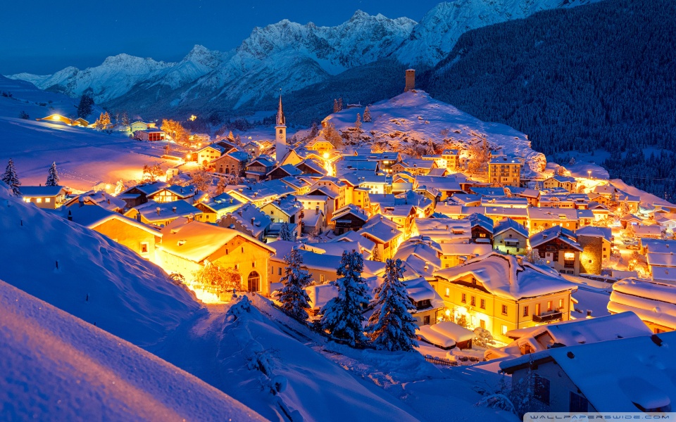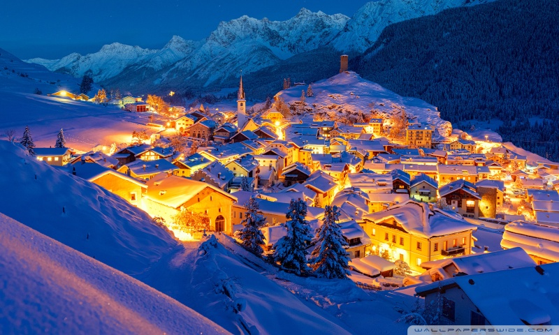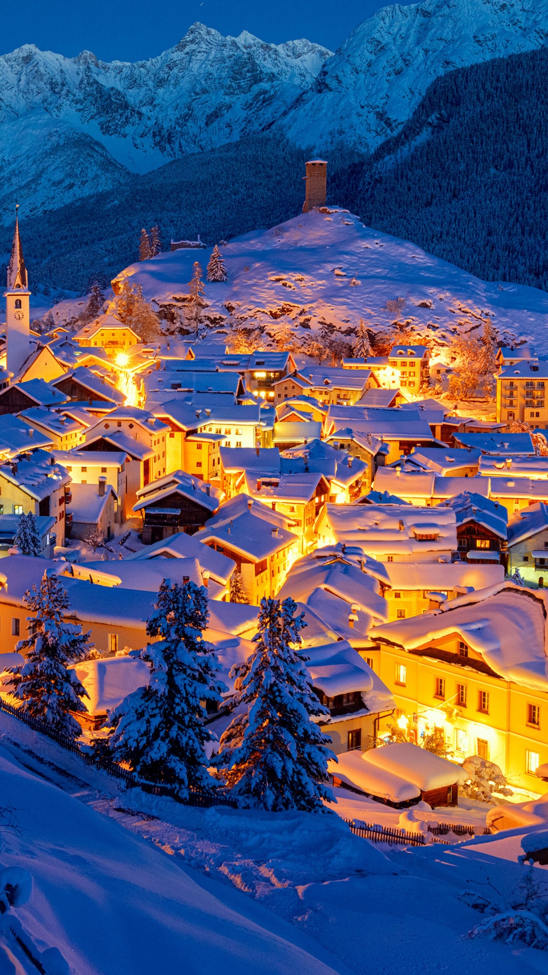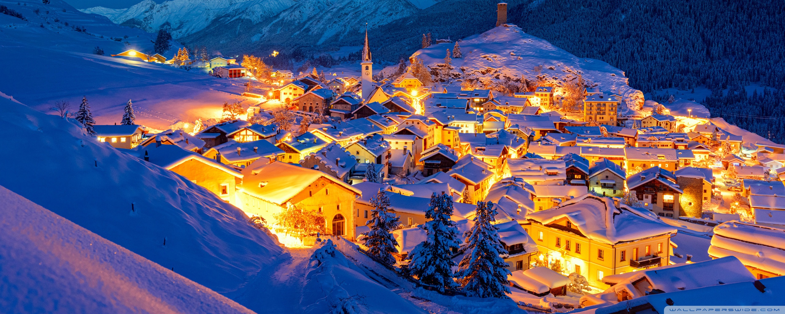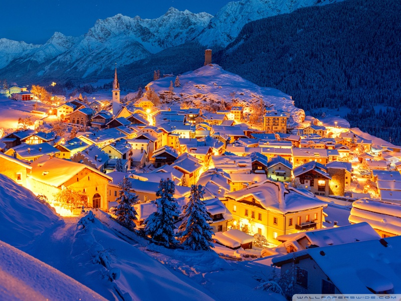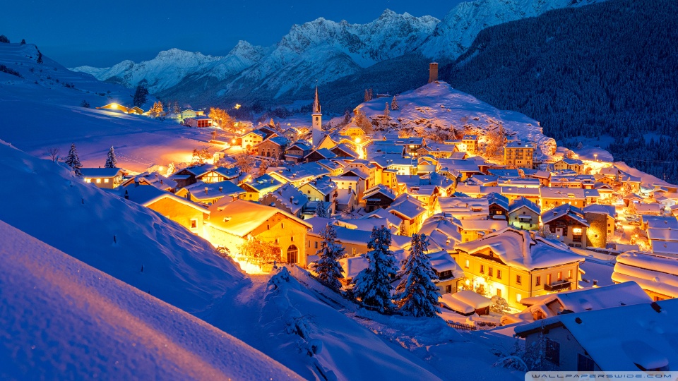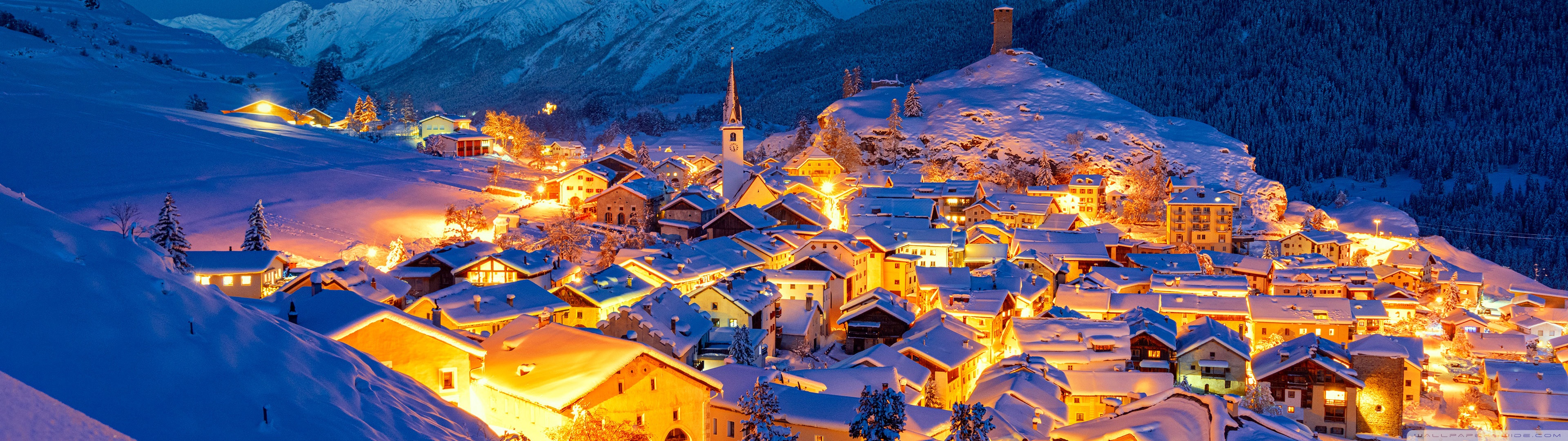 Download Winter, Snowy Mountain Town, Evening, Golden... 4K UHD Wallpaper