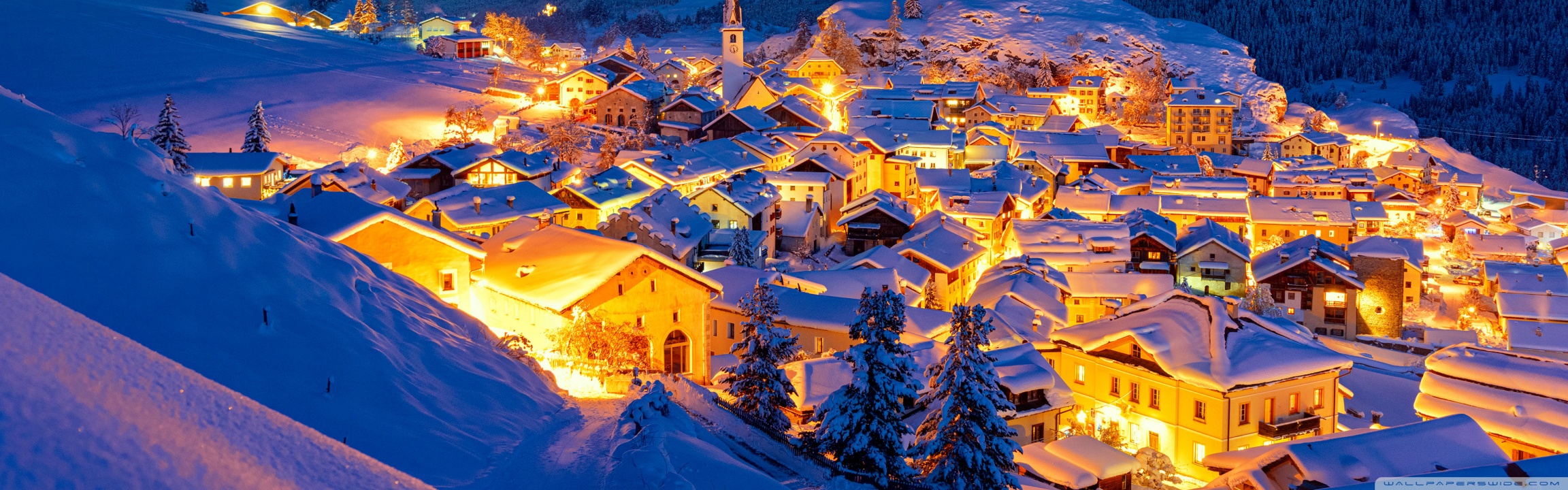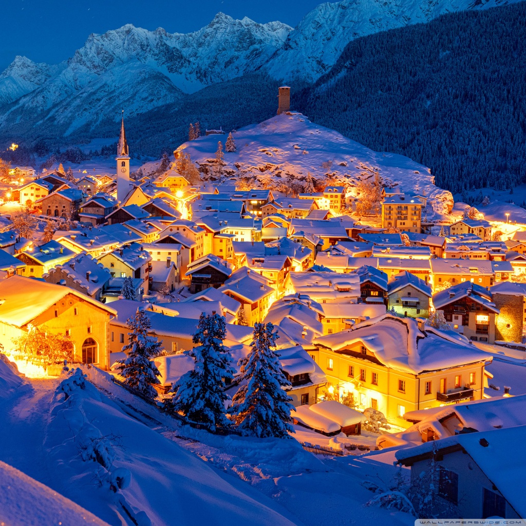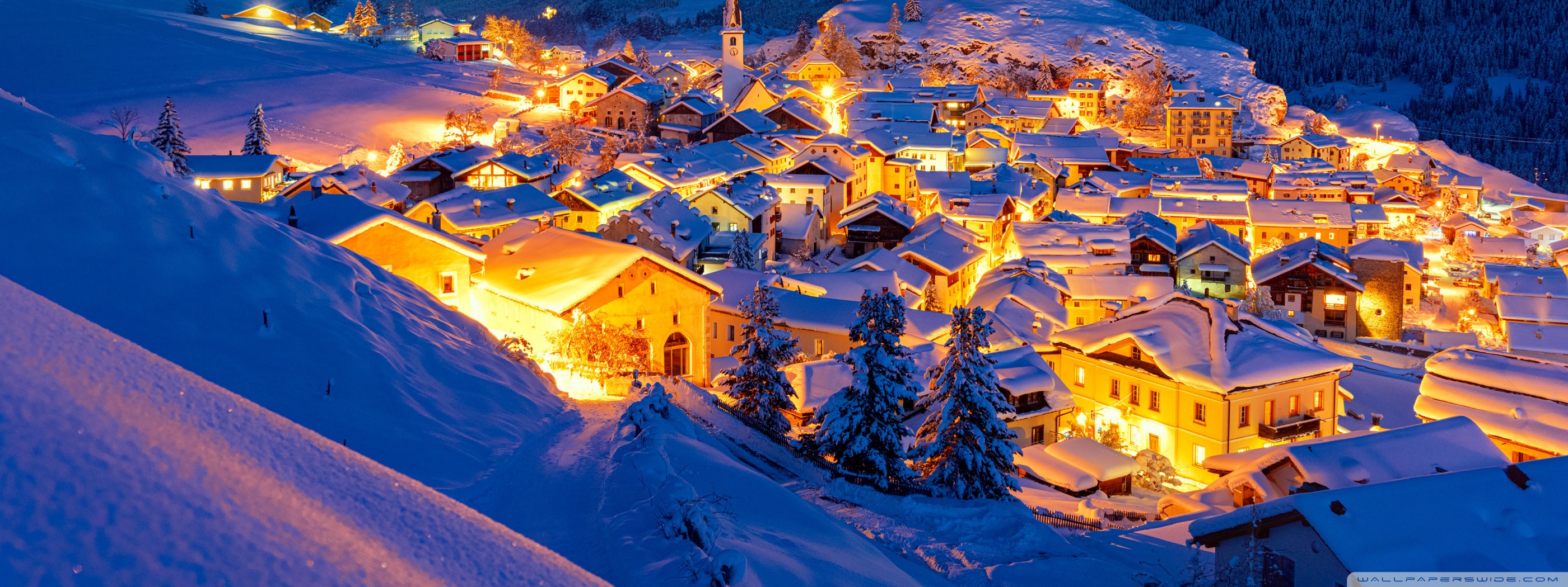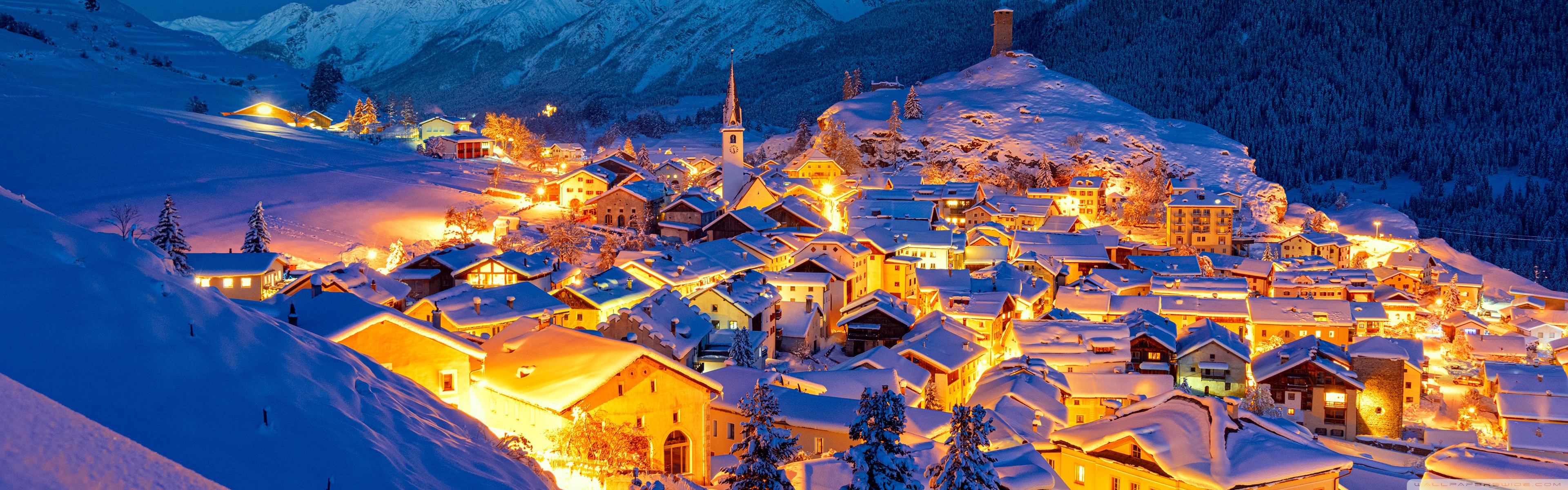 Download Winter, Snowy Mountain Town, Evening, Golden... 4K UHD Wallpaper