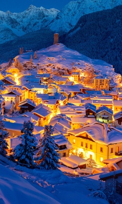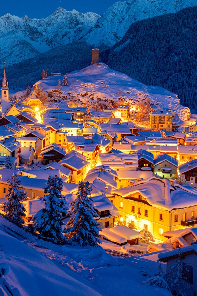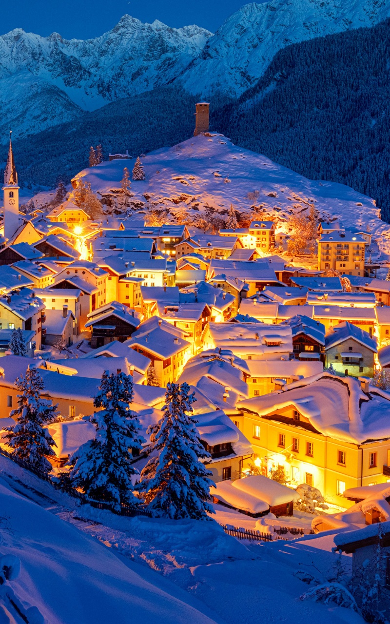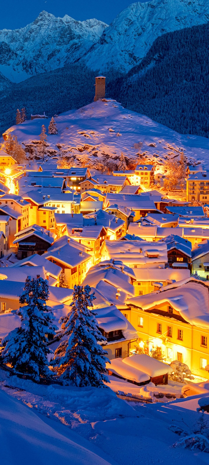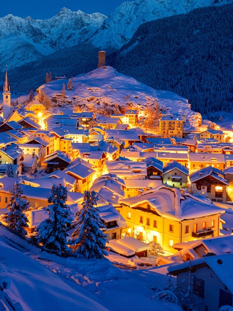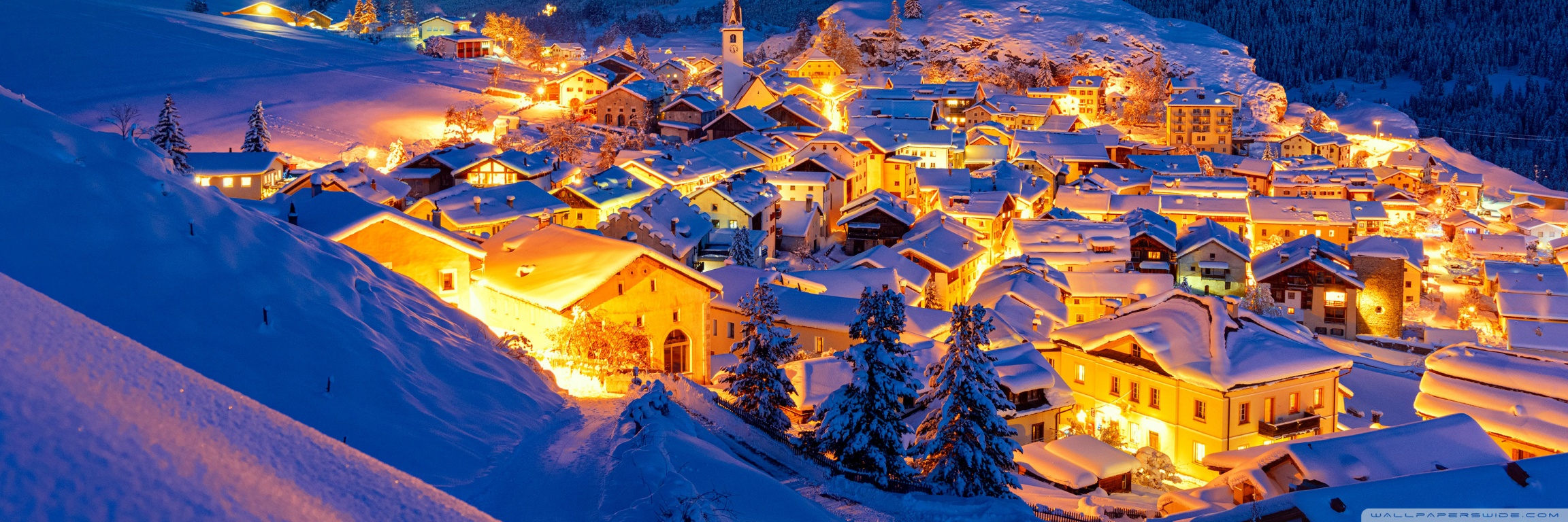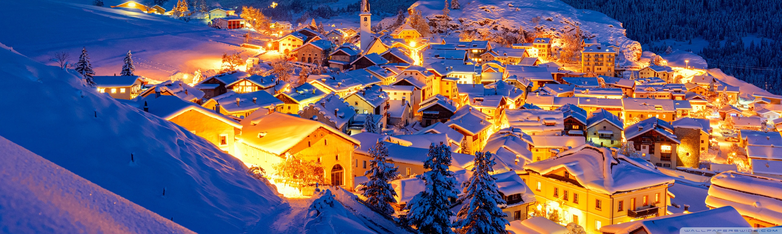 Download Winter, Snowy Mountain Town, Evening, Golden... 4K UHD Wallpaper