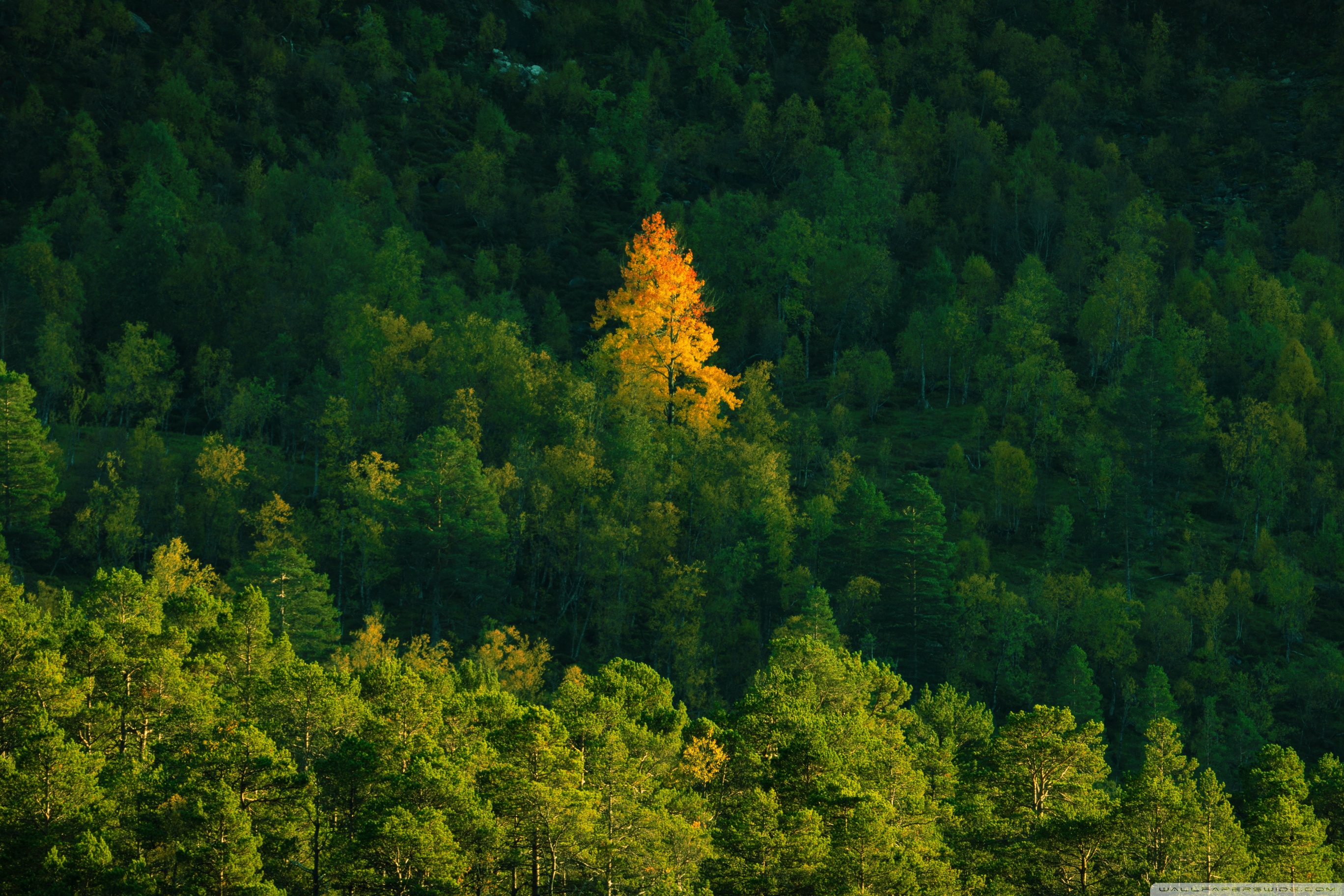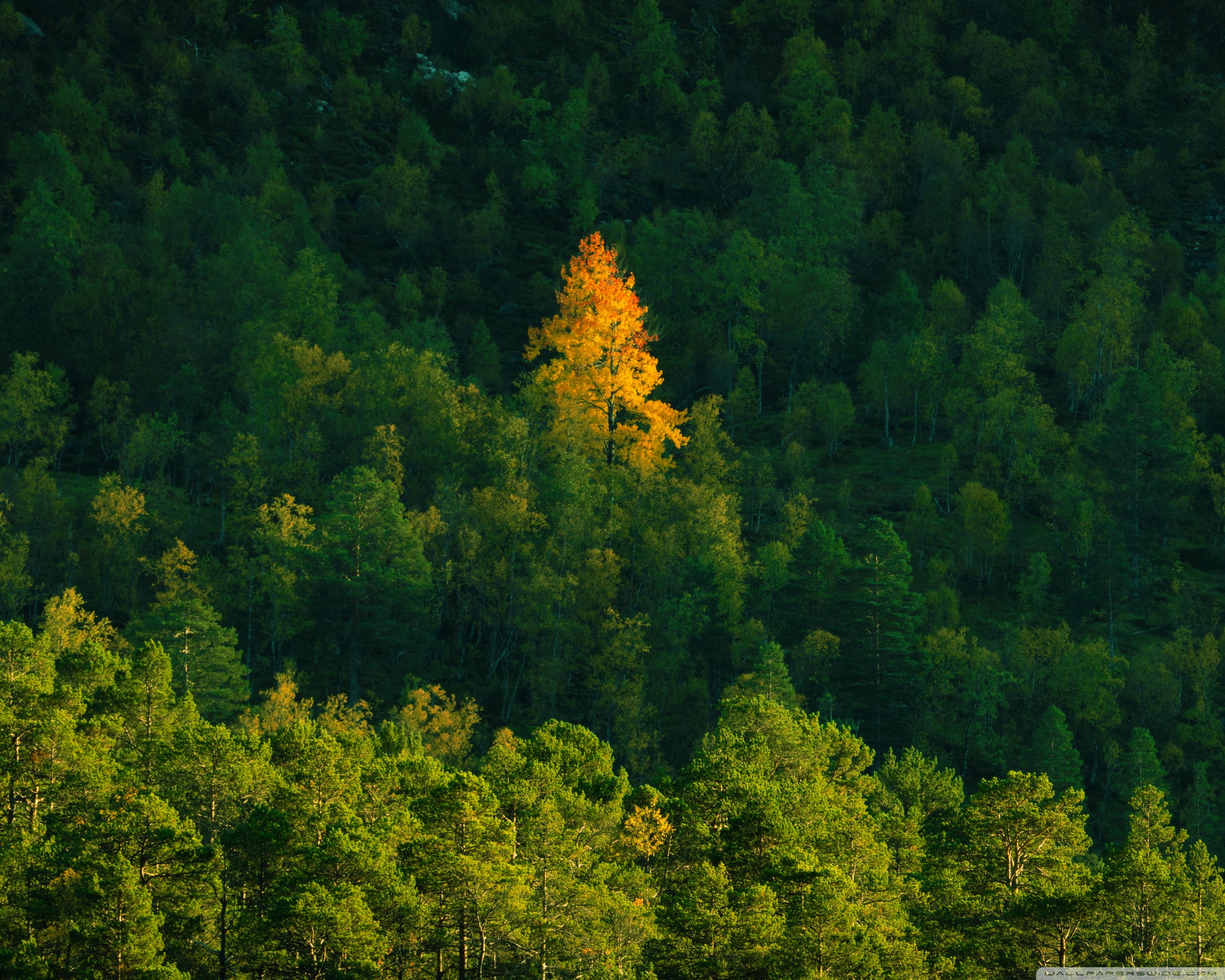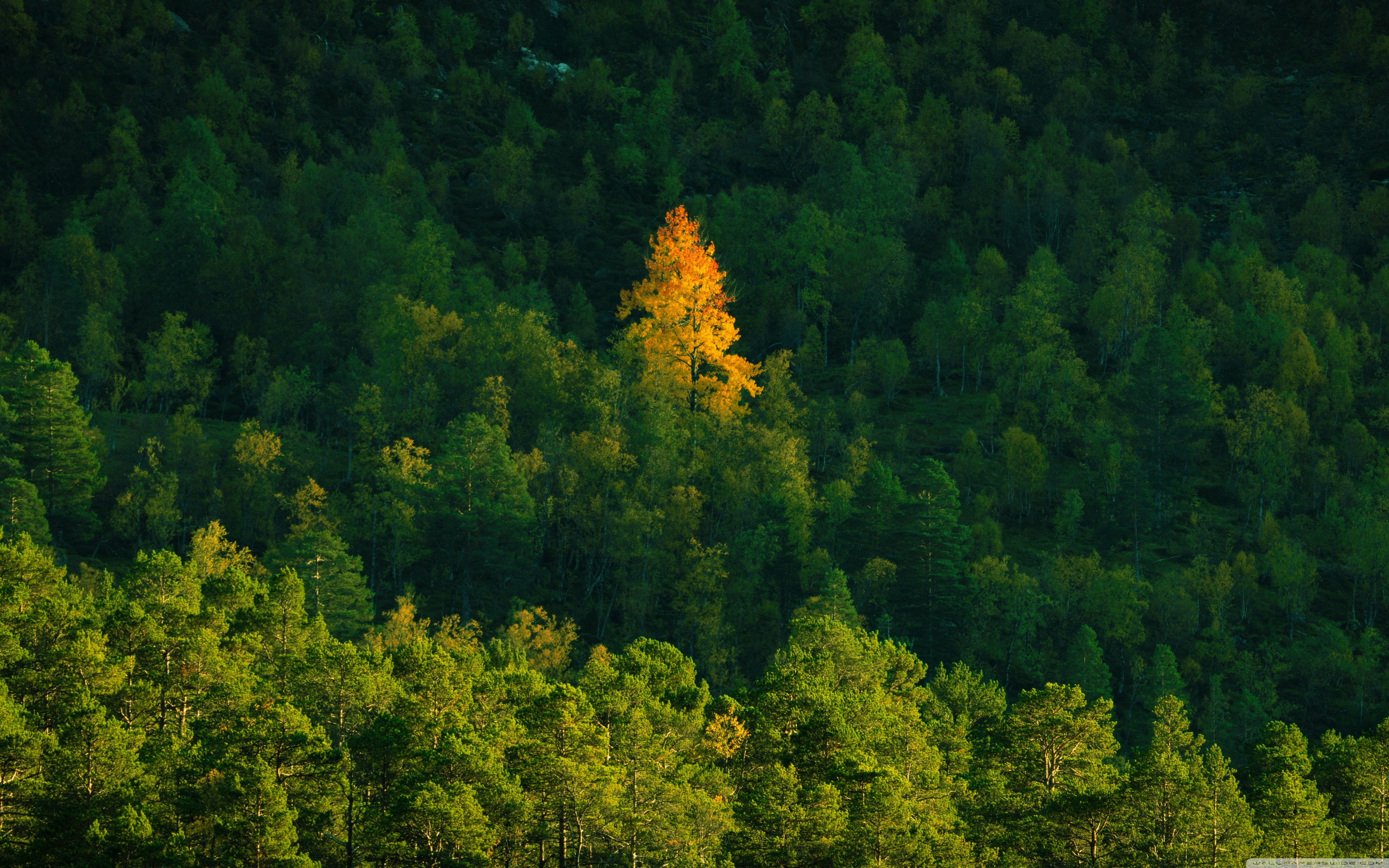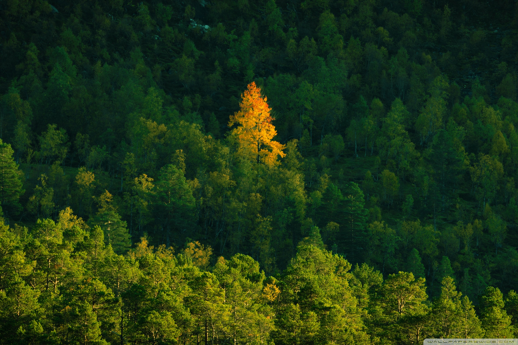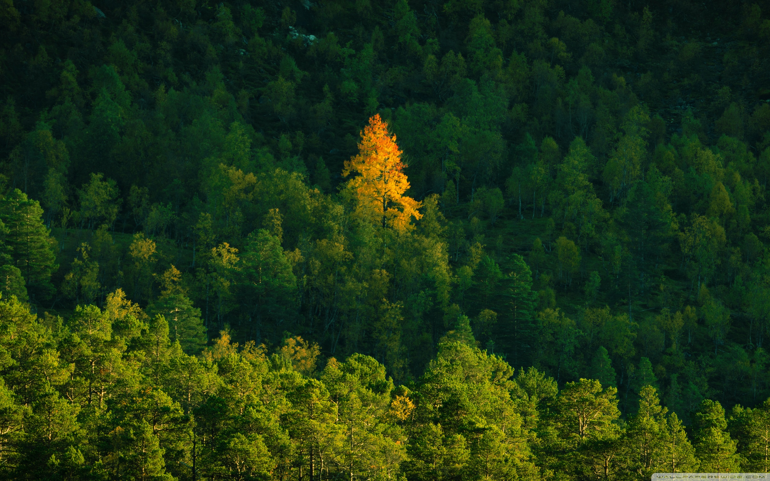 Download Yellow Birch Tree Amidst Pine Forest 4K UHD Wallpaper