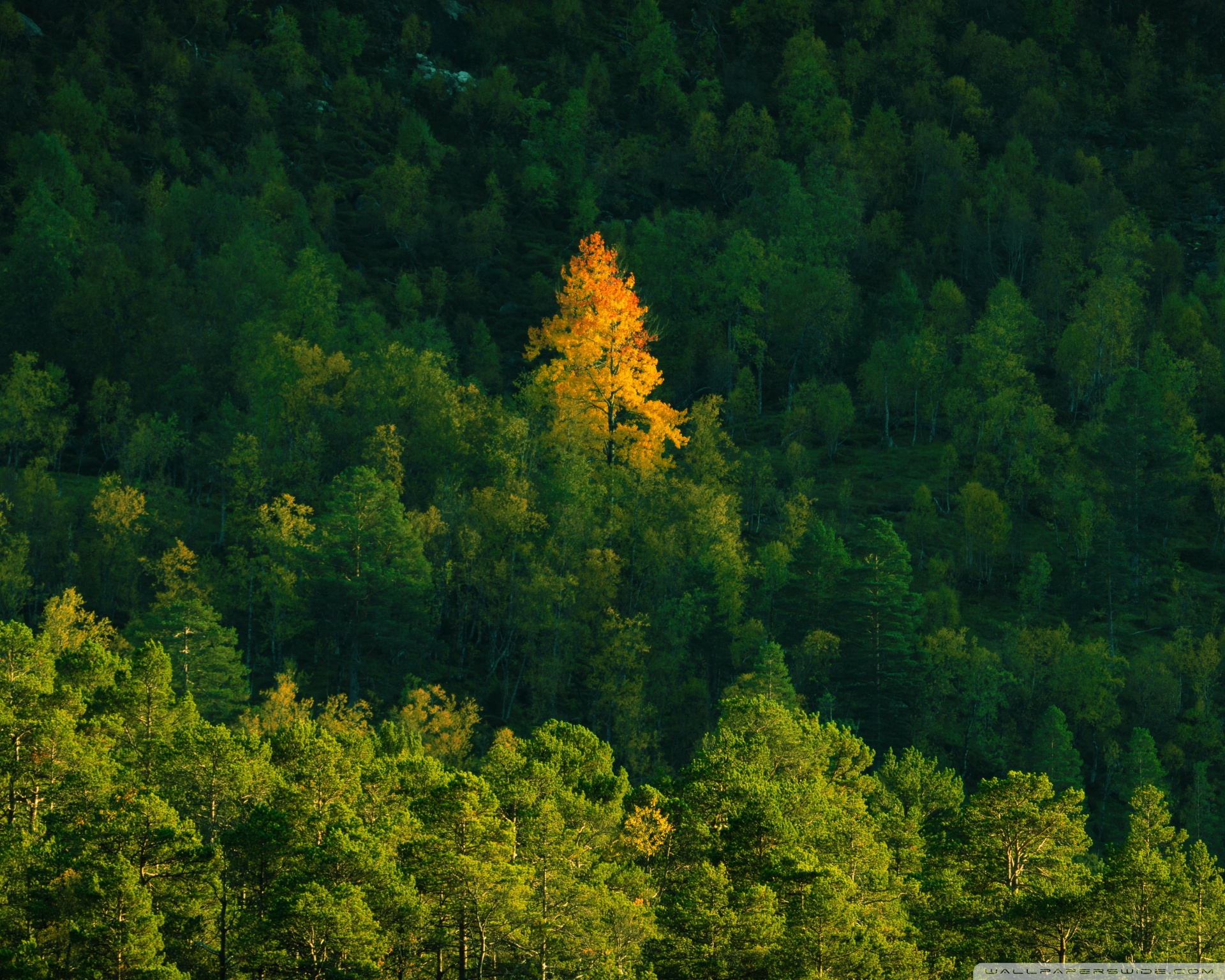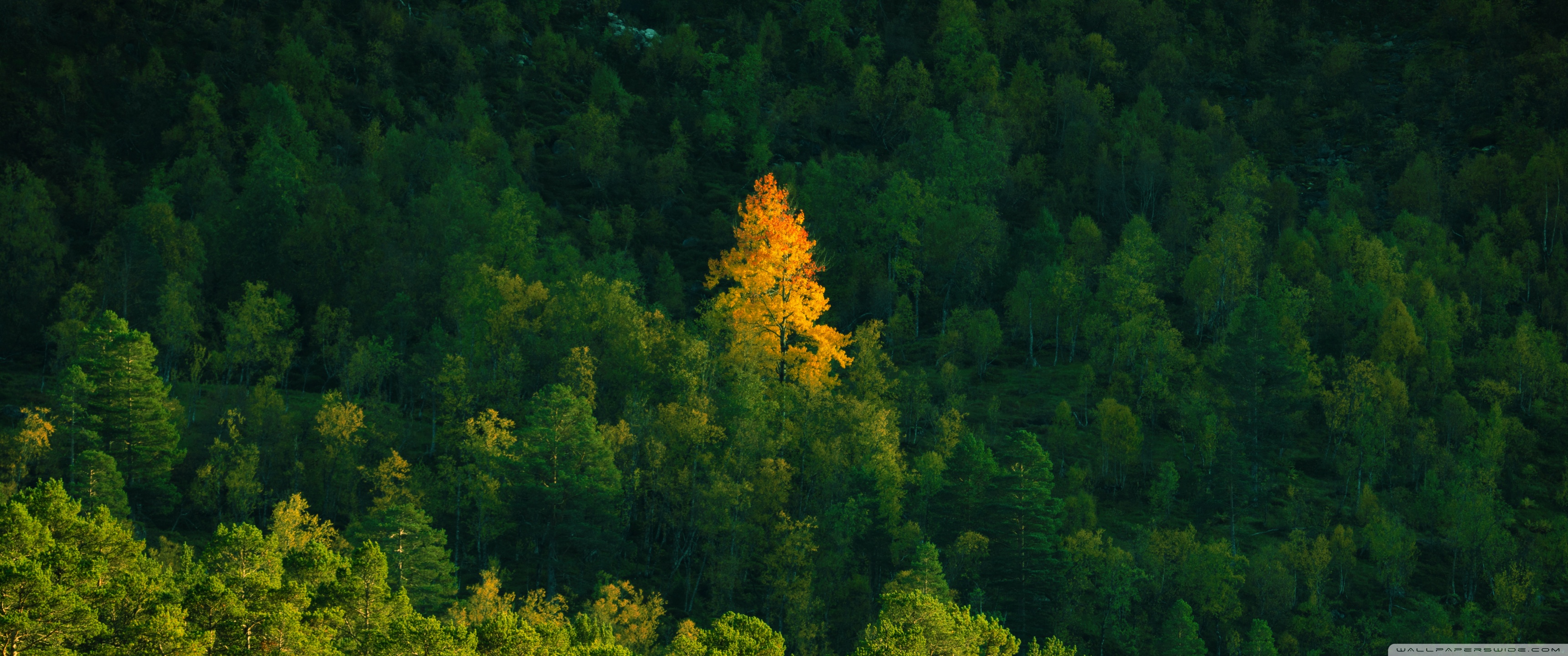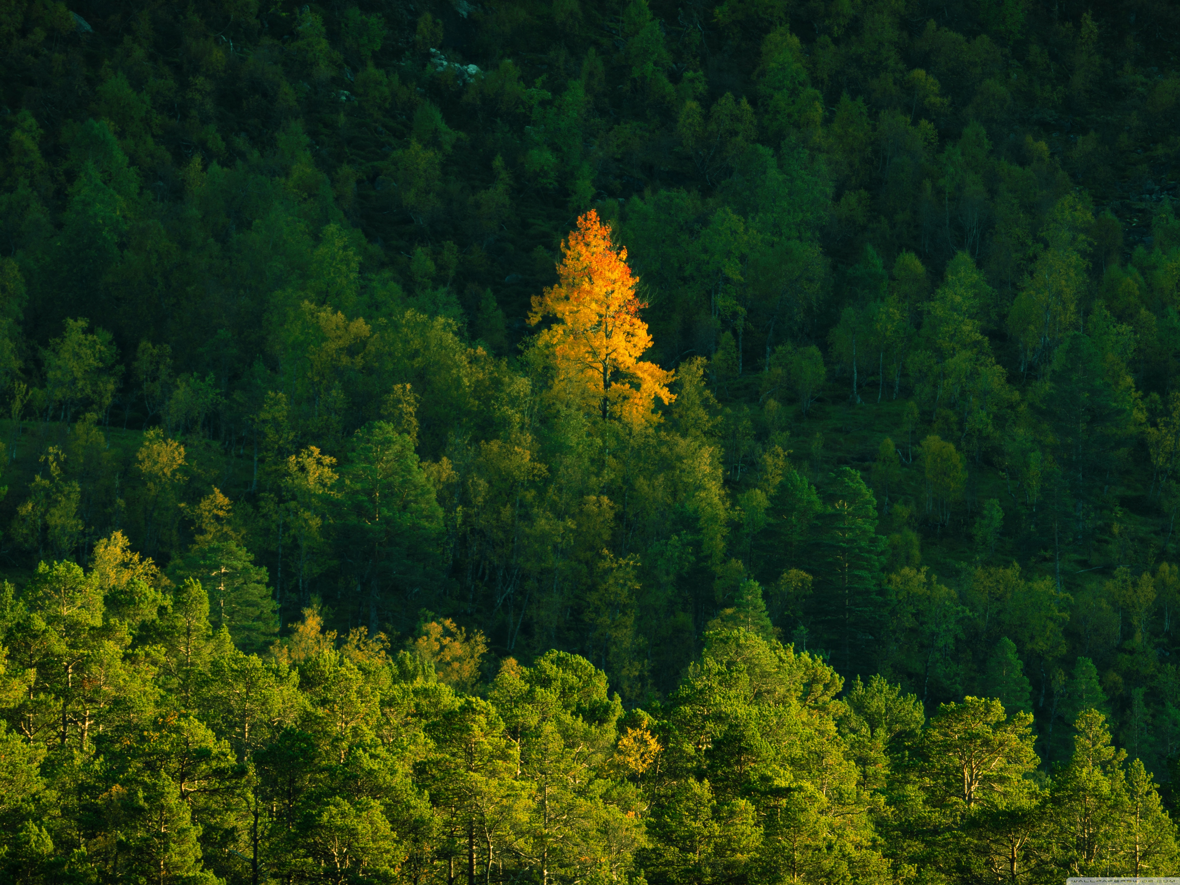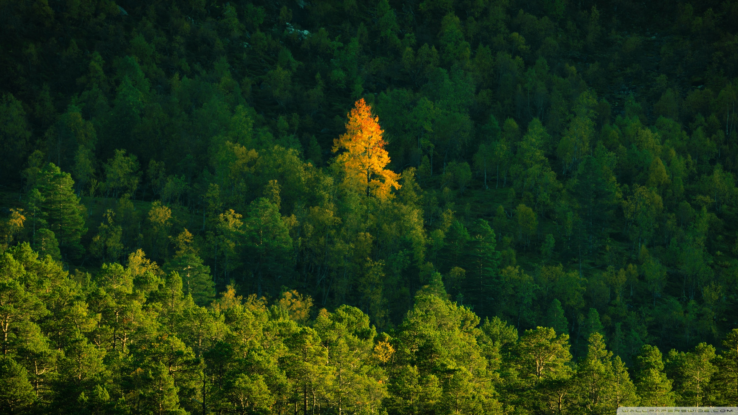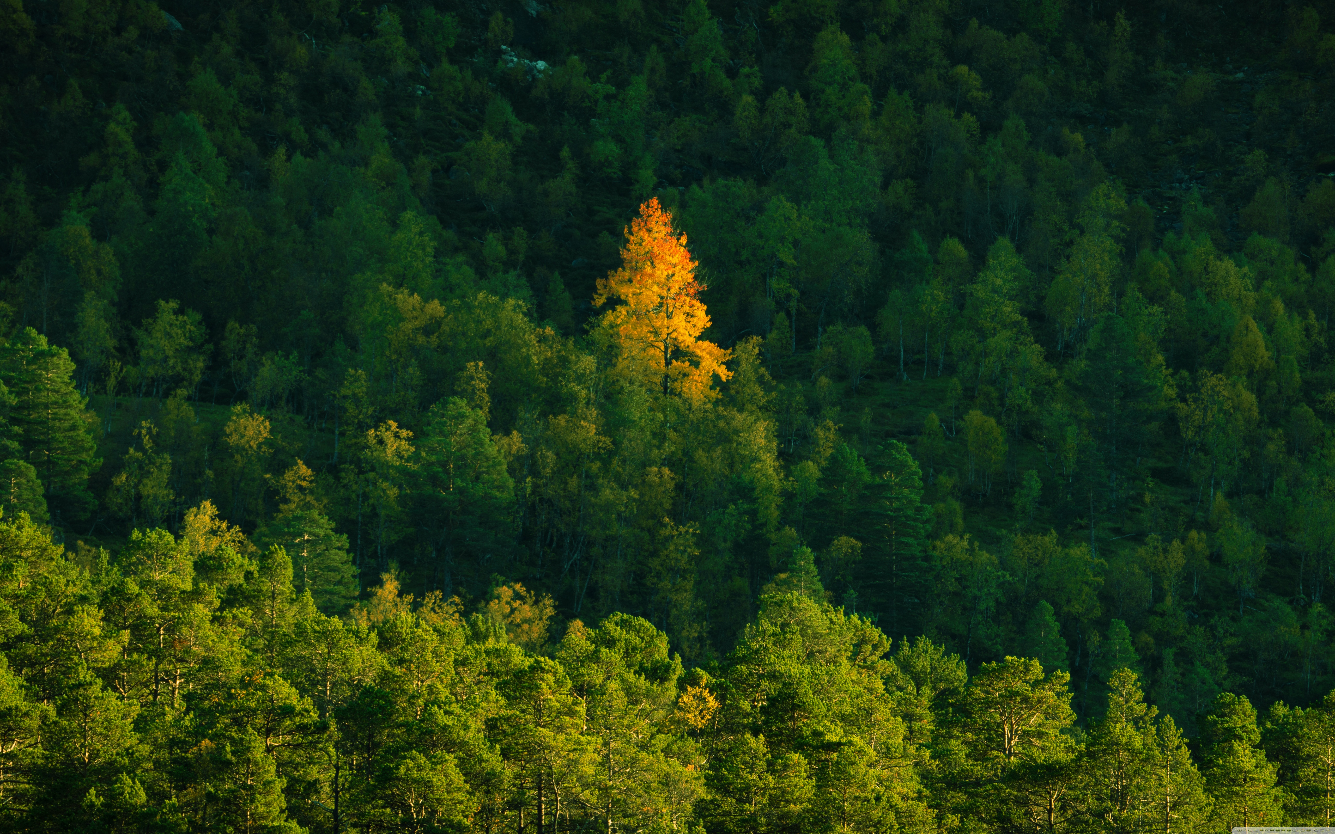 Download Yellow Birch Tree Amidst Pine Forest 4K UHD Wallpaper