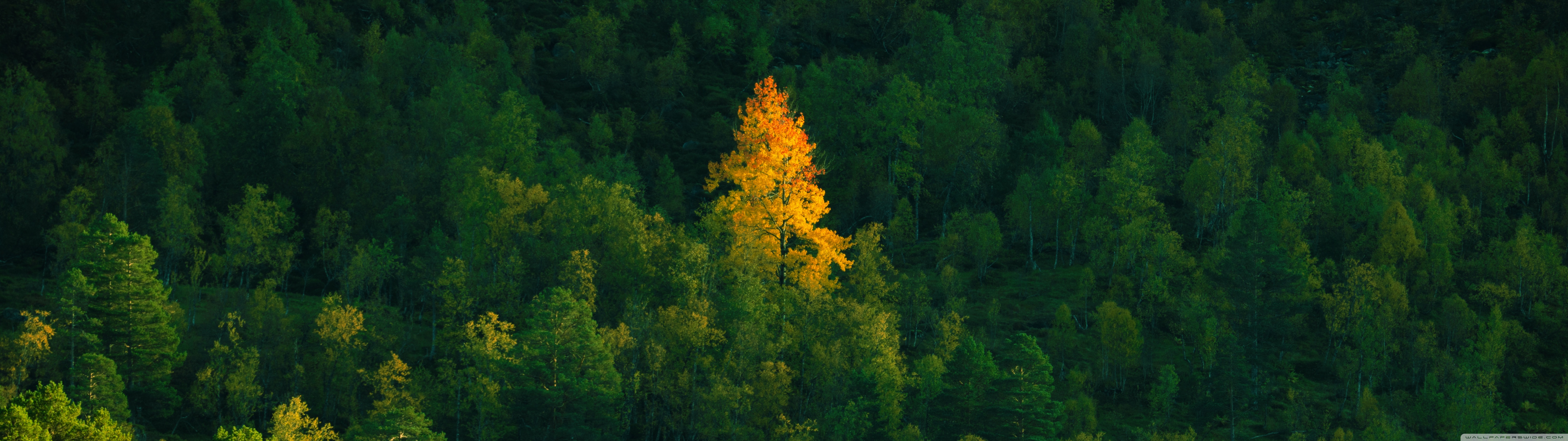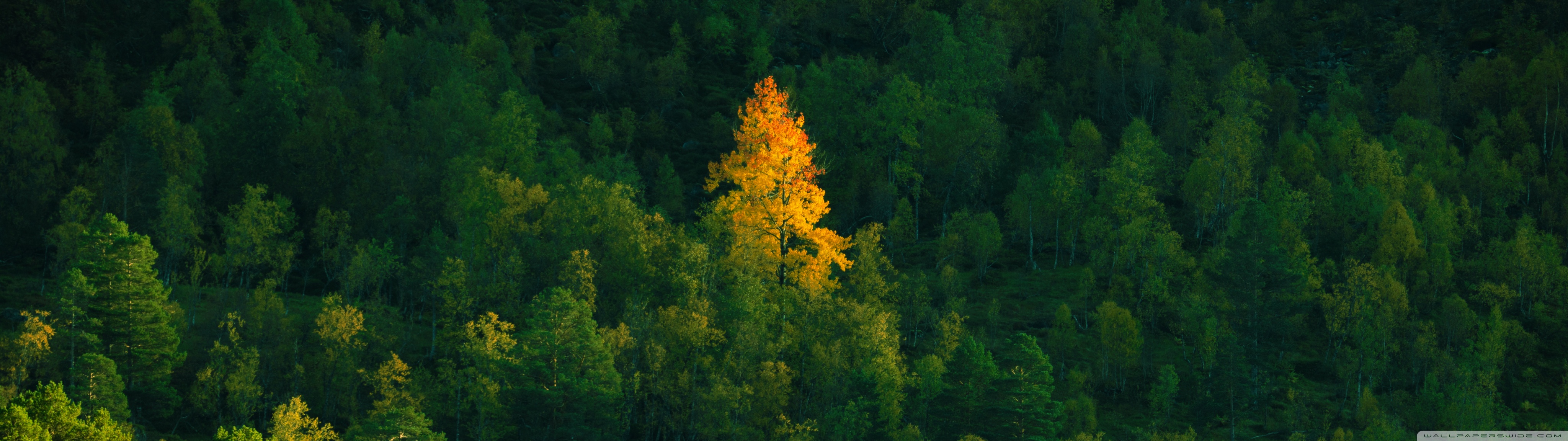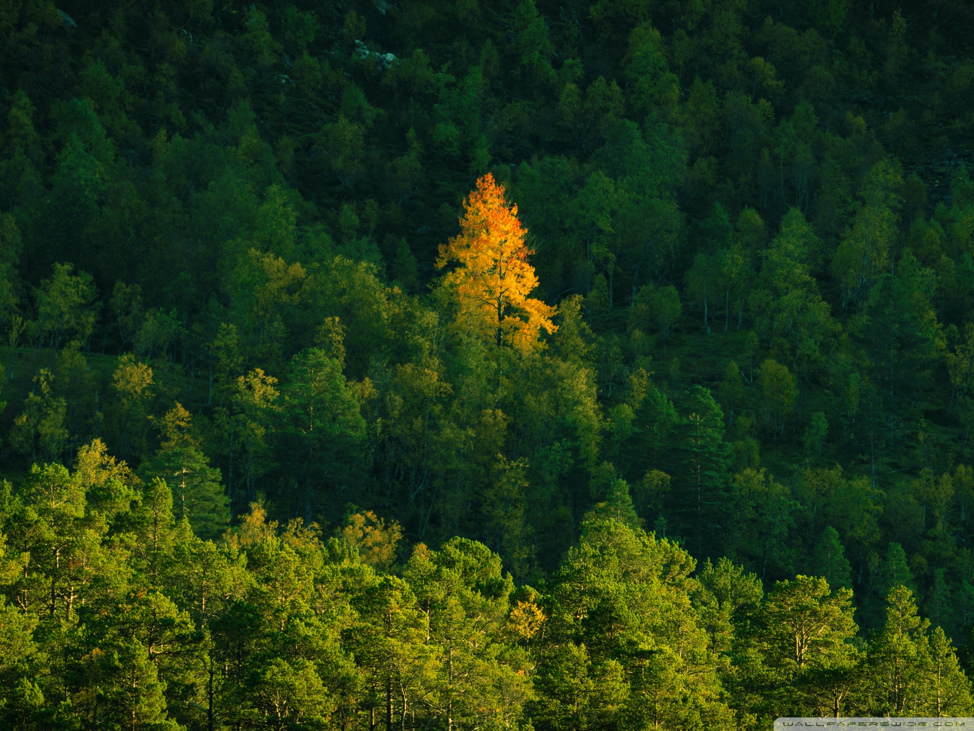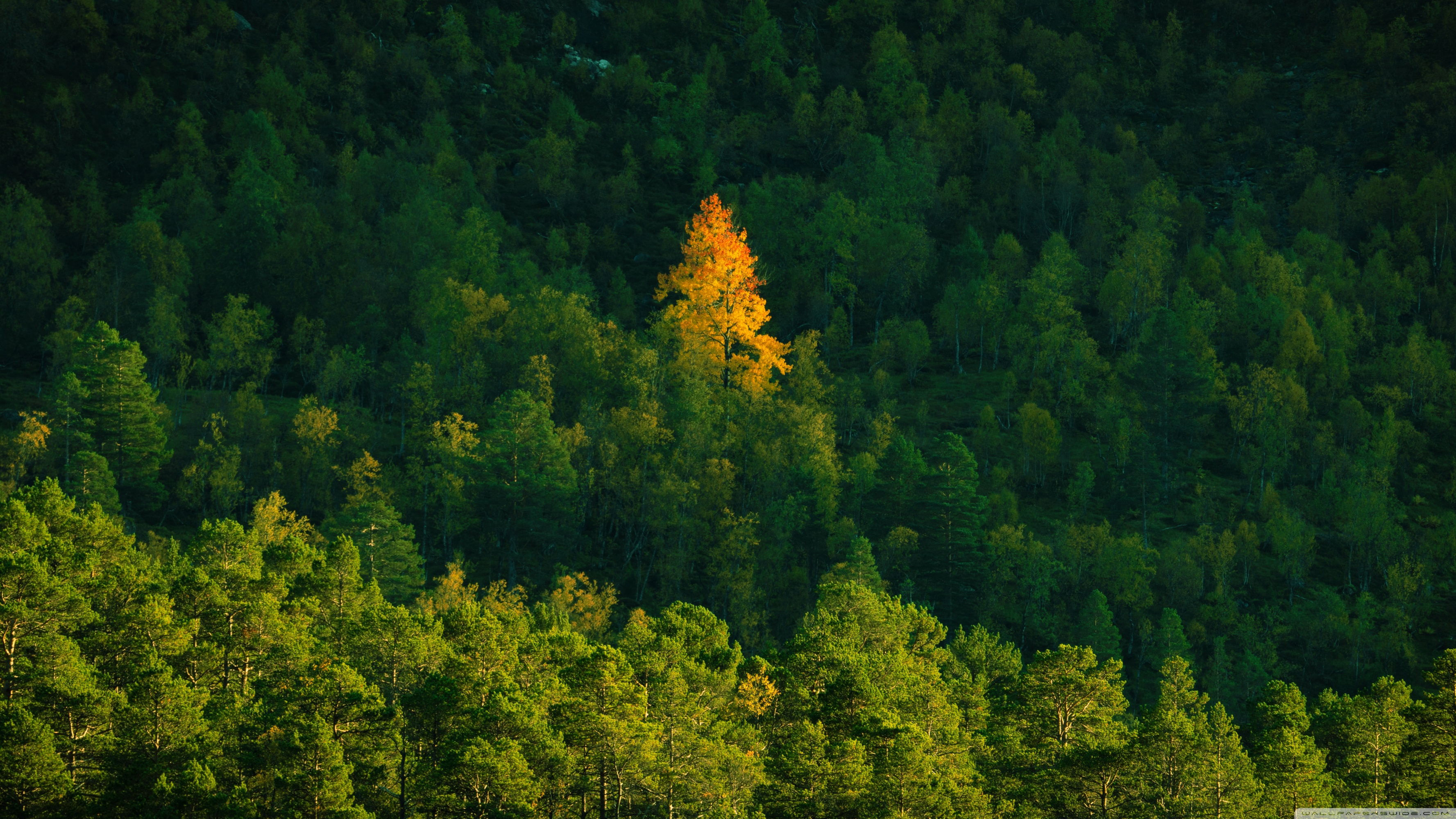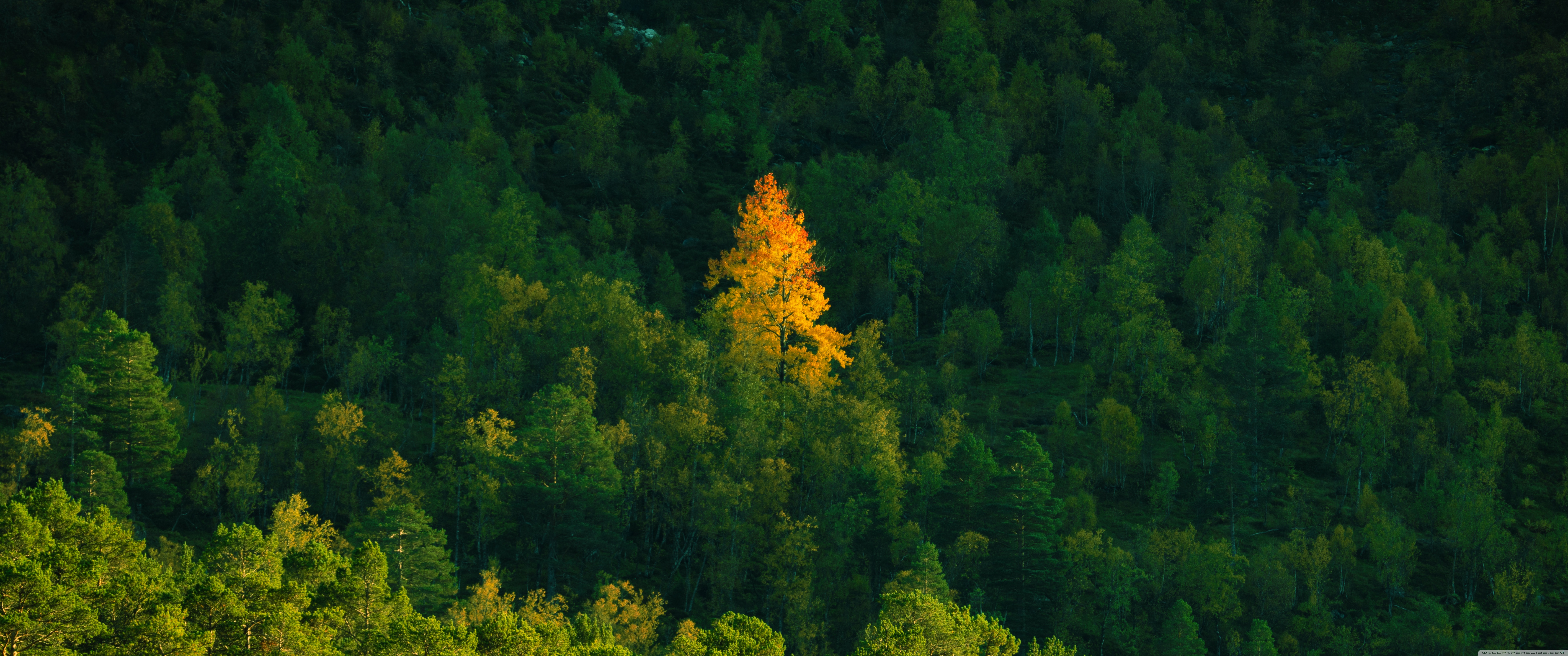 Download Yellow Birch Tree Amidst Pine Forest 4K UHD Wallpaper