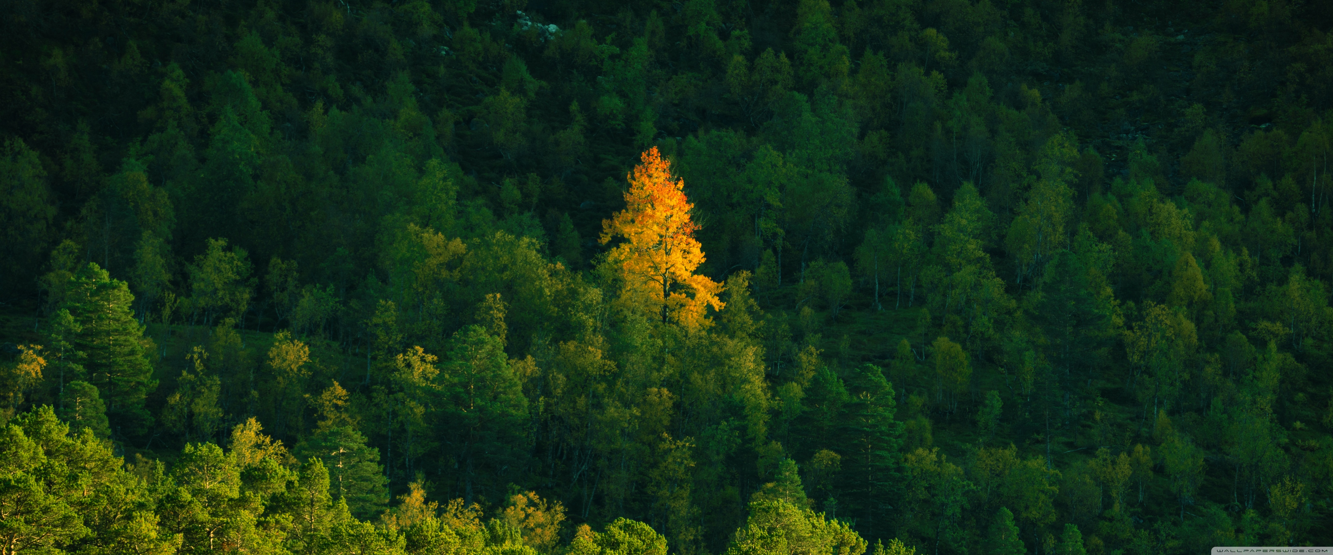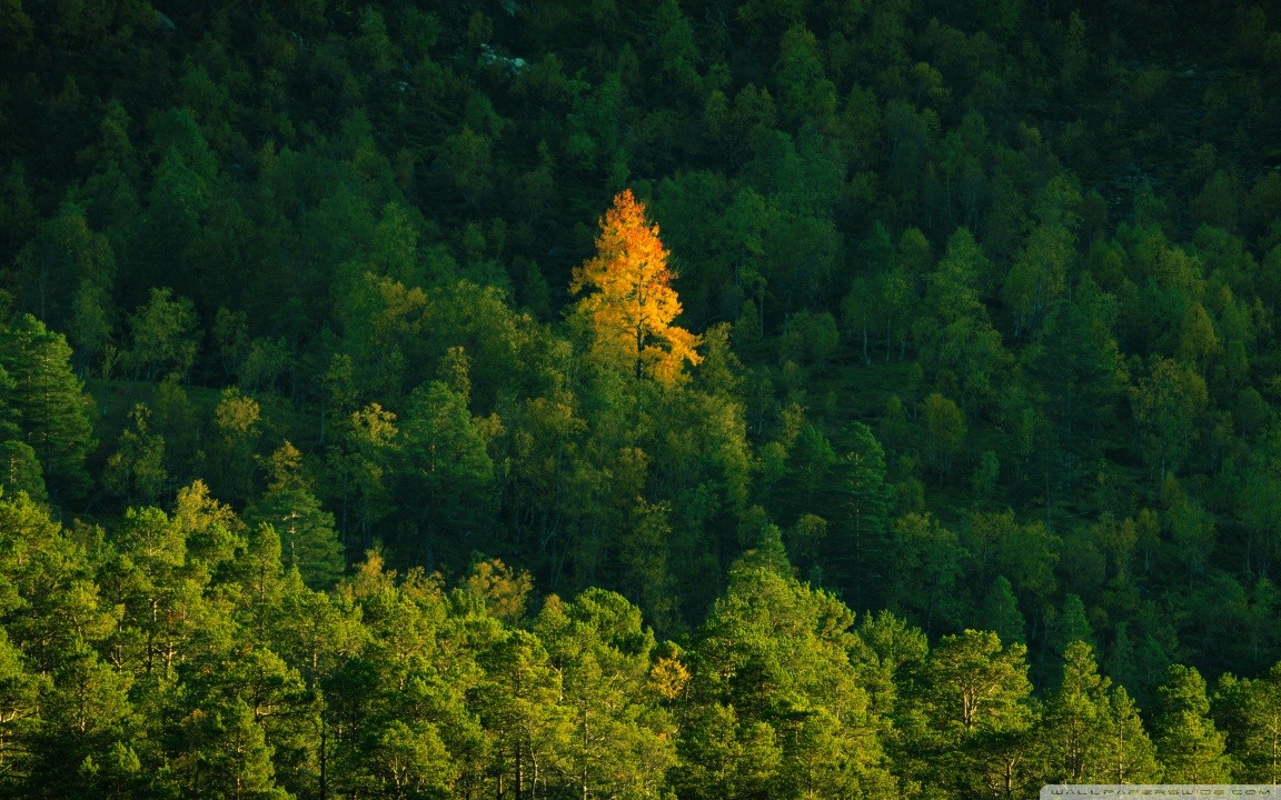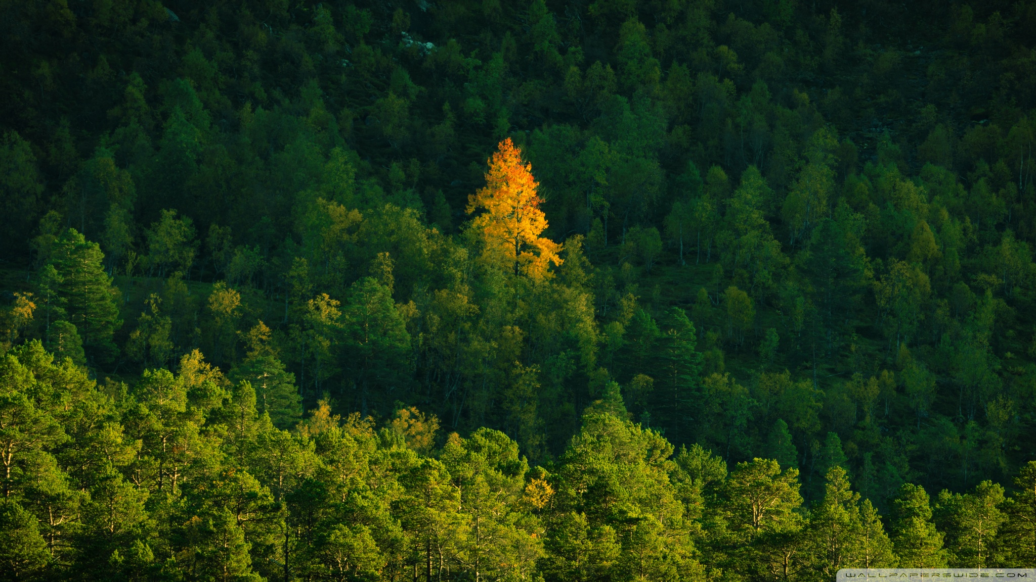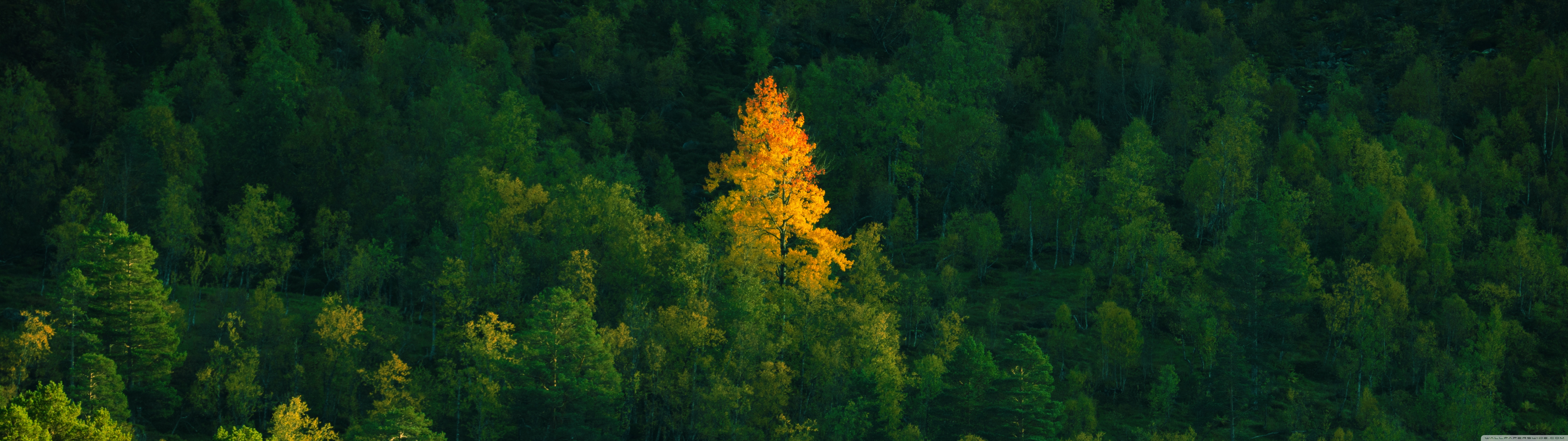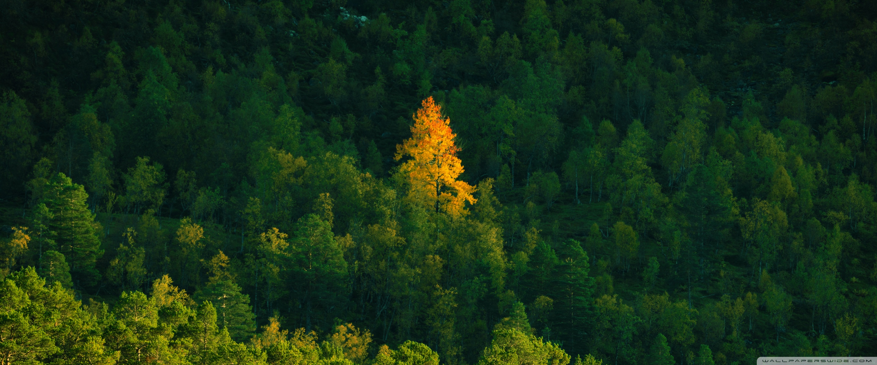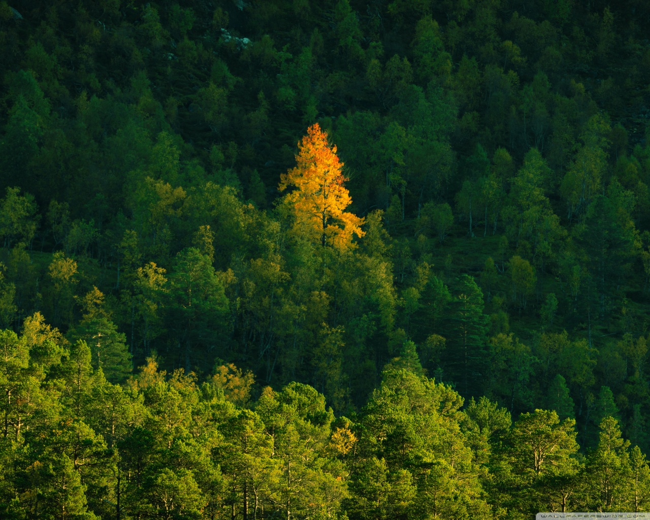 Download Yellow Birch Tree Amidst Pine Forest 4K UHD Wallpaper