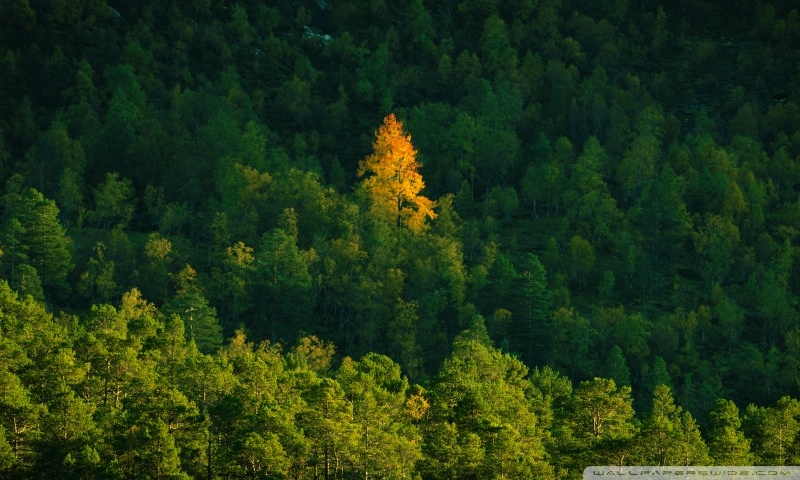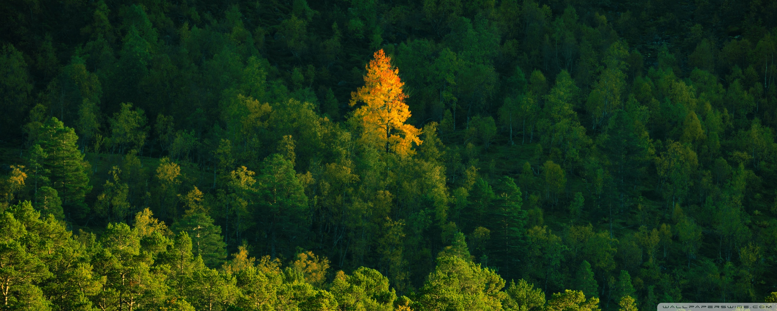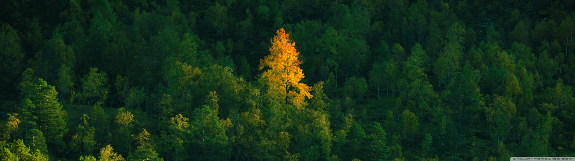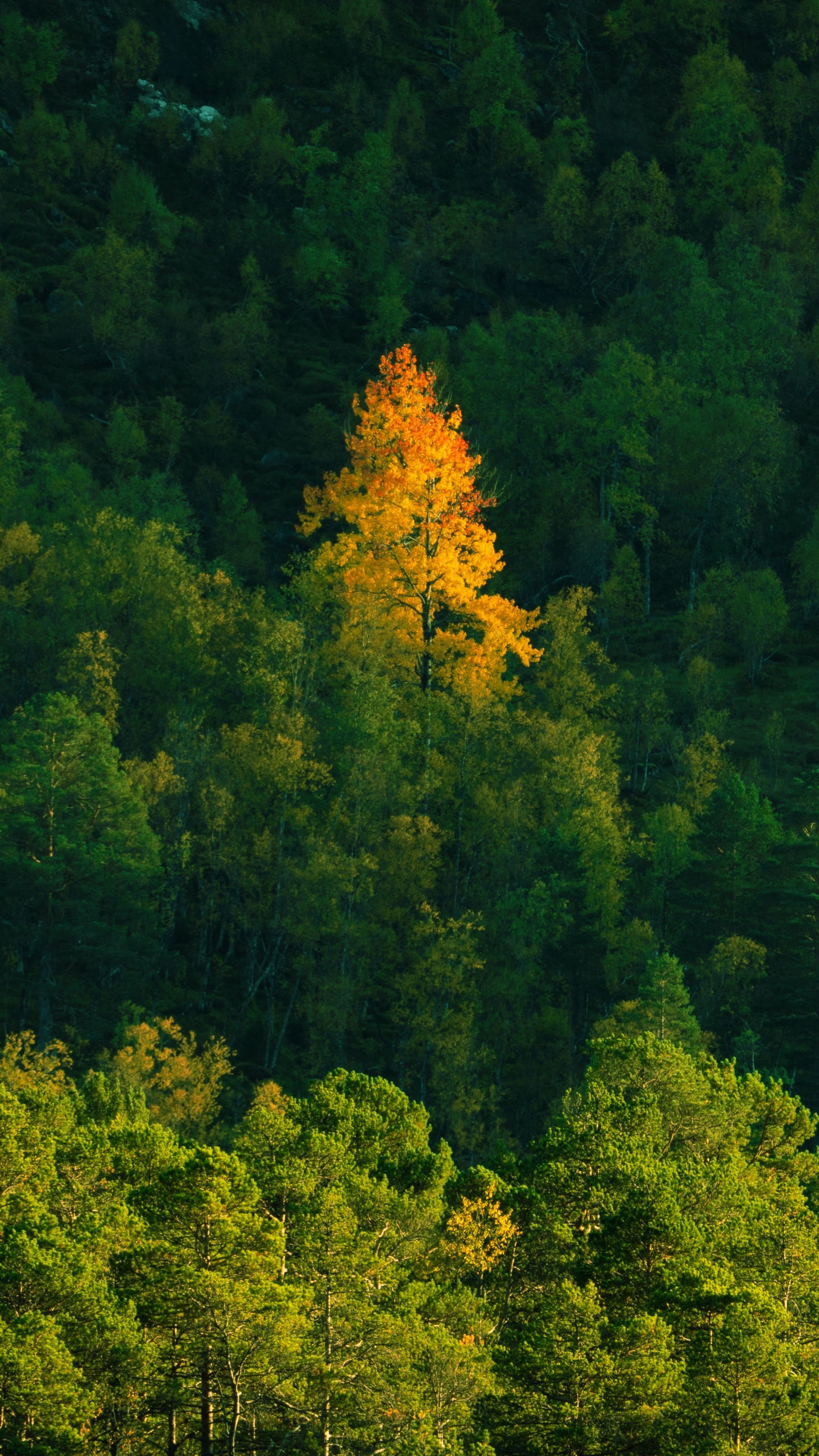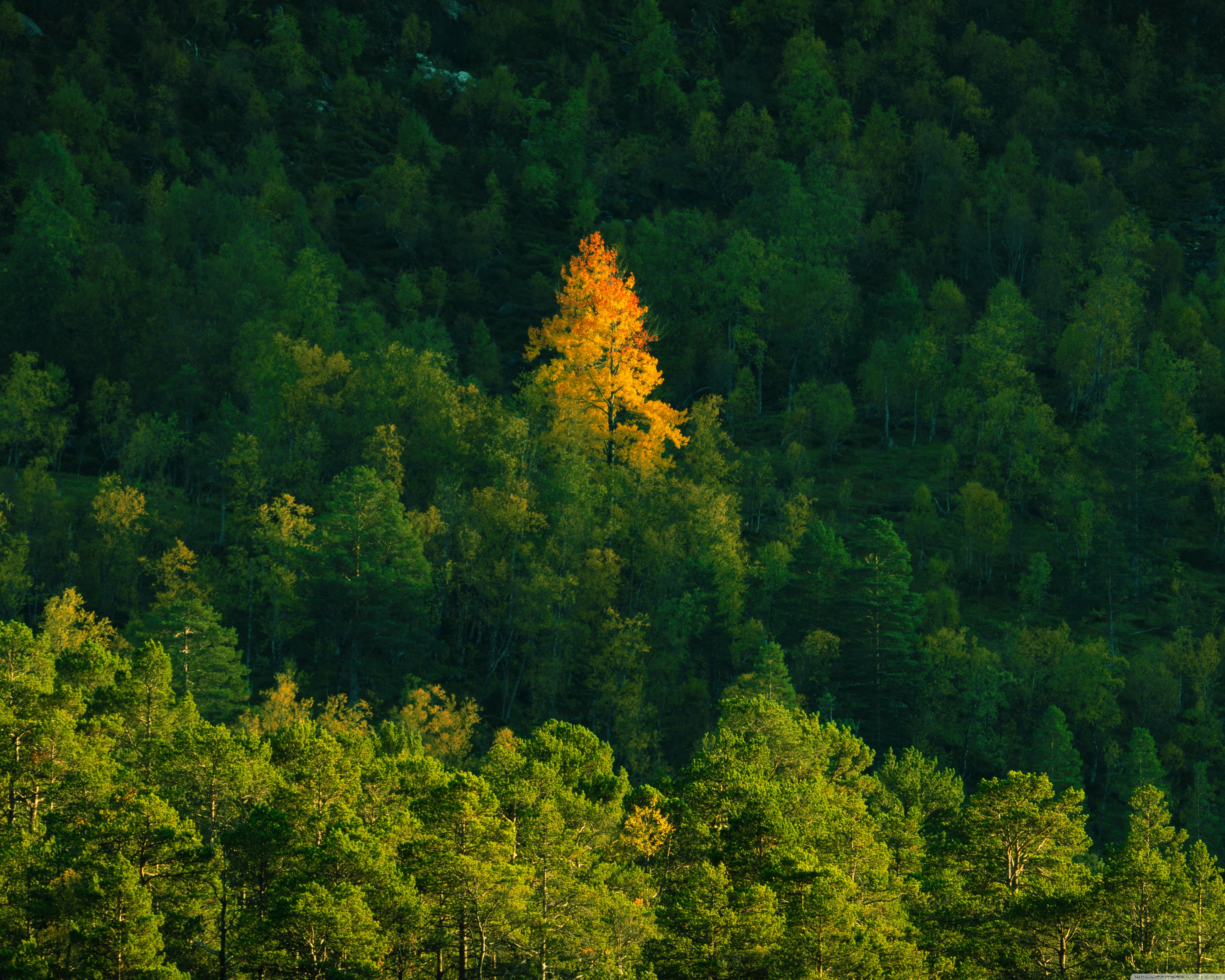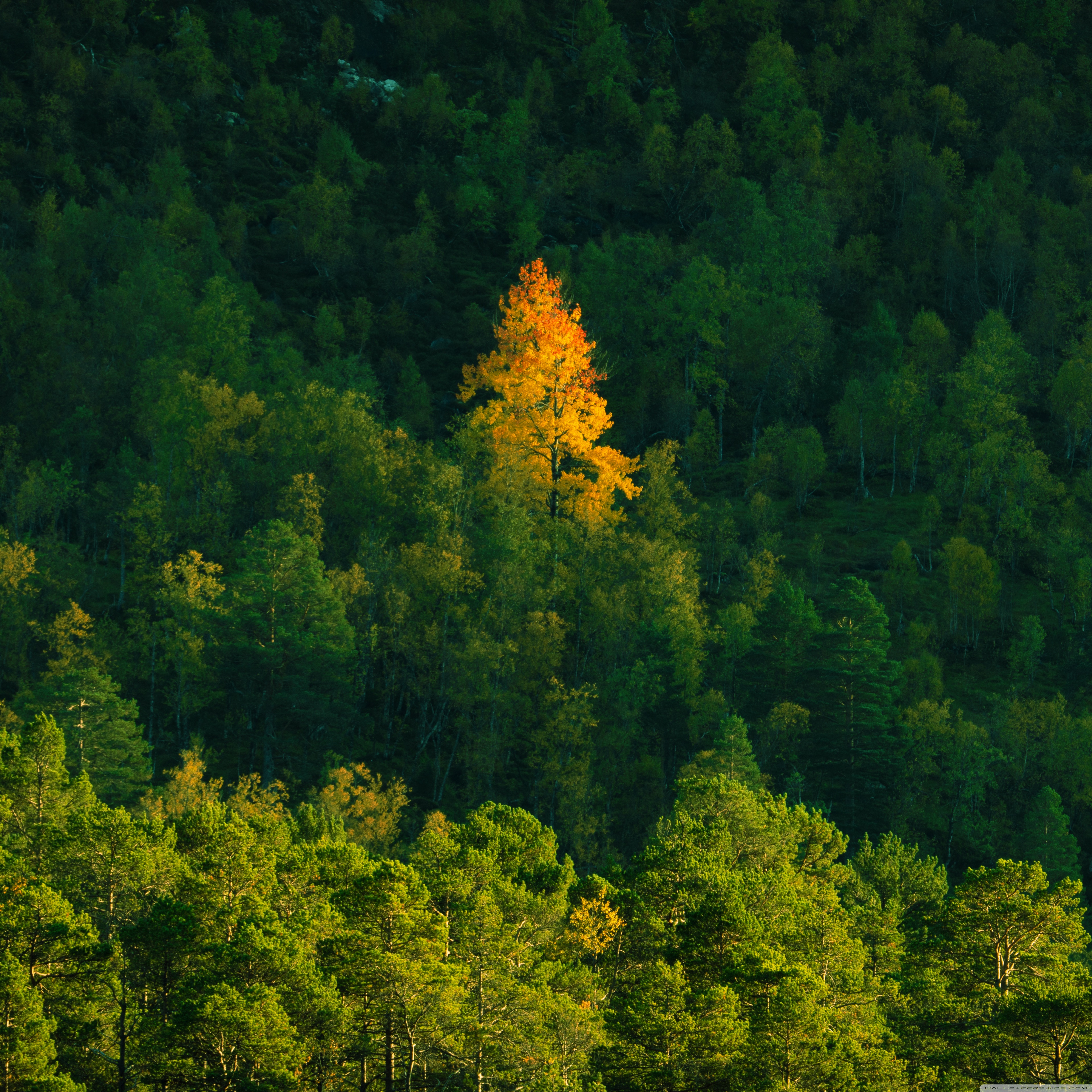 Download Yellow Birch Tree Amidst Pine Forest 4K UHD Wallpaper